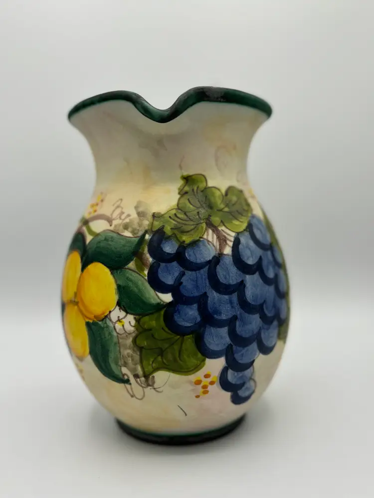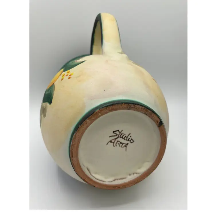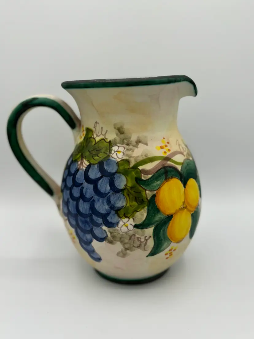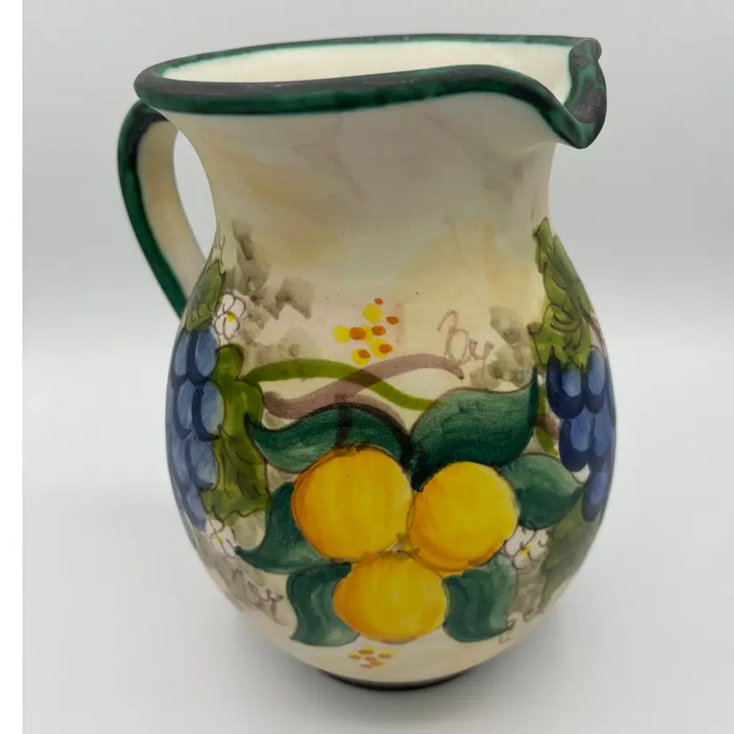 Pretty ceramic pitcher, handmade in Italy. Would be a lovely vase! No condition issues. Approximately 8”H and 7 1/2”W from spout to handle.