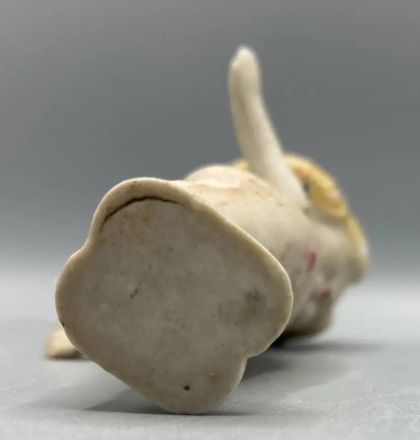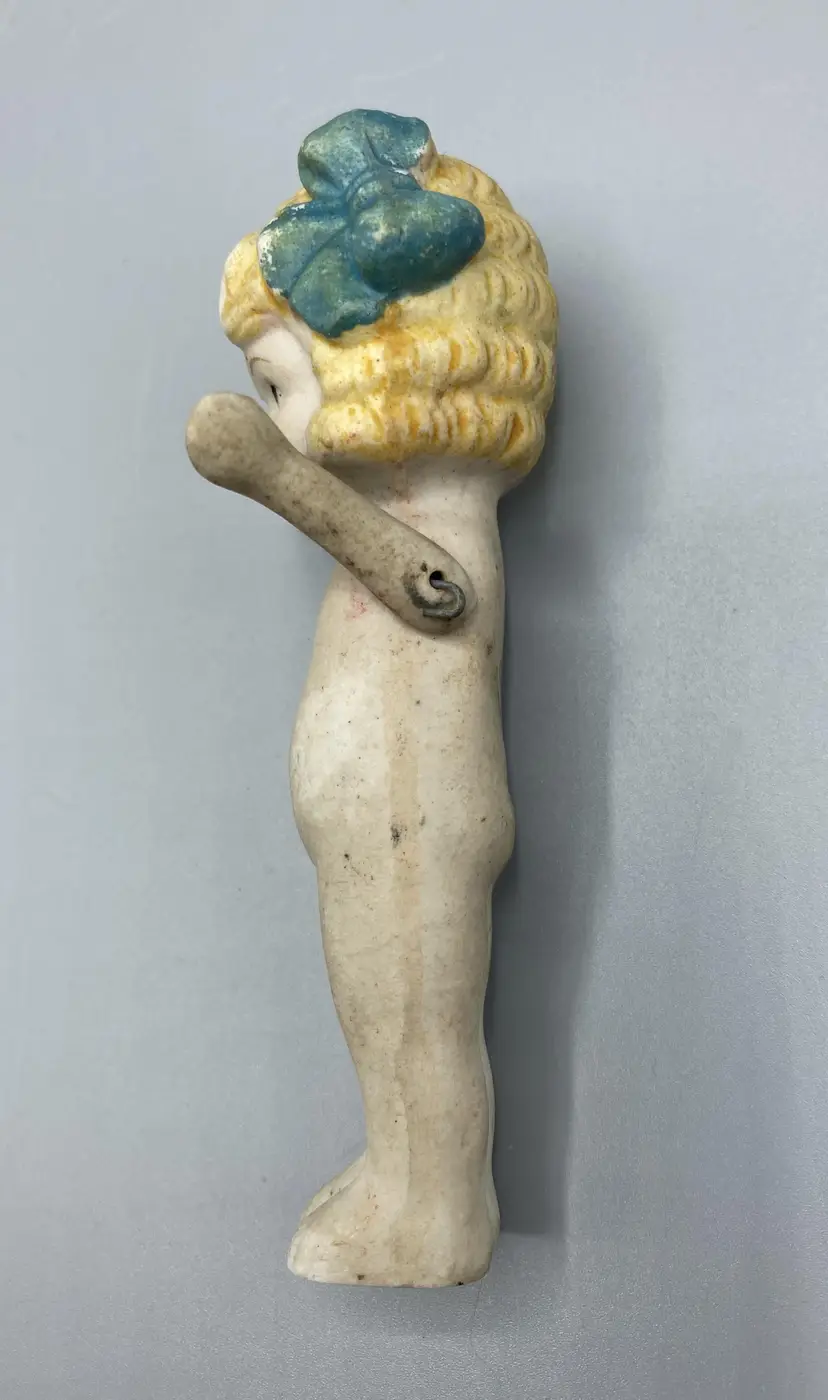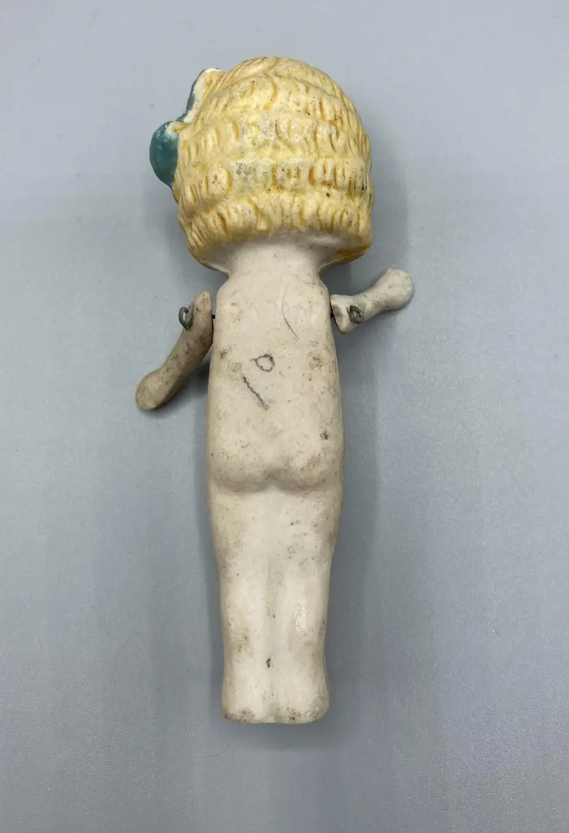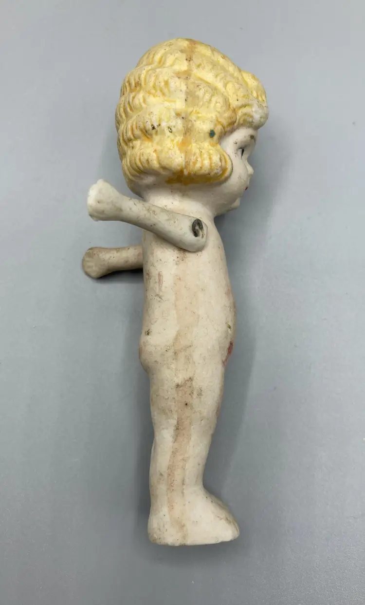 This doll is in fair condition. There are some markings all over the doll, clearly seen in pictures. I have seen this doll listed as a Kewpie or Frozen Charlotte doll, but not sure it's technically either one. This doll measures approximately 4 1/4" tall and 2" across.