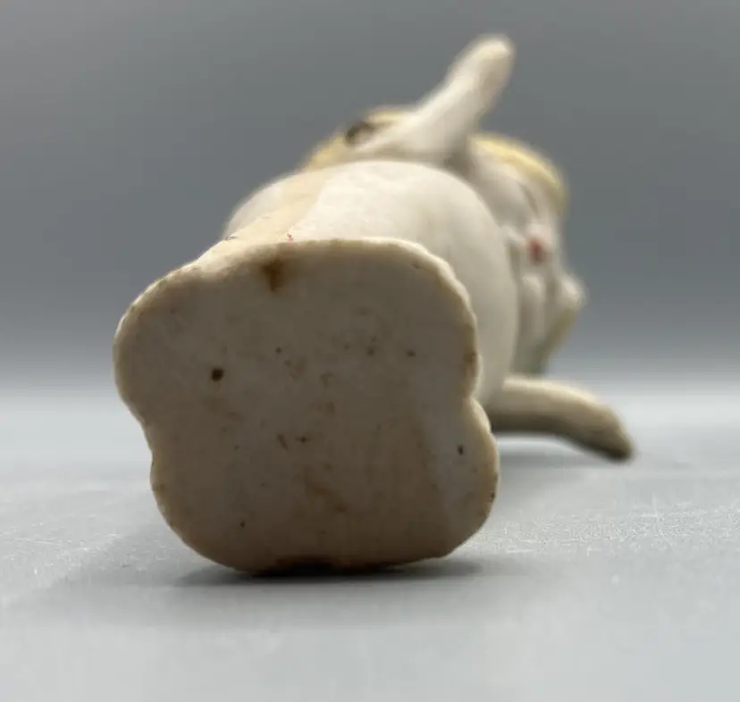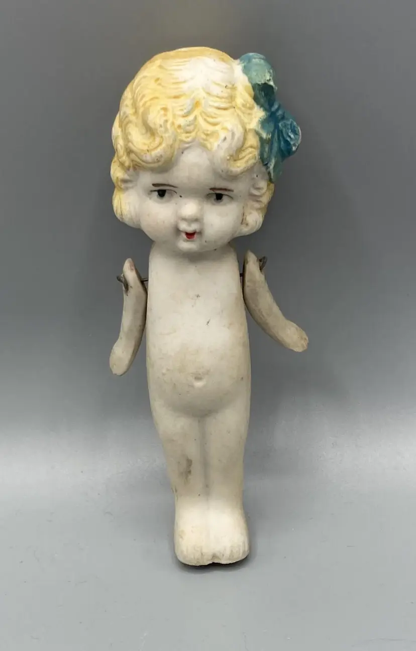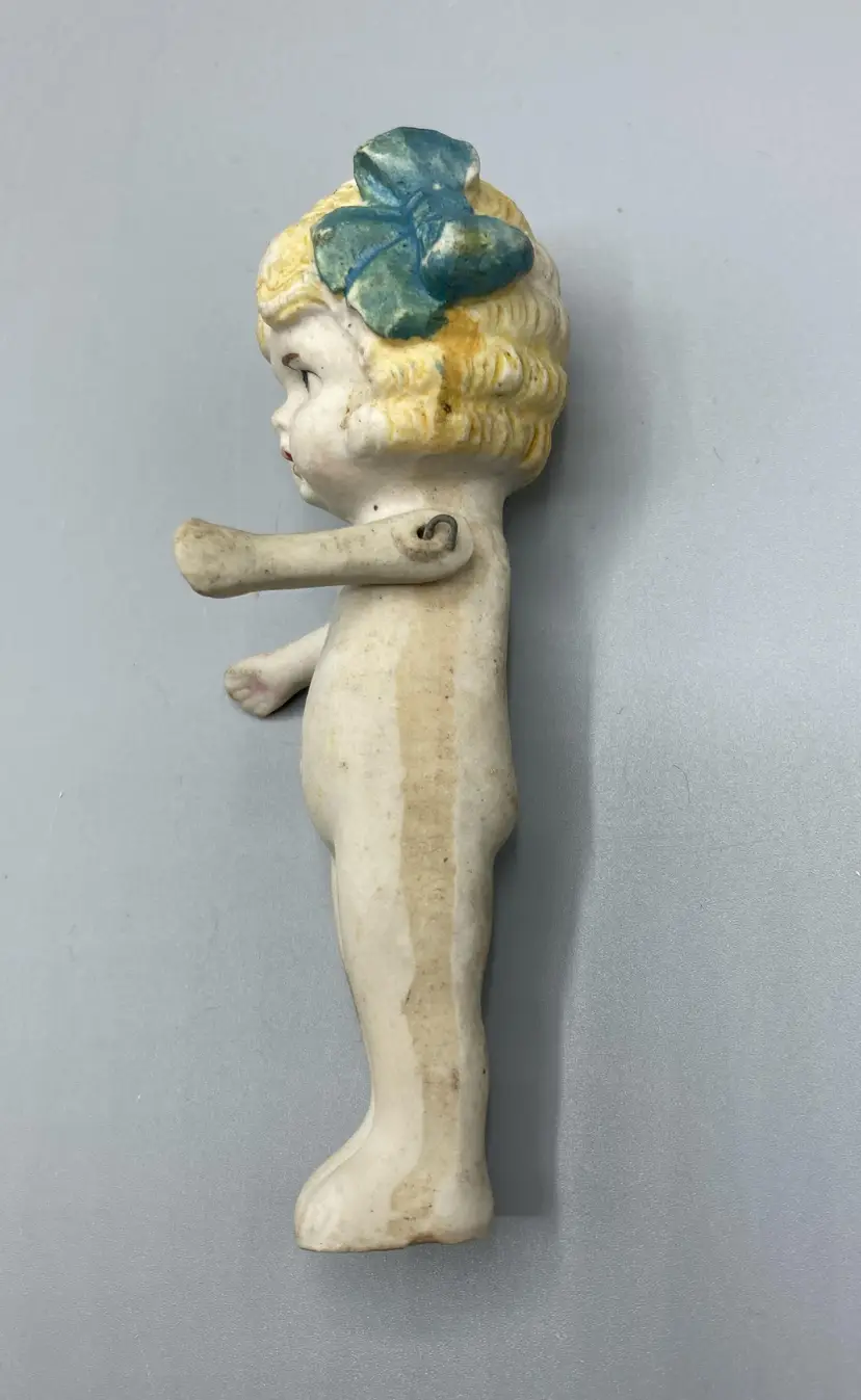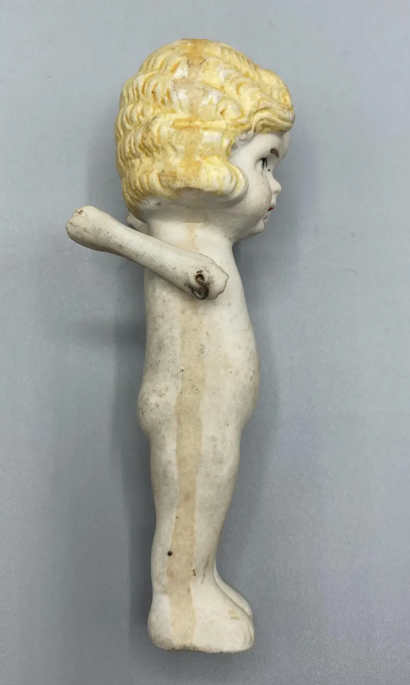 This doll is in fair condition. There are some markings all over the doll, clearly seen in pictures. I have seen this doll listed as a Kewpie or Frozen Charlotte doll, but not sure it's technically either one. This doll measures approximately 4 1/4" tall and 2" across.