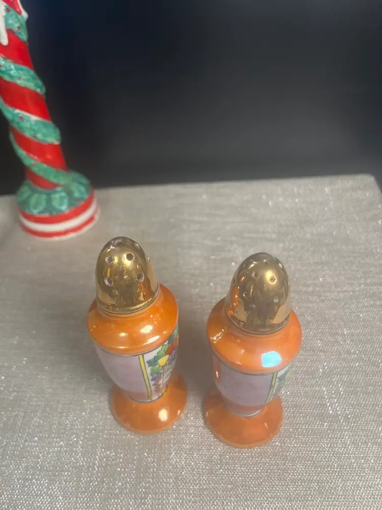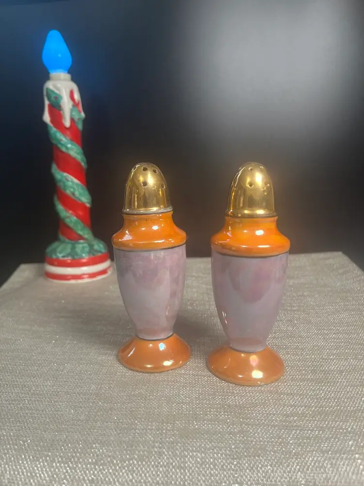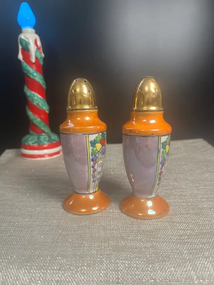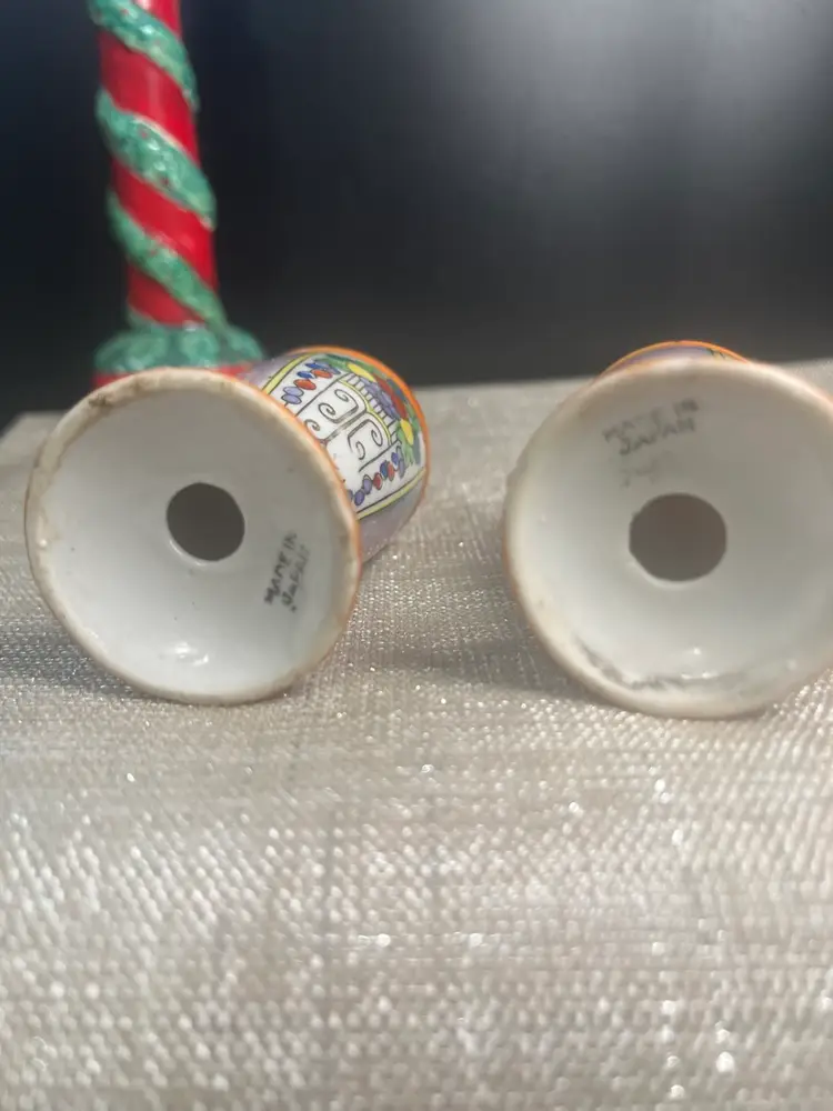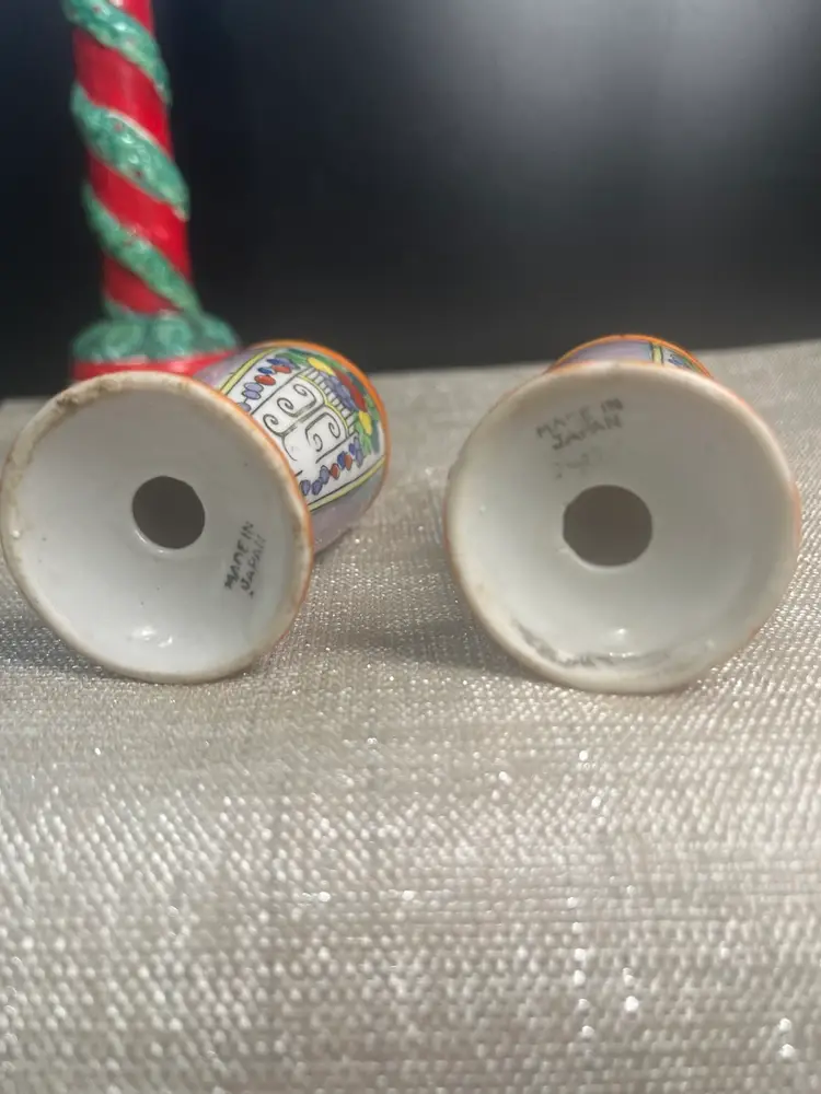 Beautiful set. The blues and purples makes me think of dyed Easter eggs. Is multi colored w/ gold paint accents. No stoppers. Marked Made in Japan on bottoms. Has very slight paint wear. Measures approx 4.5"H, 1.5" diameter at base, 4 Oz