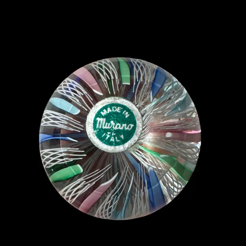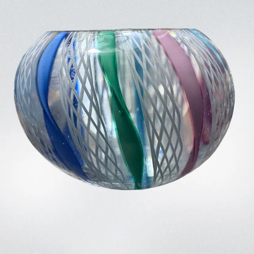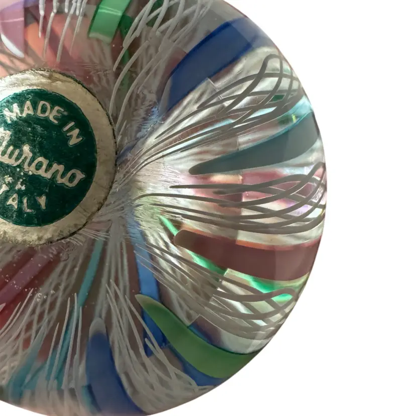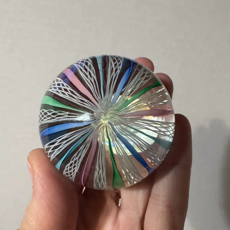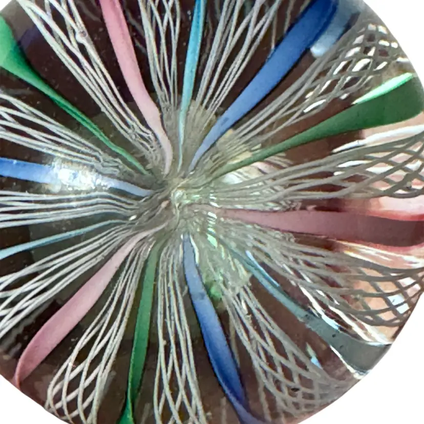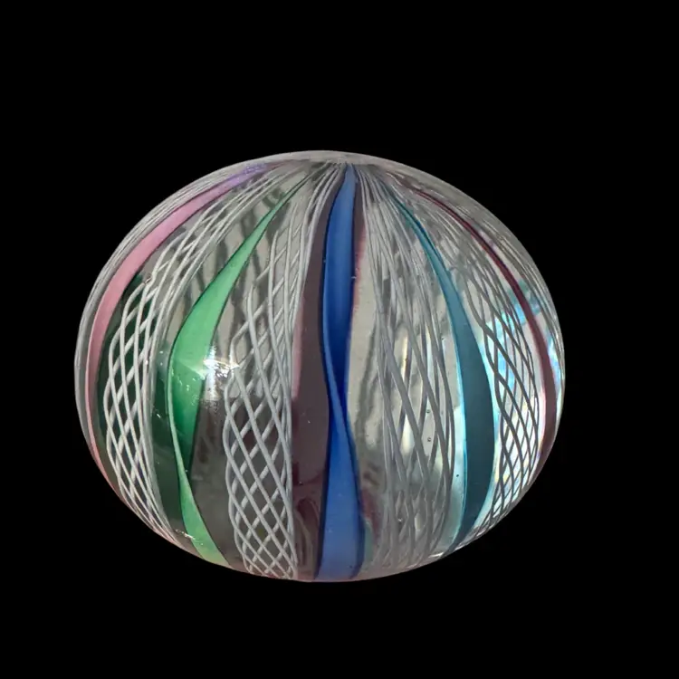 Made in Murano glass paperweight, attributed to the Fratelli Toso workshop in the style of the Venetician glassmaking techniques from the 1950s-1970s, features traditional Latticino or Zanfirico filigree lace like patterns, circus tent style alternating with white latticino with twisted ribbons in pastel pink, blue and green. 2 1/4" x 1 3/4". Excellent condition
