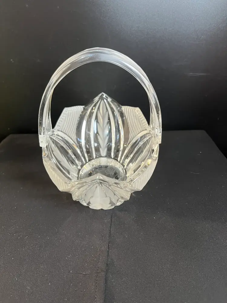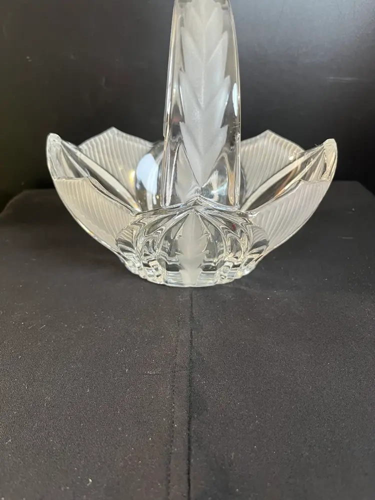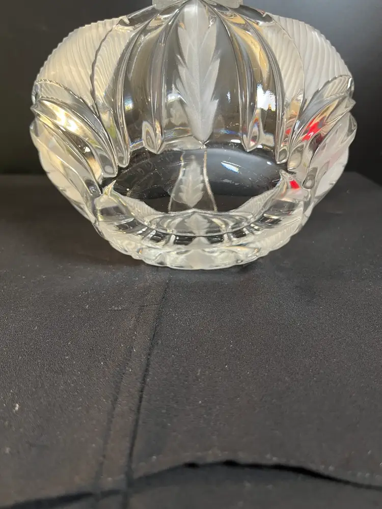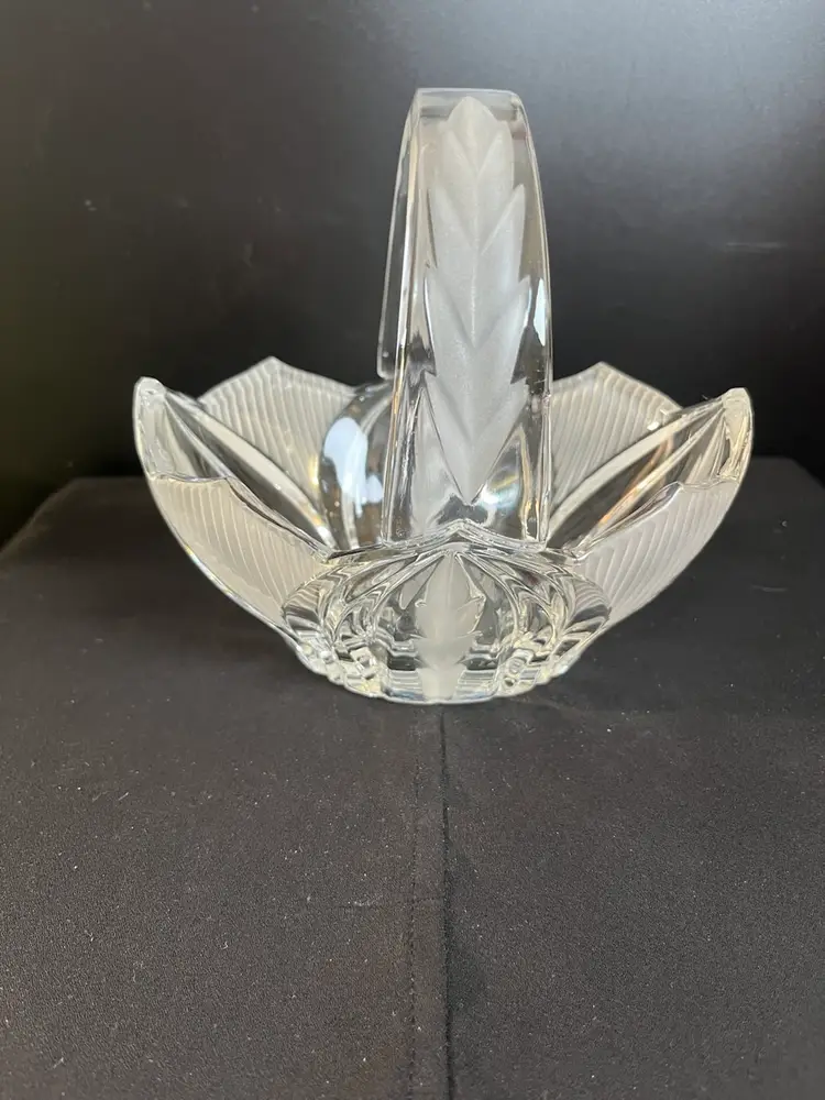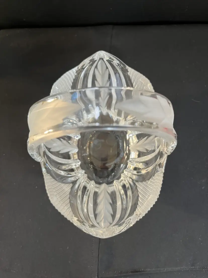 This is a lovely oval shaped frosted & clear crystal bowl w/ handle. So many neat things to do with this beauty. It measures approx 6"H, 6"L, 4.5" Deep, 1 Lb 4 Oz