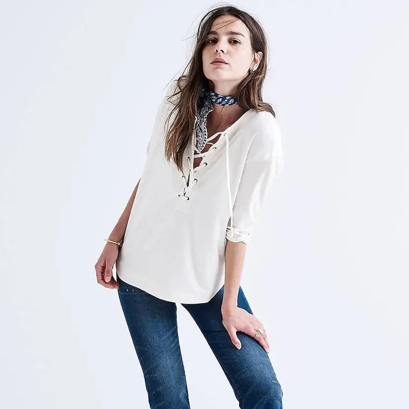 That lace-up neckline? Yeah, we're kind of obsessed too. In an easy popover shape, this one's a dream, dressed up or down.