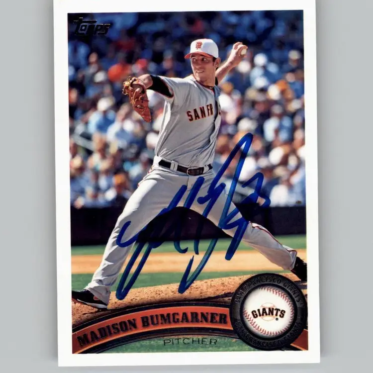 Authentic Topps baseball card featuring Madison Bumgarner of the San Francisco Giants, signed boldly in blue ink. A must-have for Giants fans and autograph collectors. Your purchase supports Signatures For Soldiers in aiding homeless and disabled veterans.