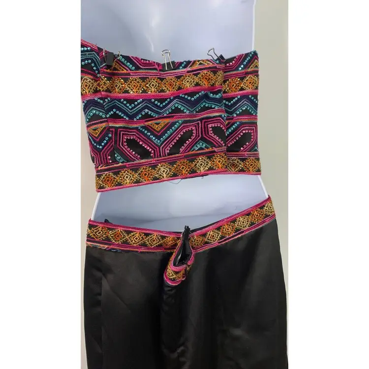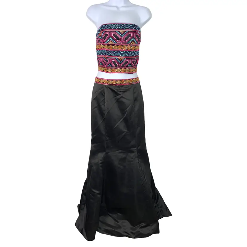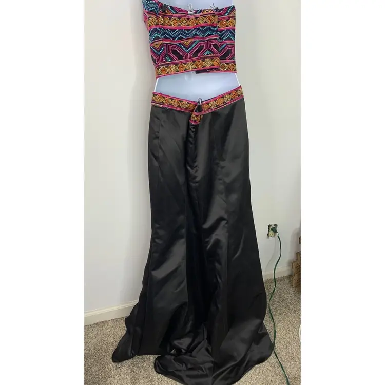 2 piece formal gown with beaded strapless crop top and full-length trumpet skirt Pre-owned excellent condition, worn once Multi-colored with black, red, purple, pink, blue