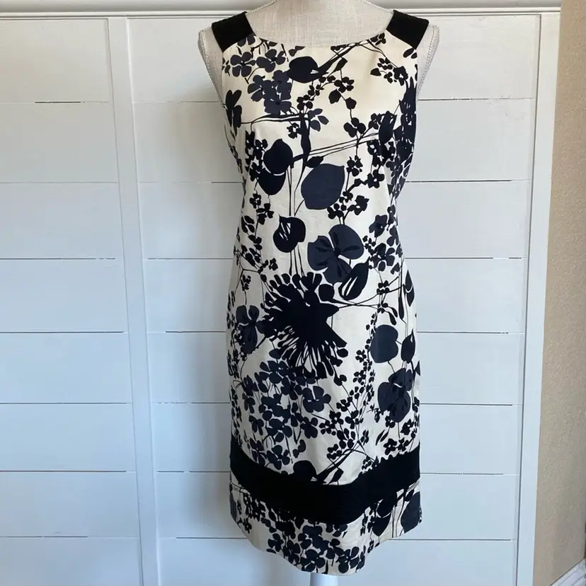 Maggy London off white and black casual floral sheath dress sz 8 This casual cute floral dress would be perfect for a day outing or evening date. Features a back zipper, fully lined. Material: Self:97% Cotton 3% Spandex, Combo: 97% Cotton, 3% Spandex, Lining: 95% Polyester, 5% Spandex RN 58142