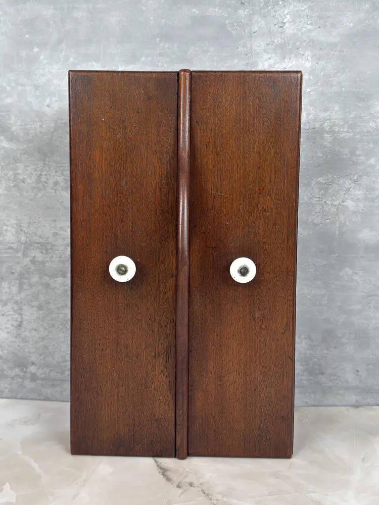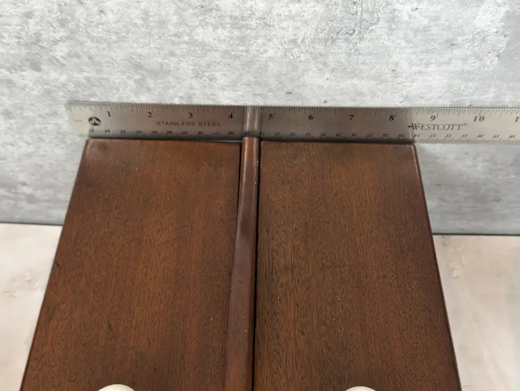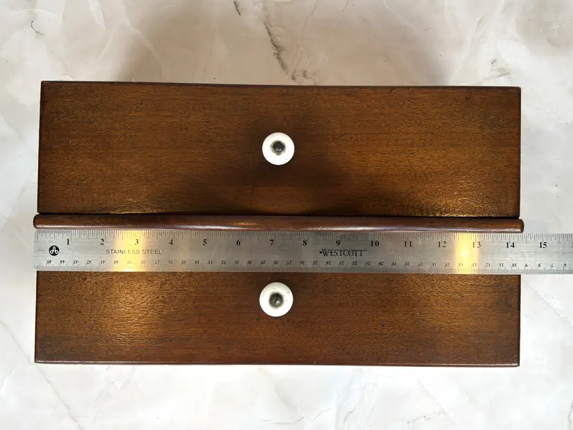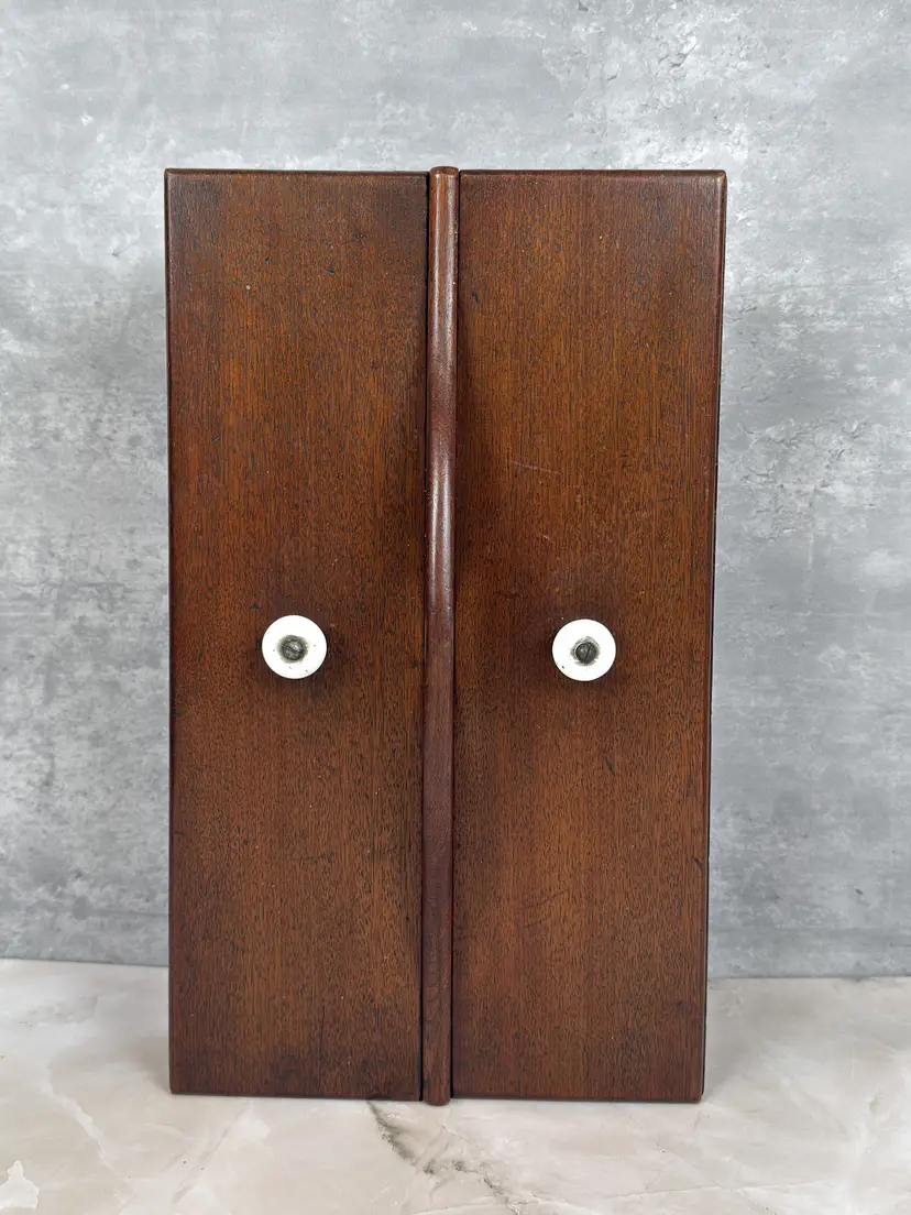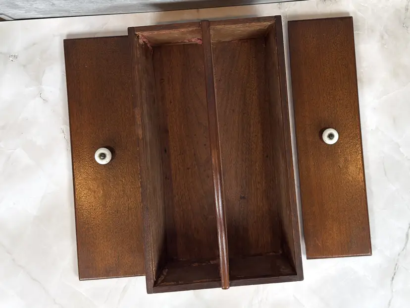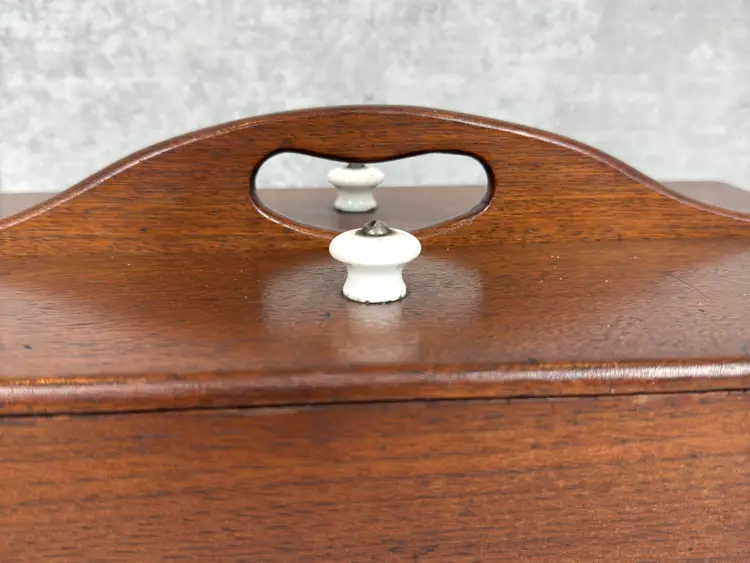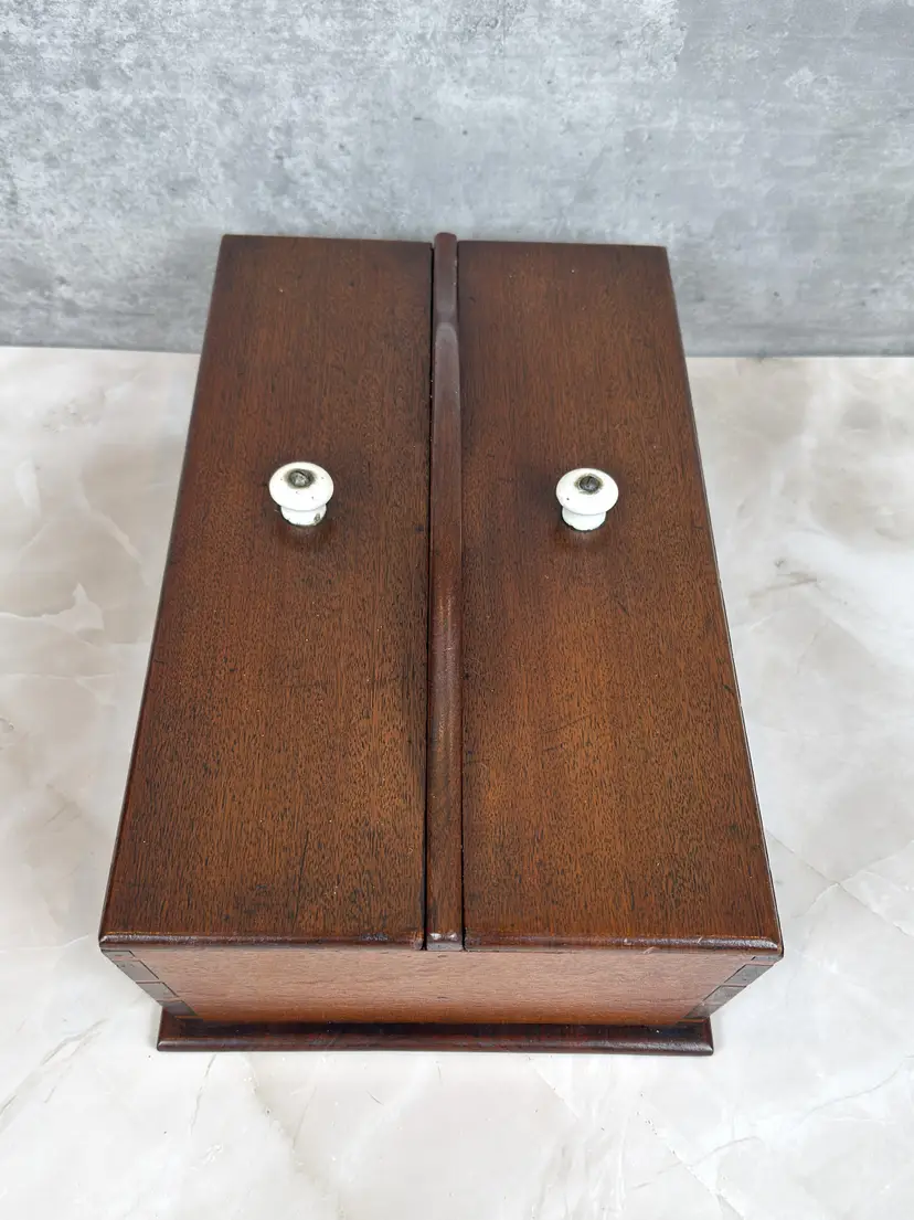 Details: • Dimensions: 14.5" L × 8.5" W × 5" H. • Weight: 3 lb 7 oz • Construction: Solid Wood with Dovetail Joinery • Lids: Two Removable Panels with Porcelain Knobs • Interior: Divided Compartments • Markings: Unmarked • Origin: Likely American • Date: c. 1930–1950 • Materials: Mahogany, Porcelain • Finish: Warm Brown Stain