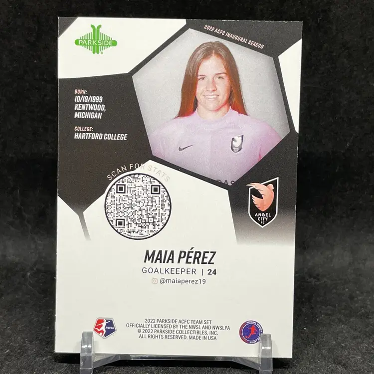 Set: 2022 Parkside NWSL Card Number: 1 Card Name: Team Set Parallel/Variety: Team Set Season: 2022 Player/Athlete: Maia Perez Type: Sports Trading Card Features: Exclusive, Limited Edition, Rookie Manufacturer: Parkside Sport: Soccer Team: Angel City Fc, Japan National Team League: National Women's Soccer League (NWSL) Autographed: No