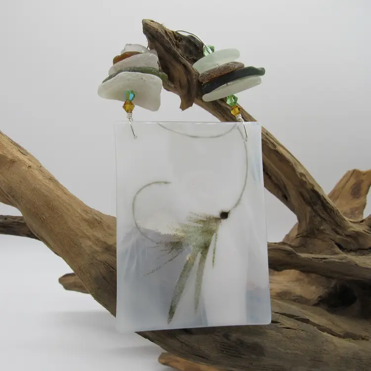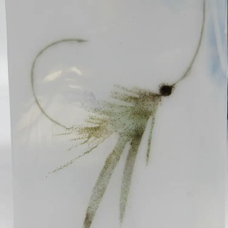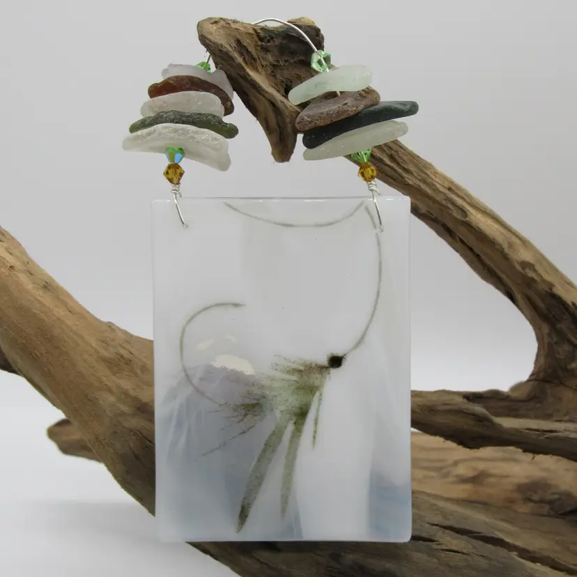 Real Maine sea glass accents this fused glass suncatcher/ornament depicting a fly-fishing lure. The glass measures 4" tall x 3" wide. The fishing lure was made using powdered glass (frit) and melting it (fusing) together in my kiln. Makes a great gift!