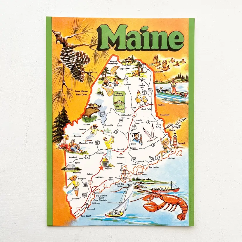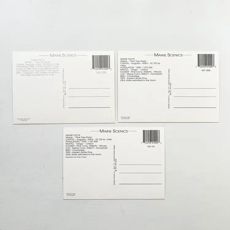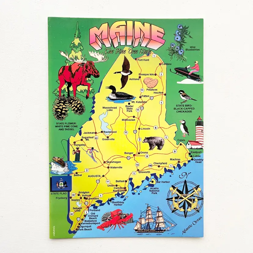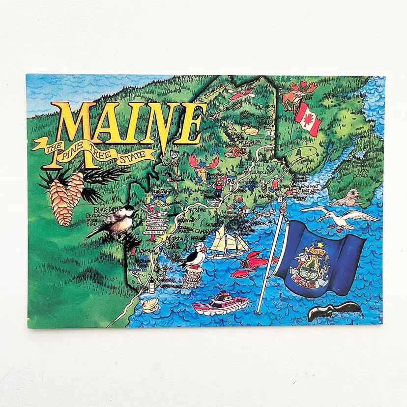 Maine State Cartoon Map Postcards Flower Bird Flag USA Vintage 1980s 1990s 3 Collectible Postcards (3 Different Postcards) 2 Printed in Italy by Litovald, 1 Printed in Germany by Argentofot Post Card Nos.: MS 528, MS 741 (Illustrated by Philip Timper), MS 1008 Maine Facts: Pine Tree State, Capital Augusta, Population 1990, Motto Dirigo, Flower Pine Cone, Animal Moose, Cat Maine Coon, Insect Honeybee, Bird Chickadee, Tree Eastern White Pine, 23rd State Admitted to the Union Maine State Highway Cartoon Map Made in USA Condition: Unused. Wear around the edges and on the corners. Measures 6 inches x 4 inches Packaged in a plastic sleeve inside a rigid envelope Visit my store to see more vintage ephemera, advertising, novelties, gifts, estate sale and yard sale finds https://district.net/u/finderspickerspaper SKU B19