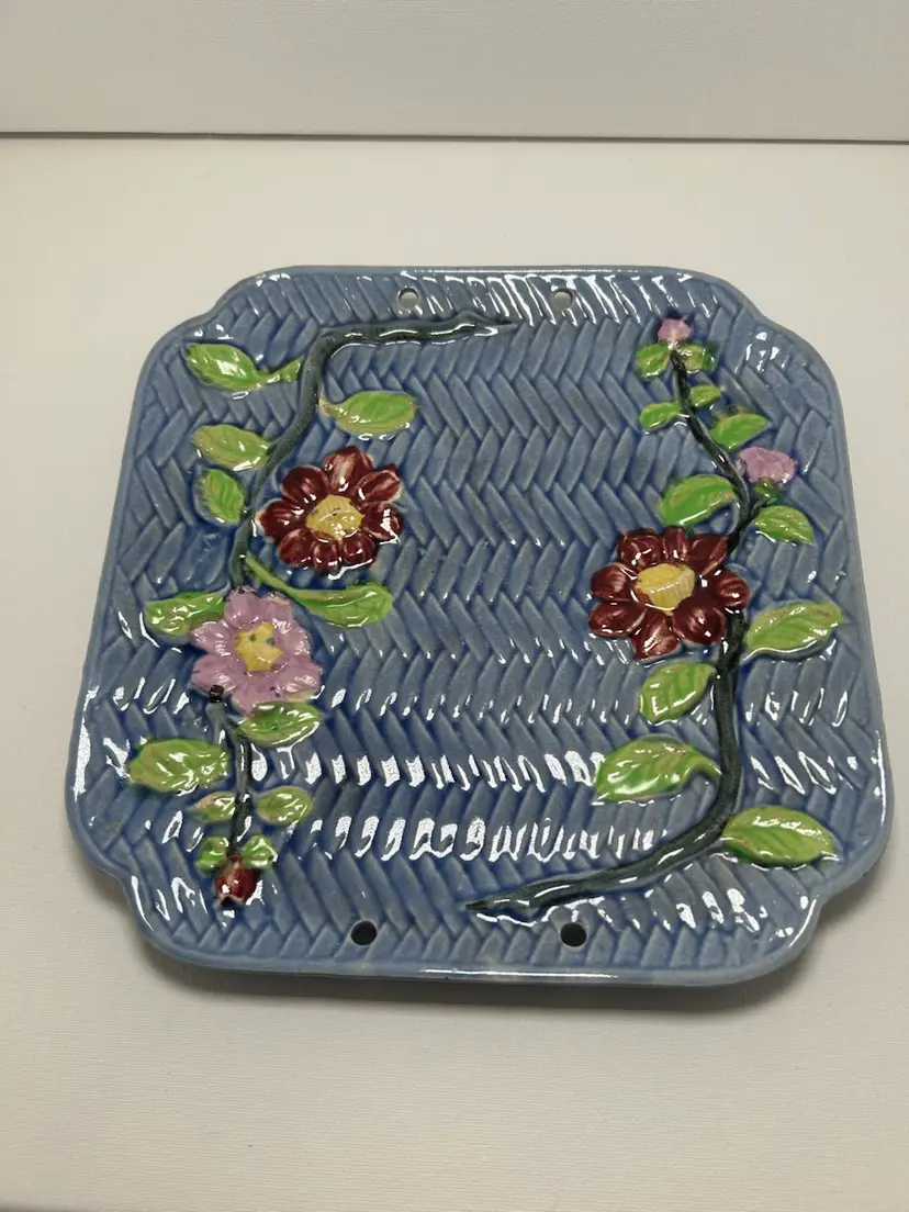 Square wall plate with basket weave and morning glory. Marked from Japan.