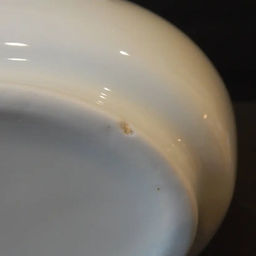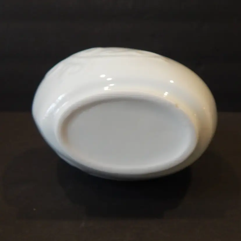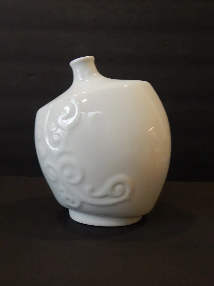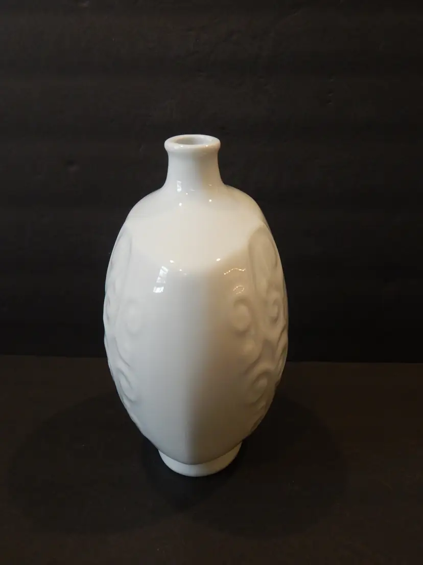 This is a Majolica style tilted vase/bottle with Chinese letters and an embossed filigree design. The vase is 8 inches tall and 7 inches wide. It has a white tin glaze that makes it look like Majolica. This vase is in EXCELLENT CONDITION, with no scratches or cracks. There is one tiny chip on the bottom (see last photo) that is invisible when the vase is standing.