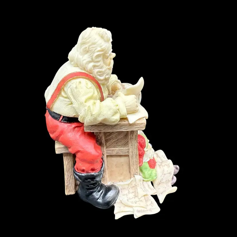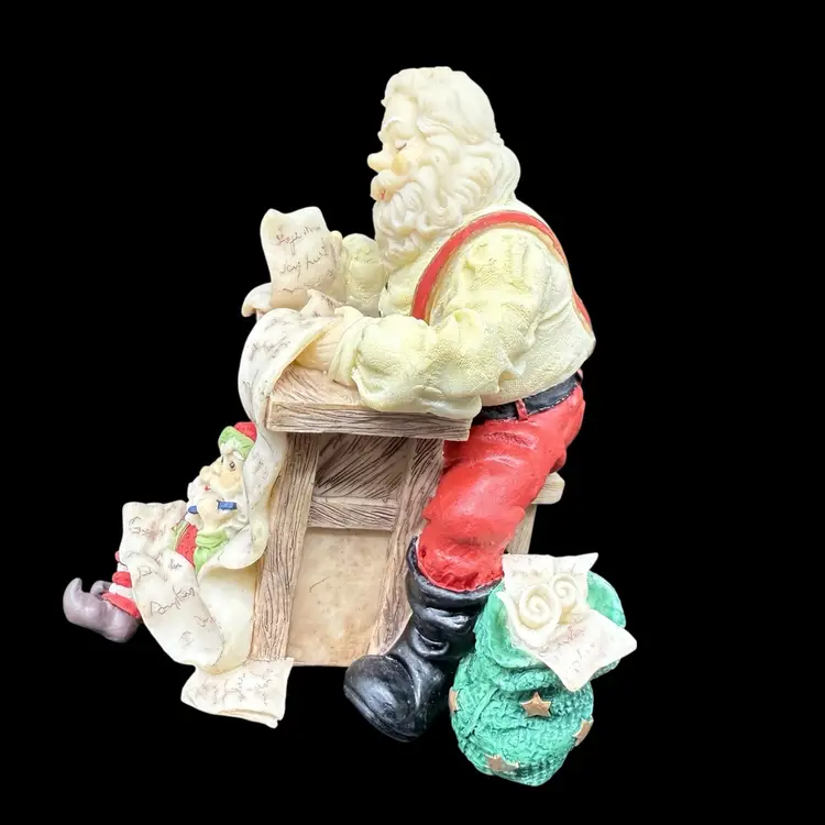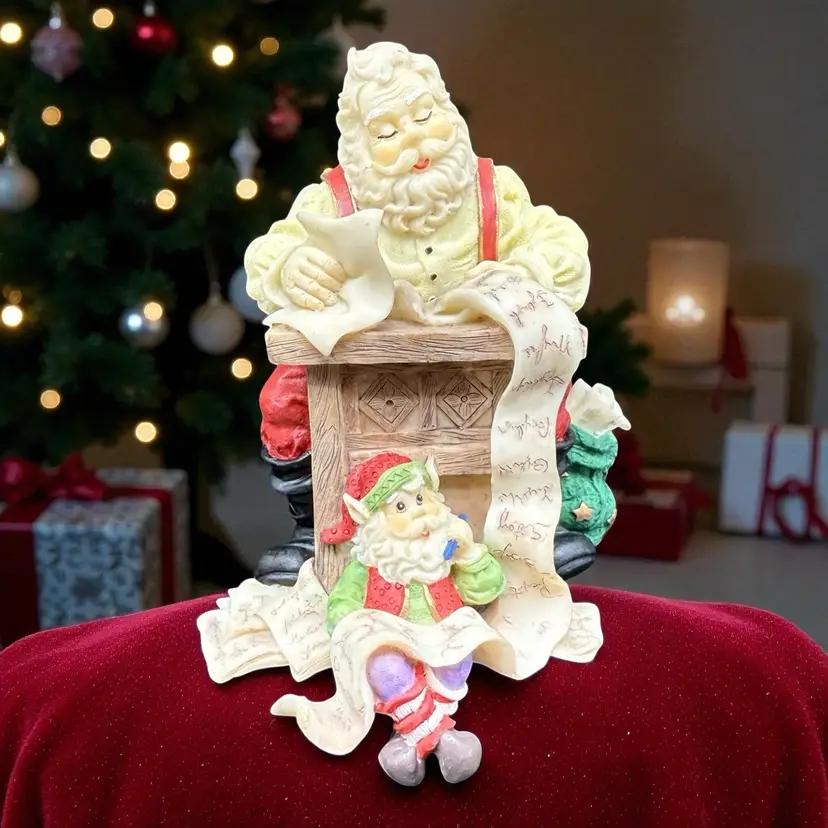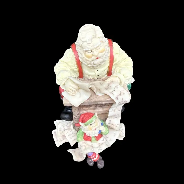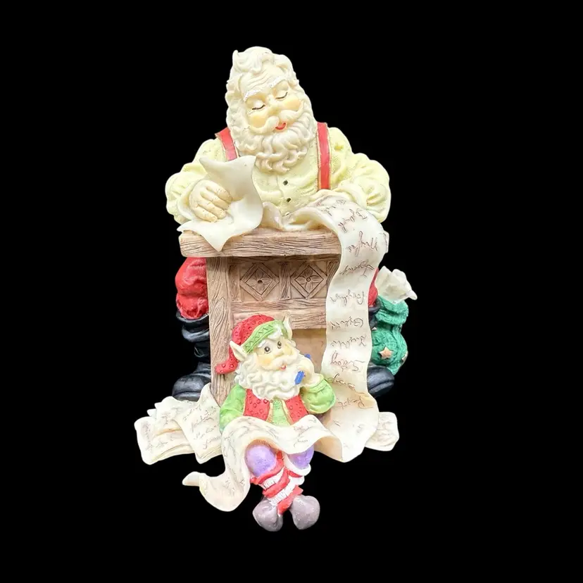 This Santa Elf Figurine Stocking Hanger is a festive addition to your Christmas decorations. Made of resin and featuring a traditional style, this multicolor figurine depicts Santa and his helper elf looking over his naughty and nice list. The little elf feet hang below the shelf, and would be ideal to hang a small stocking from. Perfect for adults, this holiday collectible embodies the spirit of Christmas with its painted finish and seasonal theme. Display it proudly on your mantle or shelf to bring a touch of magic to your home during the holiday season.