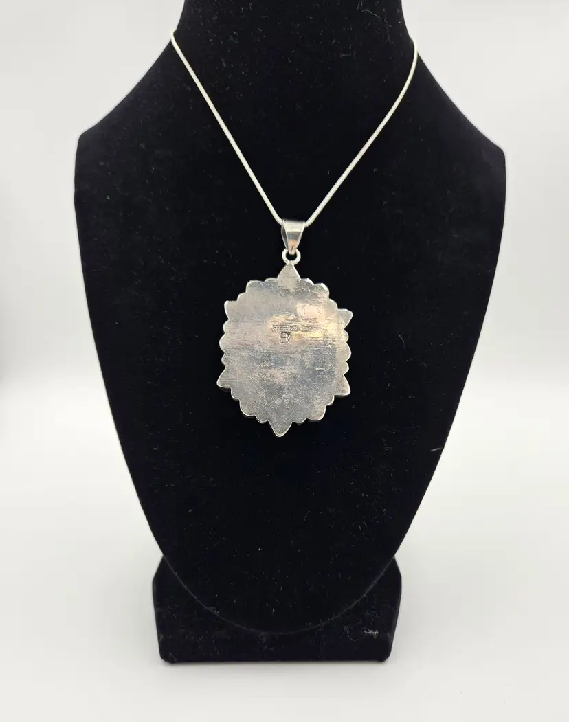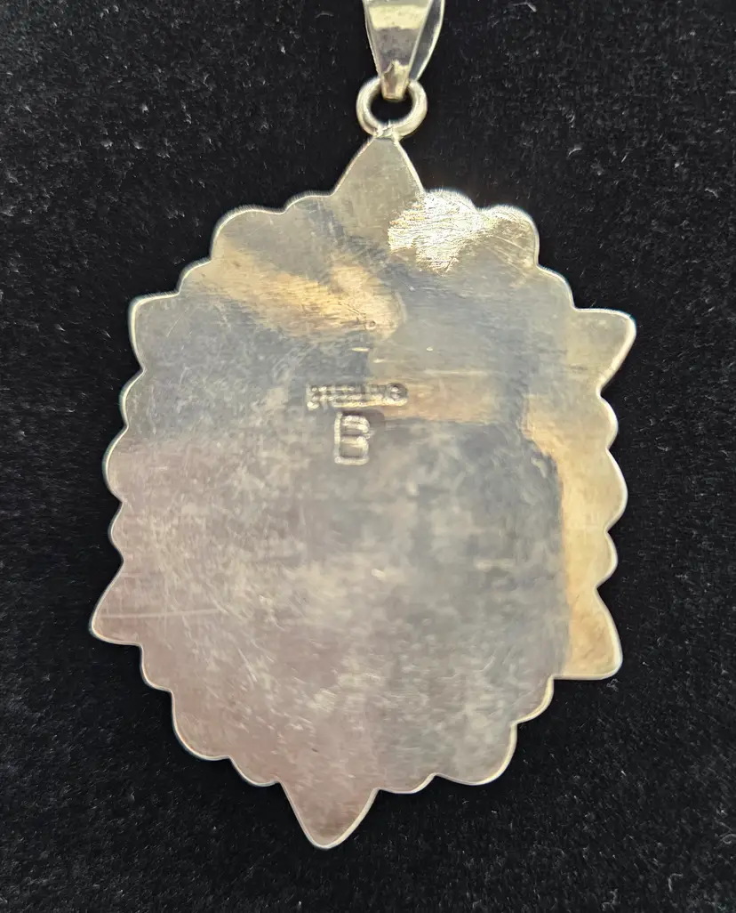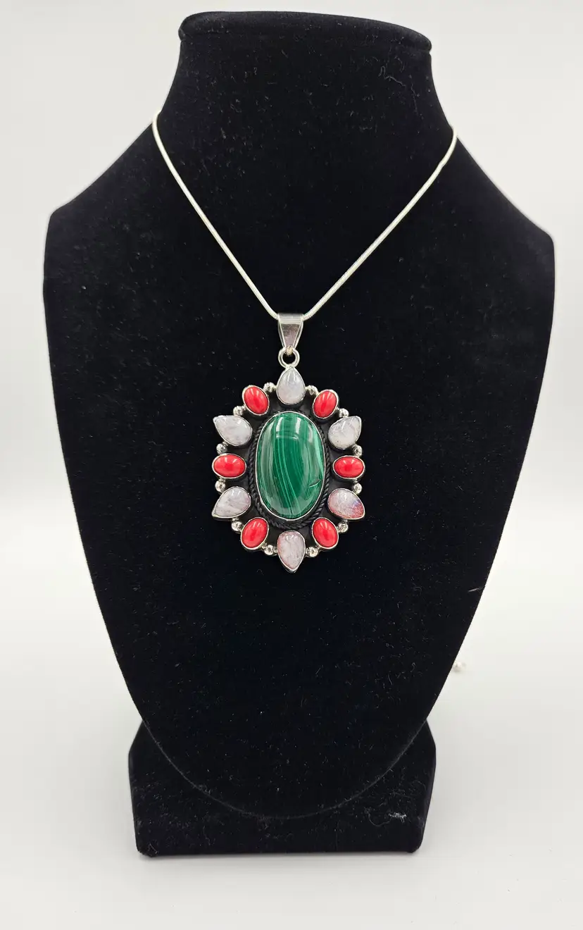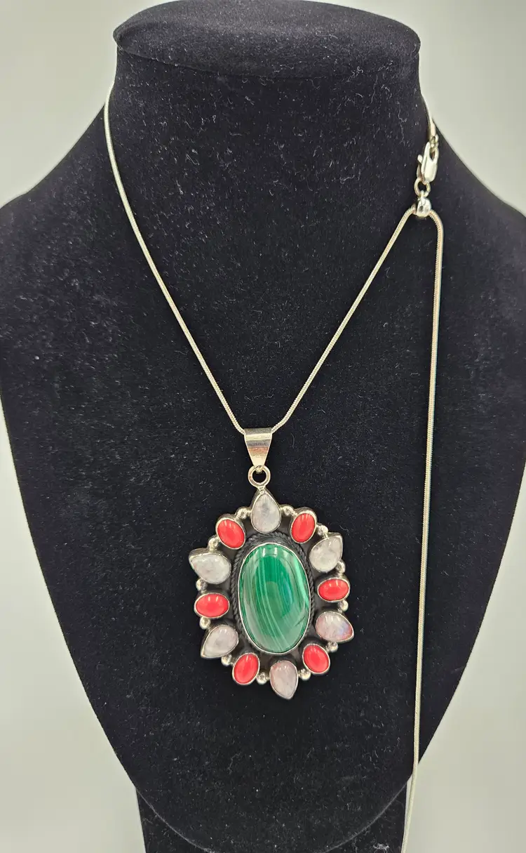 Not tested but marked sterling B this beautiful malachite center stone pendant is surrounded by red coral and moonstone. Pendant is 2.5 by 1.5 and total weight is 40 grams. Silver tone chain at its longest is 22 inches and does not have markings.