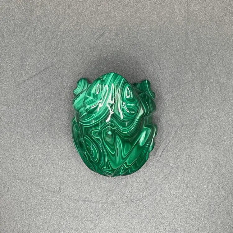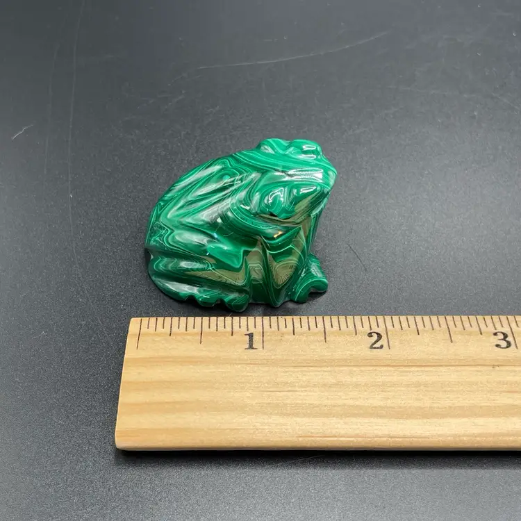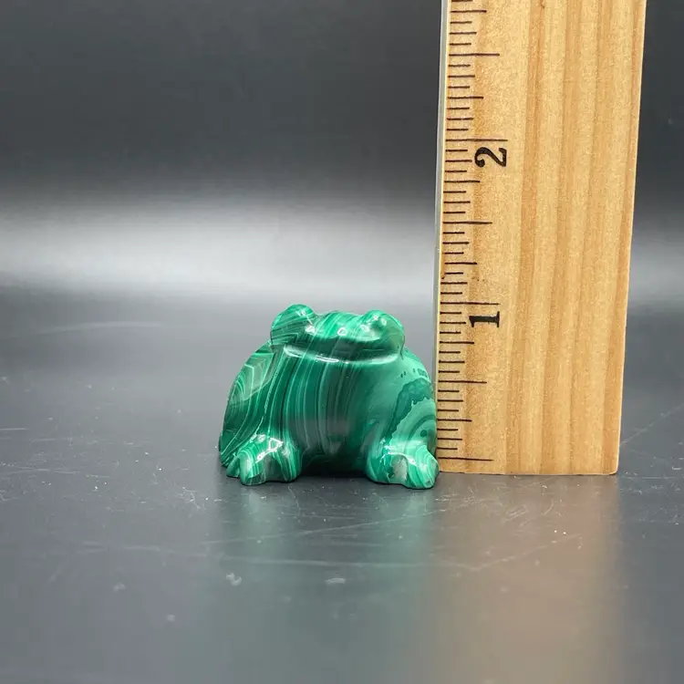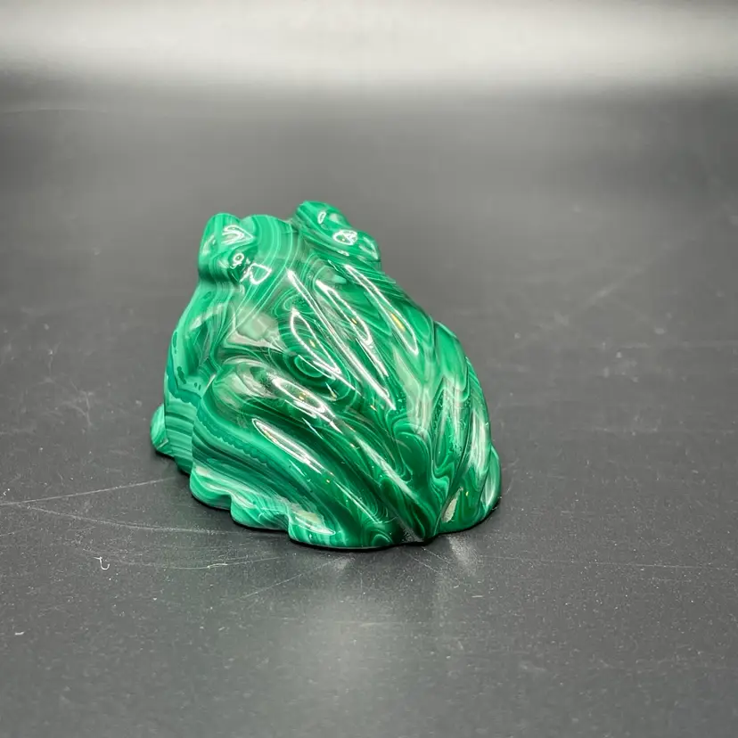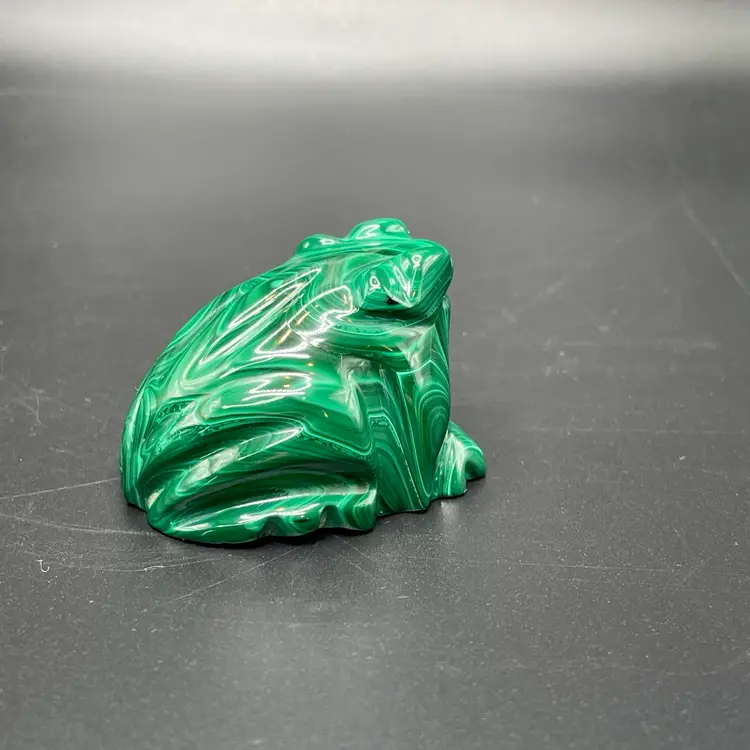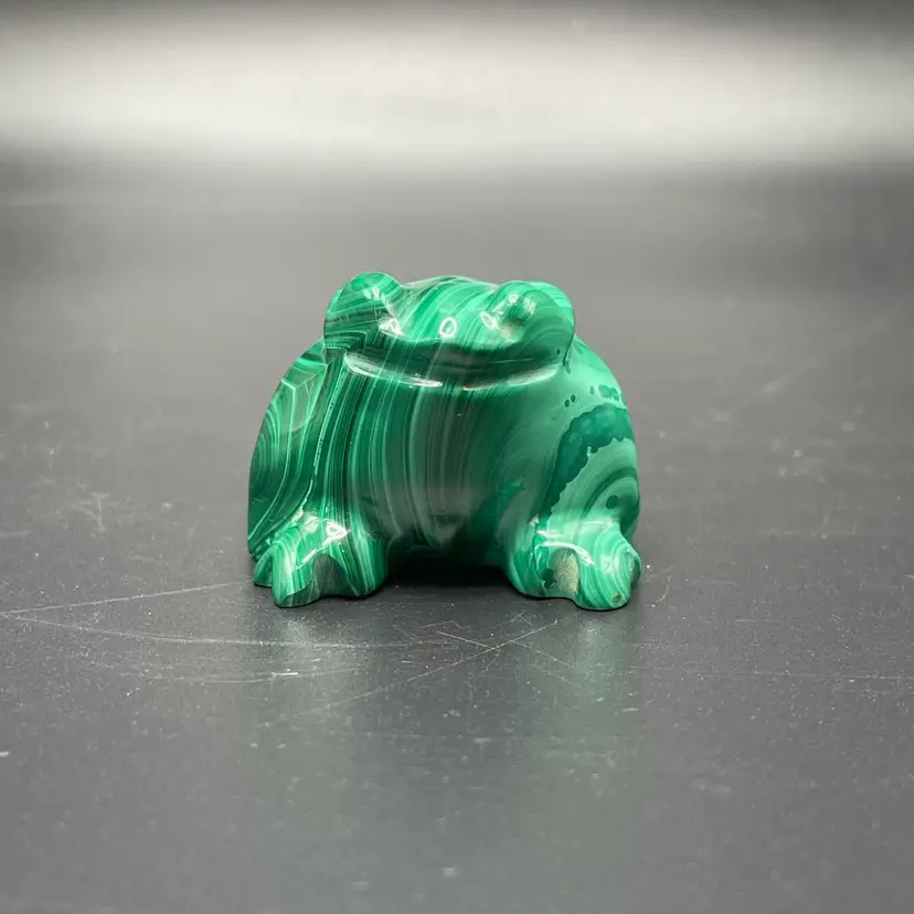This is a hand carved Malachite crystal frog sculpture. He measures approximately 1" tall x 1.5" long. No chips or cracks.