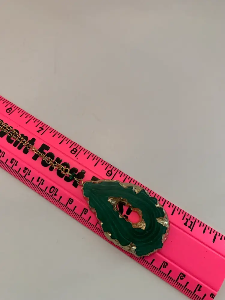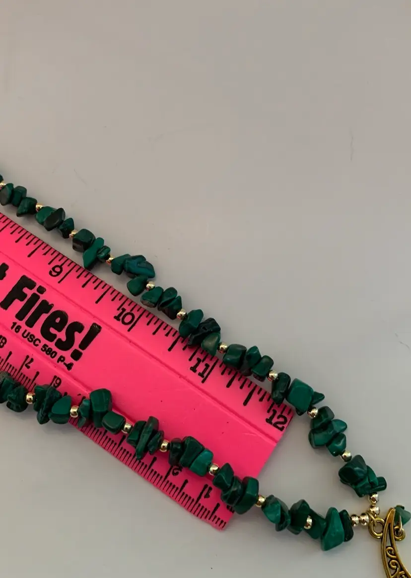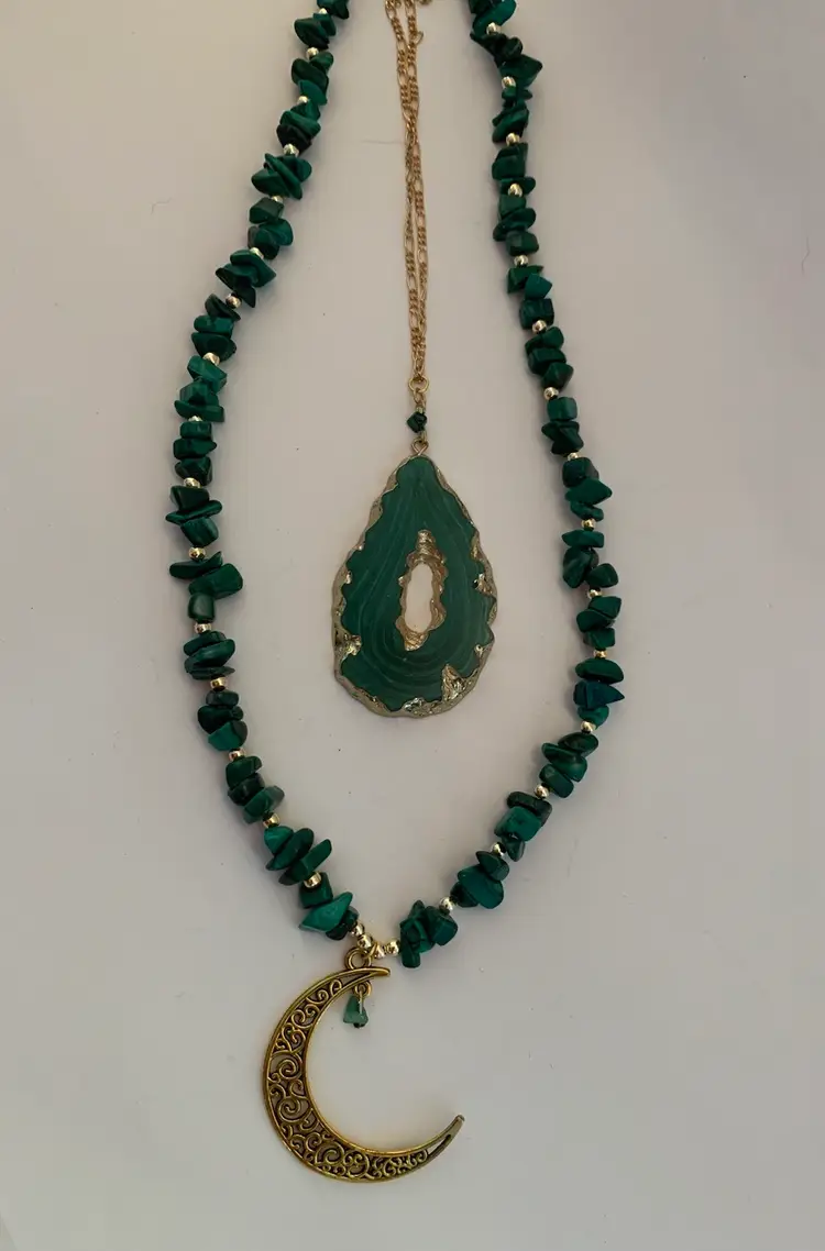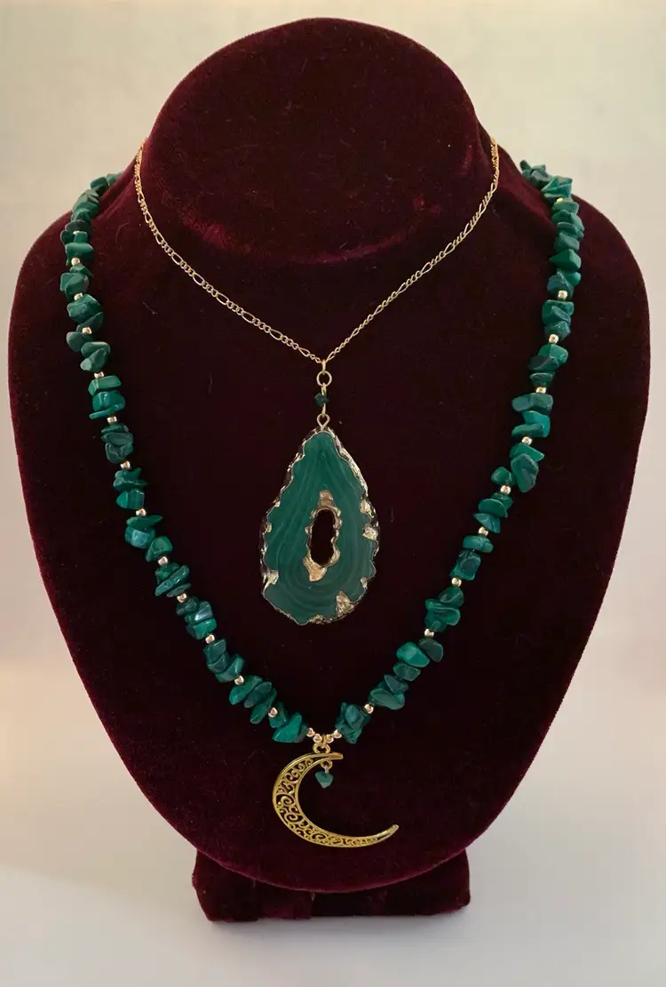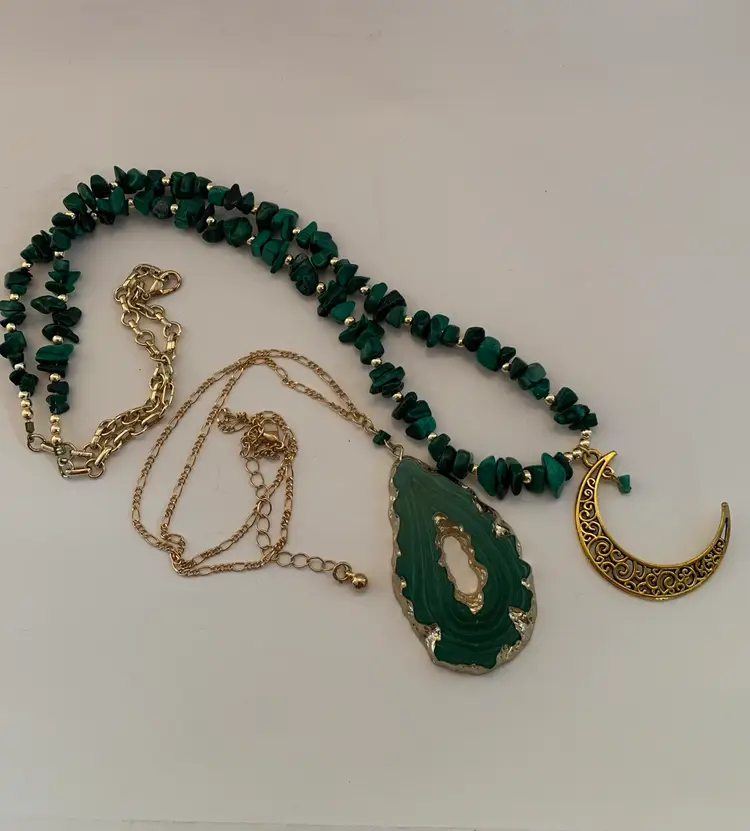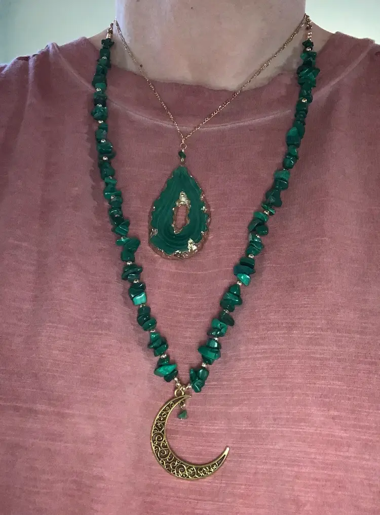 Coordinating set of handmade necklaces . First is genuine Malachite stone chips with gold toned beads and a filigree crescent moon charm. Matching necklace is a faux malachite pendant on a gold toned chain. Malachite necklace is about 13” in wearable length, faux malachite is about 8 1/2” in wearable length.