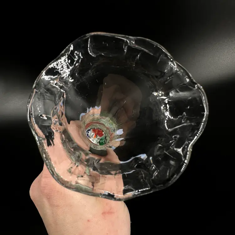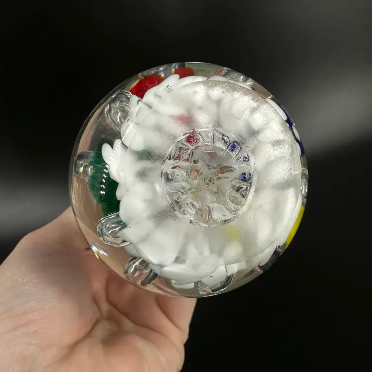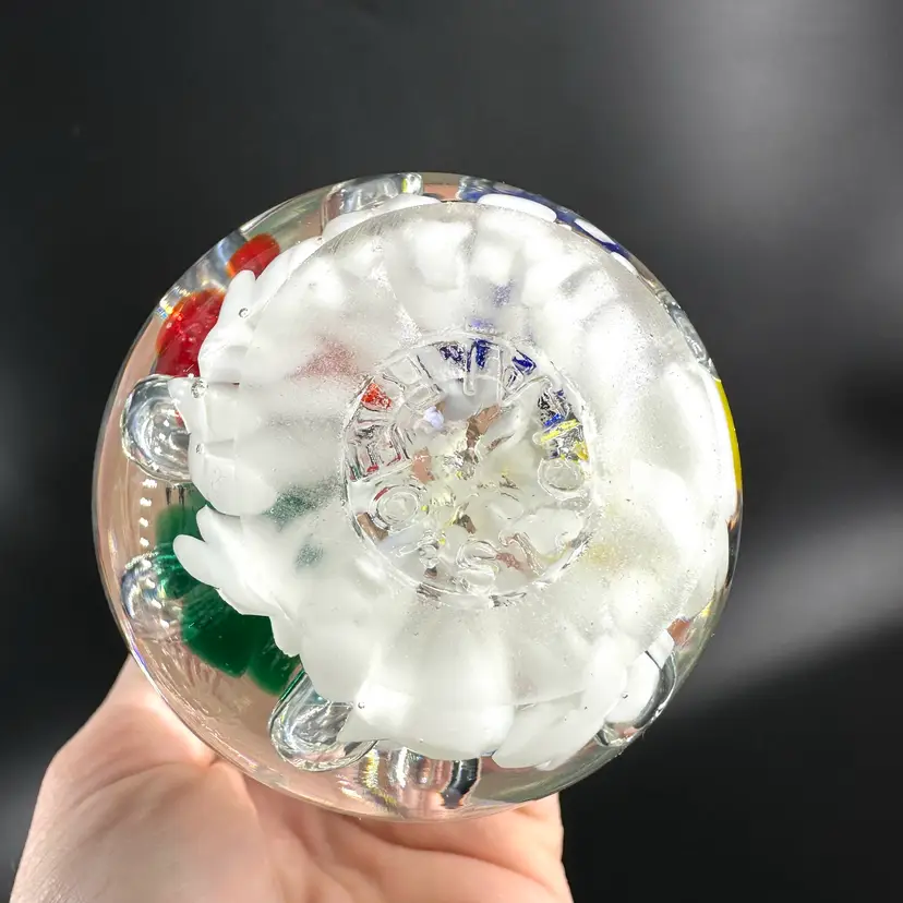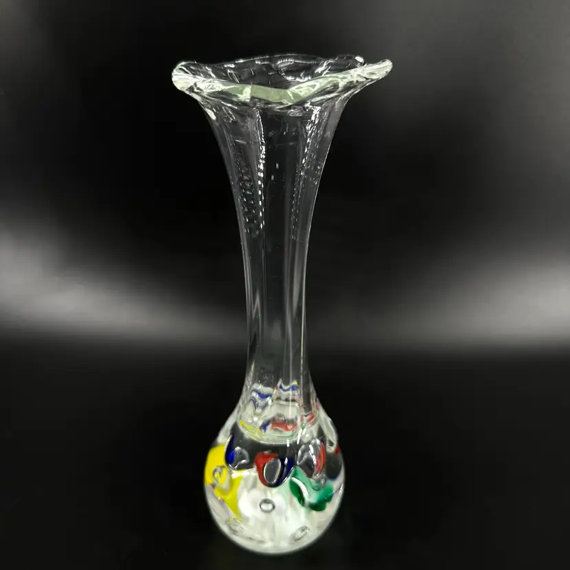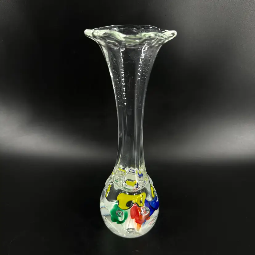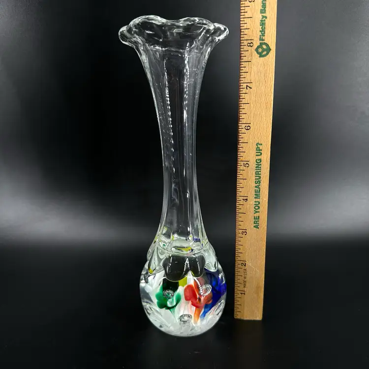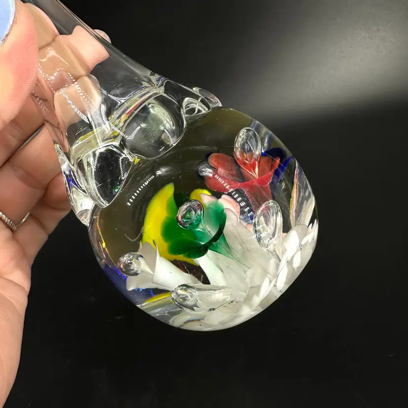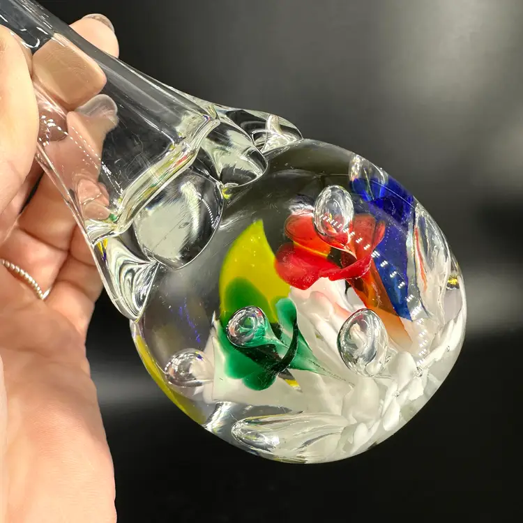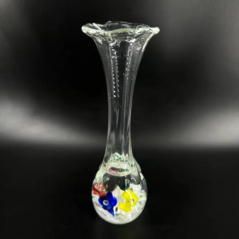 St. Clair handblown paperweight vase featuring colorful flower and controlled bubble design. Vase has a fluted, slightly ruffled opening. No chips or cracks. Includes an engraved stamped “ST CLAIR” on the bottom. Paperweight vase measures approximately 8.25” tall.