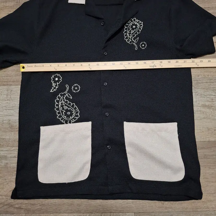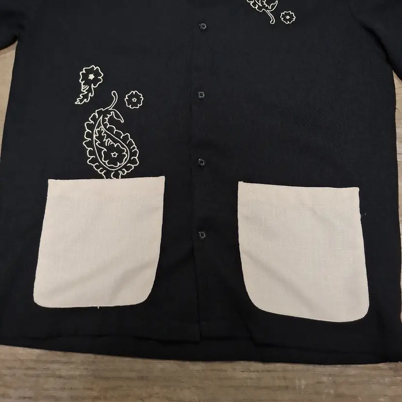 • Short sleeves for relaxed comfort • Dual front cream pockets for utility • Button-up closure for ease of wear • Paisley design adds a touch of artistry • Contrasting cream collar for a unique look