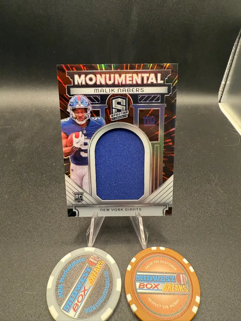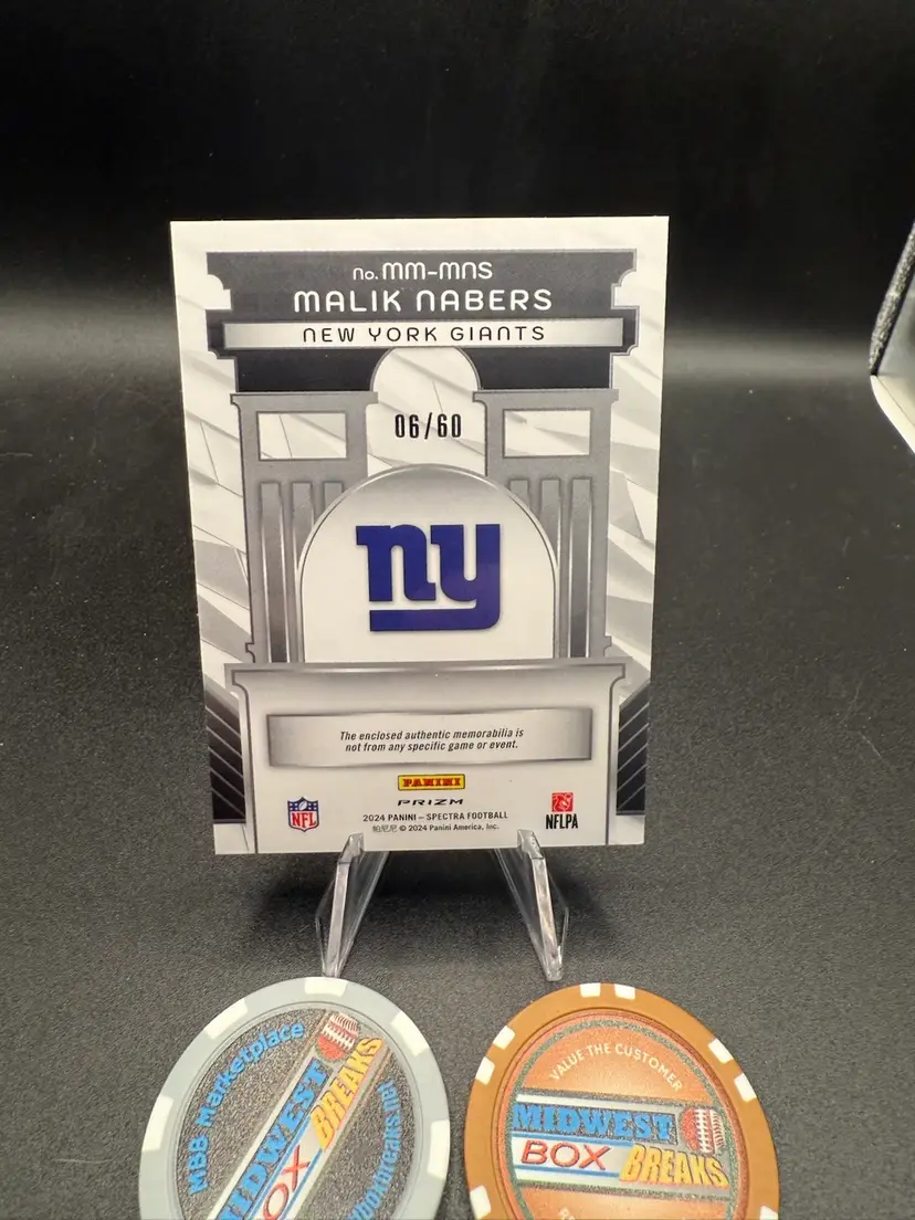 This card is from 2024 Spectra and is a Malik Nabers rookie patch #6/60. New York Giants WR.