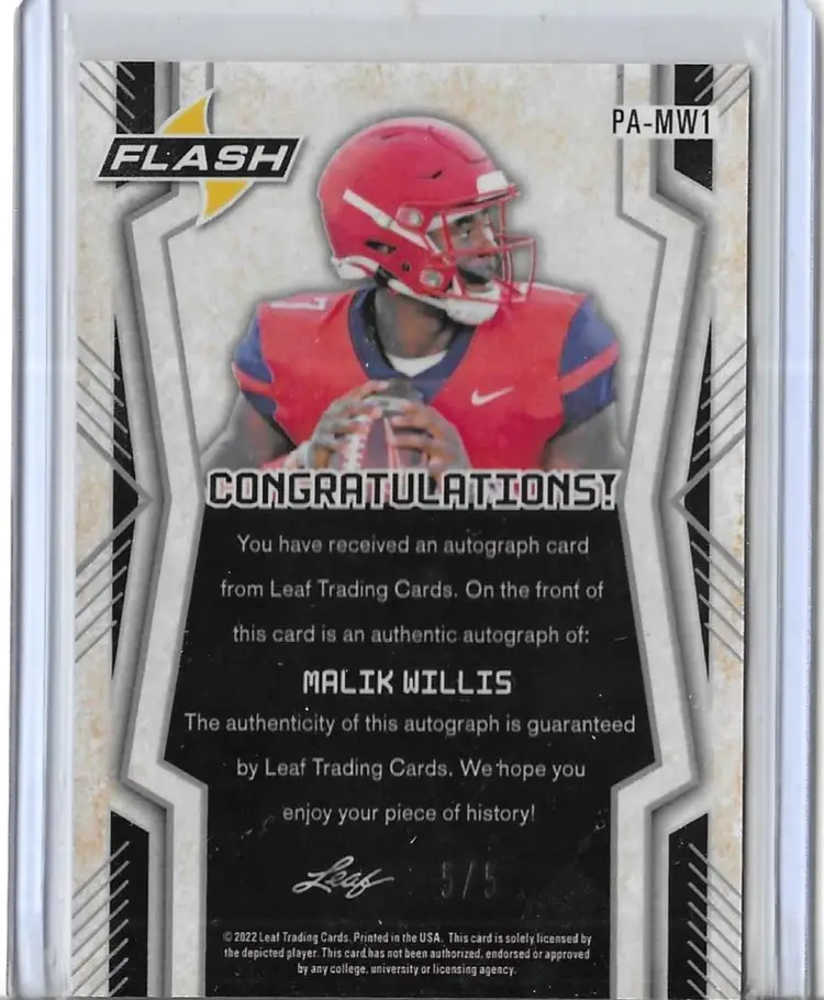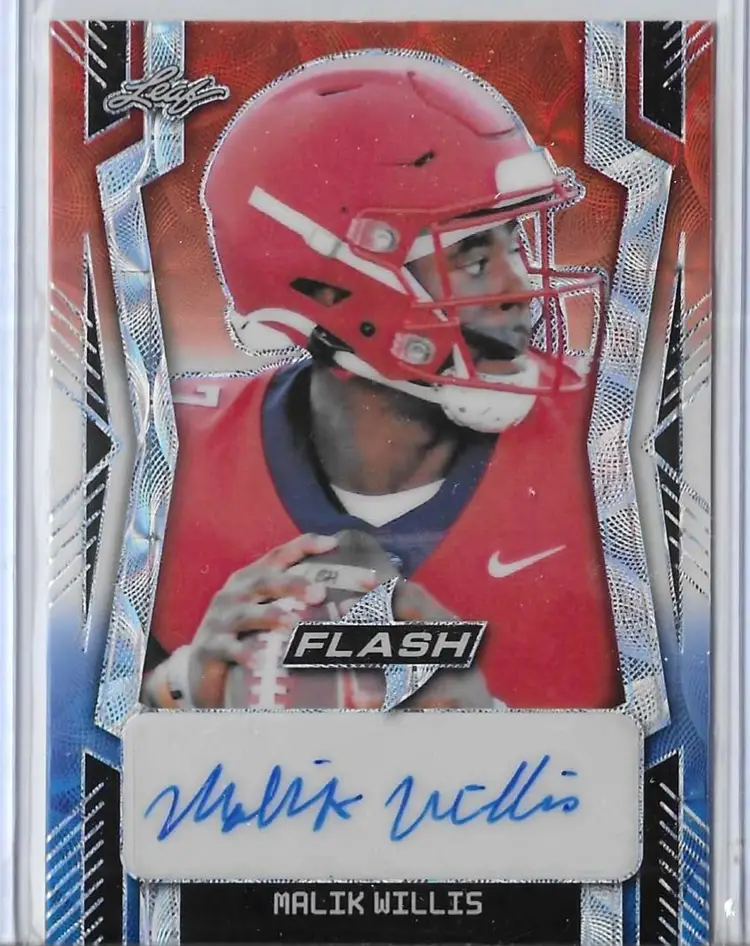 Check out this Malik Willis Leaf Flash rookie card, complete with a bold autograph. A great addition for any football fan or card collector.