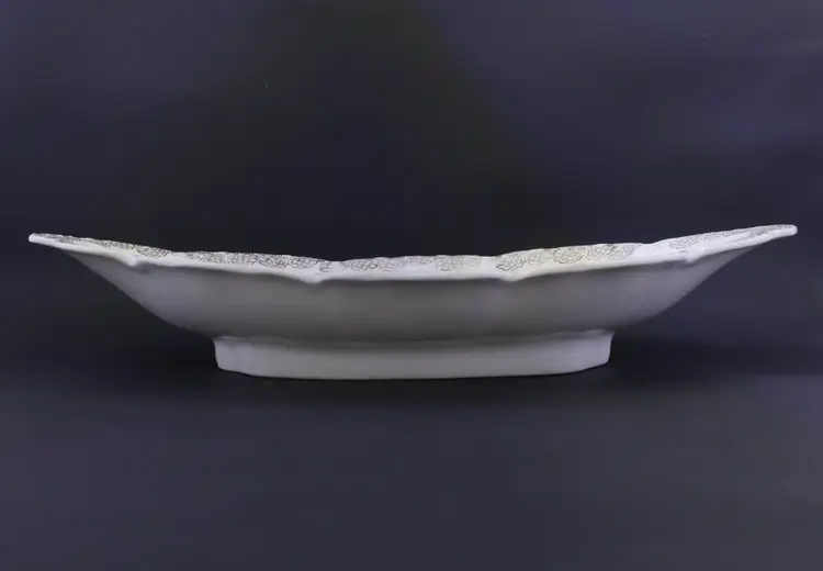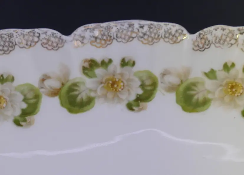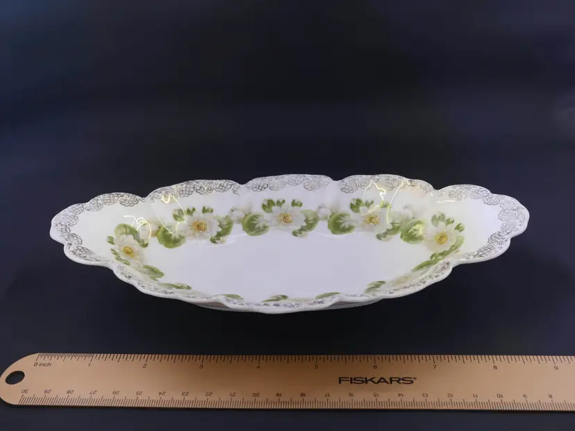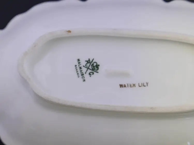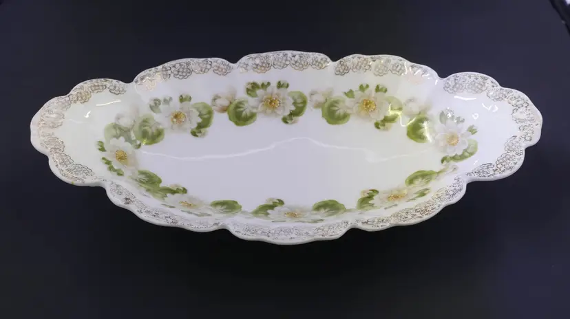 An oval, scalloped serving dish made of white porcelain. It is decorated with a hand-painted Water Lily pattern. The rim is adorned with intricate gold gilding. The base has a green stamped mark indicating Malmaison Bavaria with a crown symbol, and Water Lily stamped in gold. The dish measures approximately 9" long by 4.5" wide and is in very good condition with no chips, cracks or crazing.