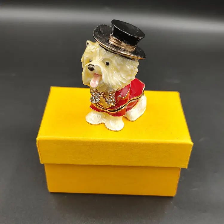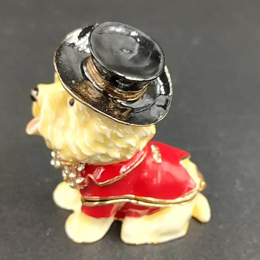 Maltese Dog With Tux And Top Hat Enameled Trinket Box. Comes with box. Height 2" x width 1 4/16 x length 2".
