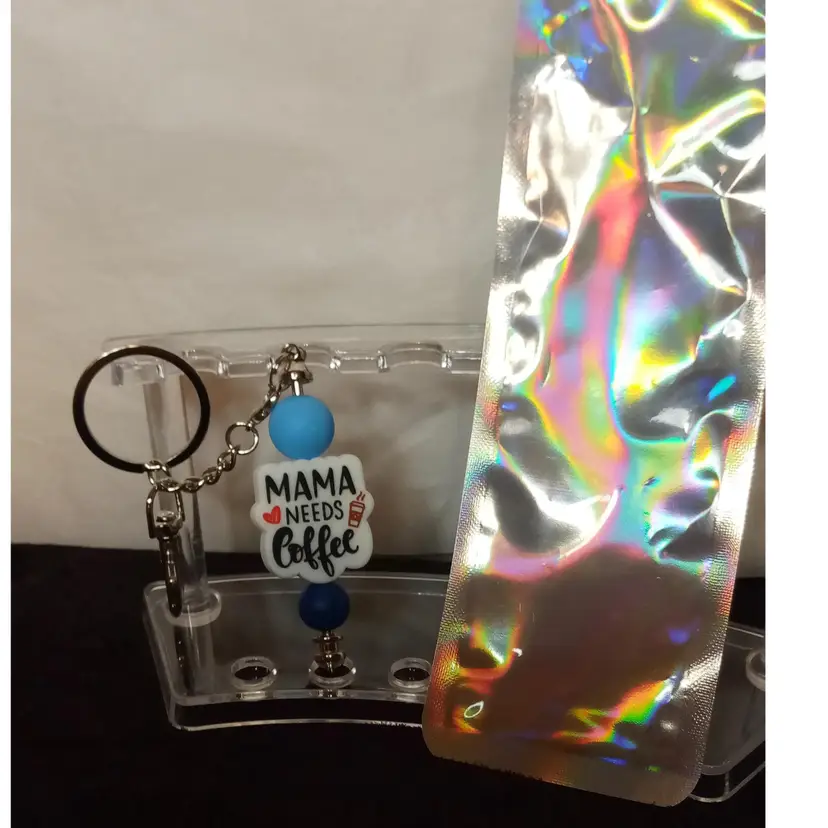 Fun keychain with 'Mama Needs Coffee' charm and blue beads. Perfect for coffee lovers. Comes with bag.