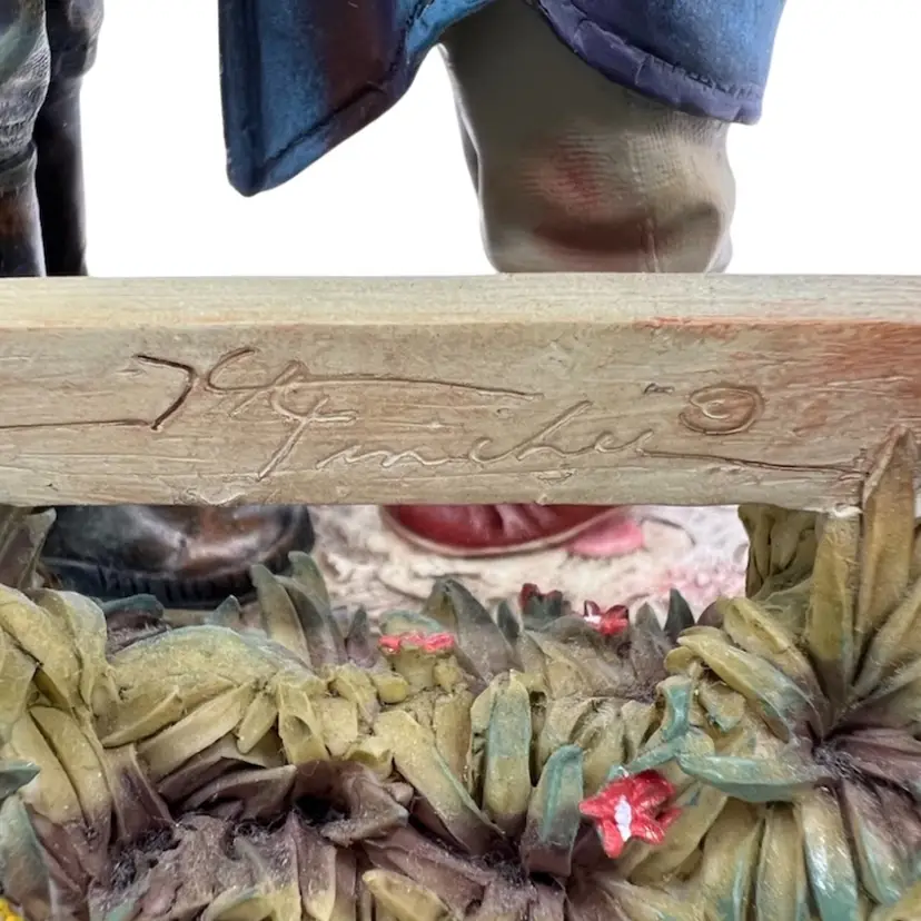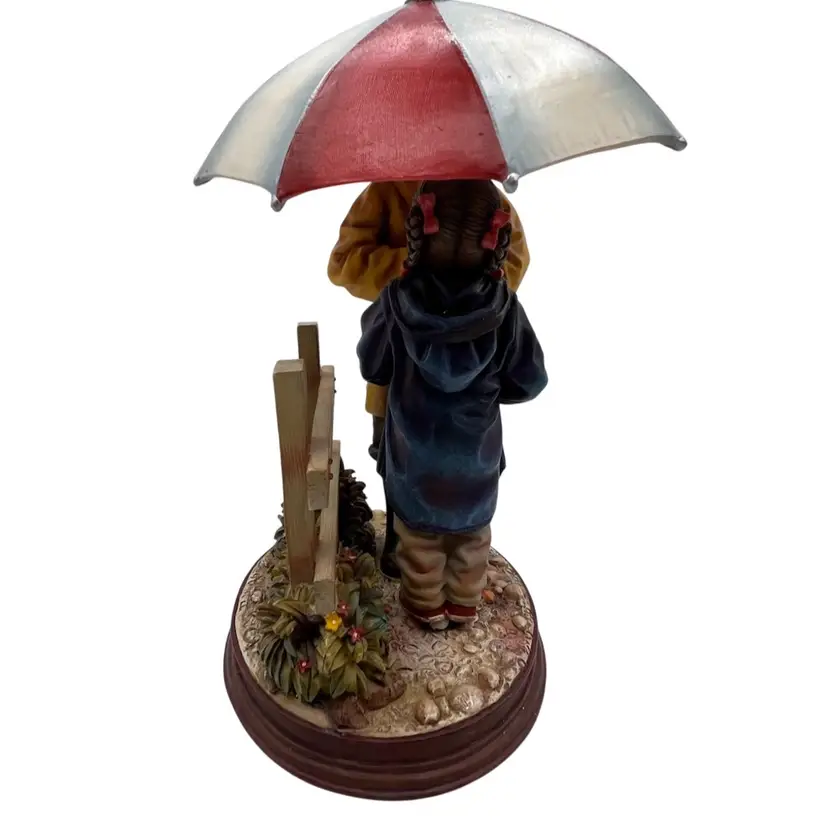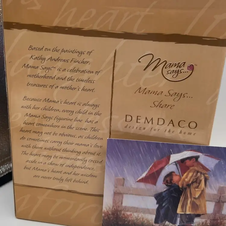MAMA SAYS SHARE BY KATHY ANDREWS FINCHER. THIS IS DATED 2003 AND IS RETIRED IT IS A VERY RARE FIND. BECAUSE MAMA’S HEART IS ALWAYS WITH HER CHILDREN, EVERY CHILD FIGURINE HAS A HEART SOMEWHERE IN THE SCENE. IT MAY NOT BE OBVIOUS AS CHILDREN DO SOMETIMES CARRY THEIR MAMA’S LOVE WITH THEM WITHOUT THINKING ABOUT IT. MAMA’S HEART AND WISDOM ARE NEVER LEFT BEHIND. THE INSPIRATION BEHIND THE FIGURINE IS A LOVELY WONDERFUL LIVING FEELING ABOUT OUR MOMMA’S.