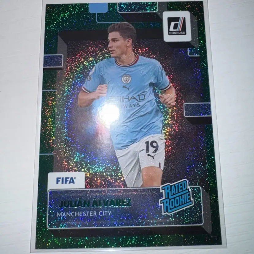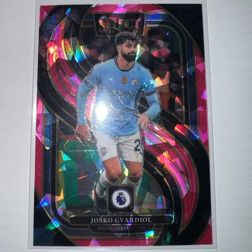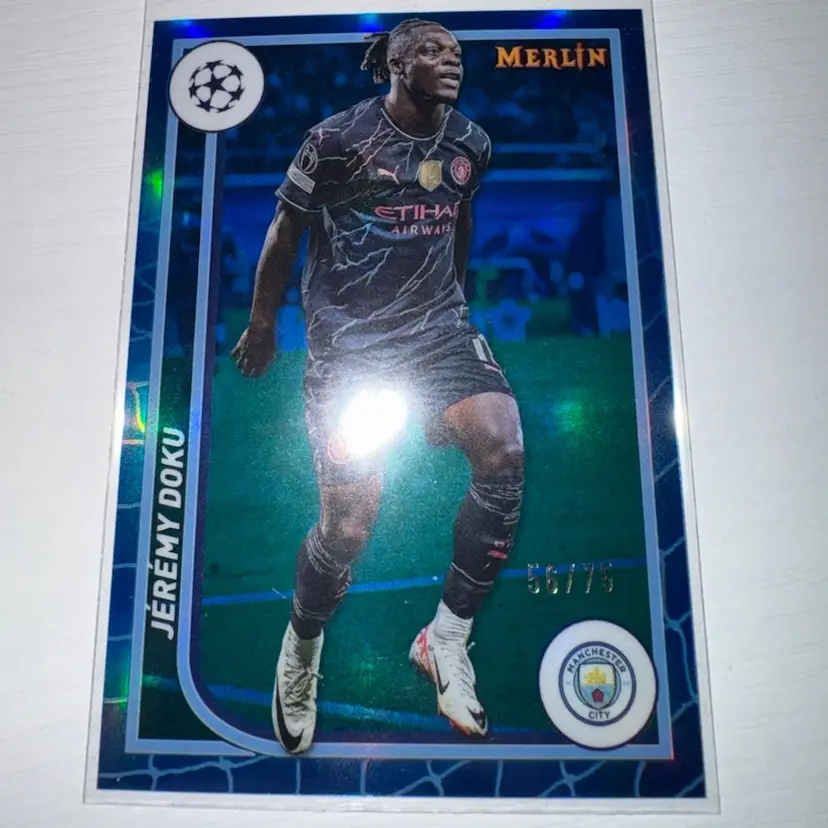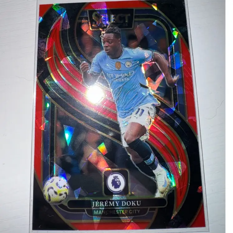This 4 card lot includes: Jeremy Doku 2023 Merlin Blue /75 Jeremy Doku 2024 Select Red Ice Josko Gvardiol 2024 Select Pink ice Julian Alvarez 2022 Donruss Rated Rookie Green