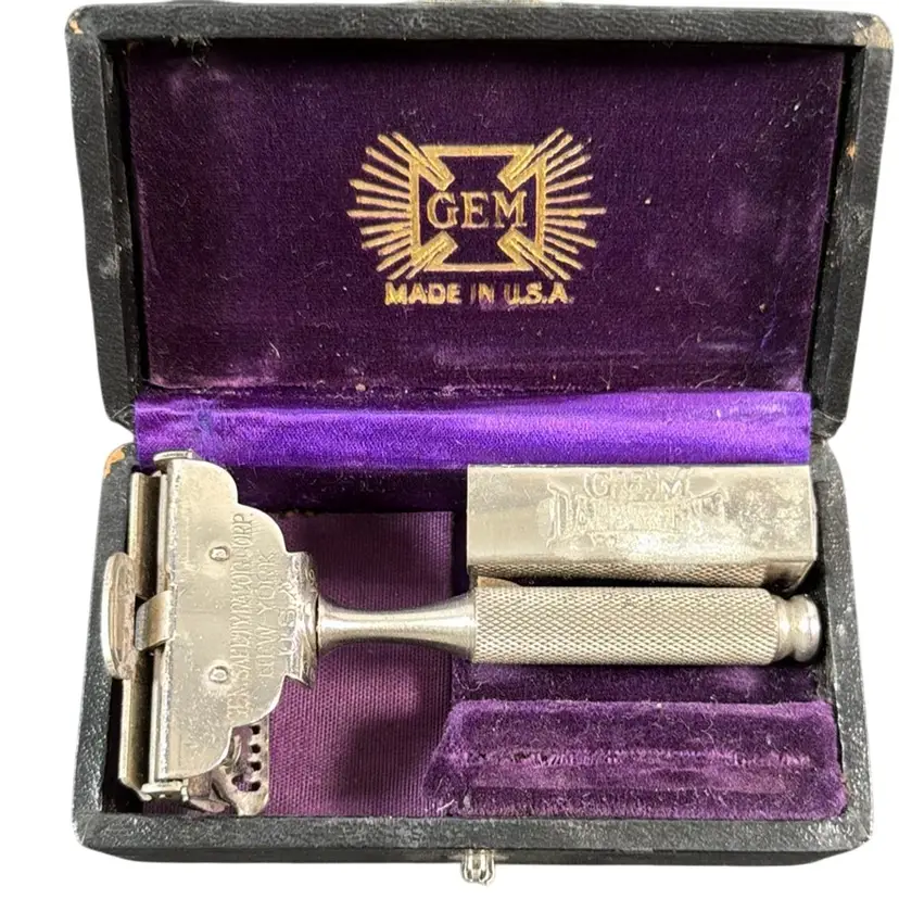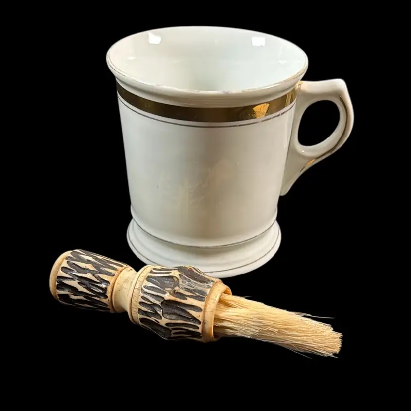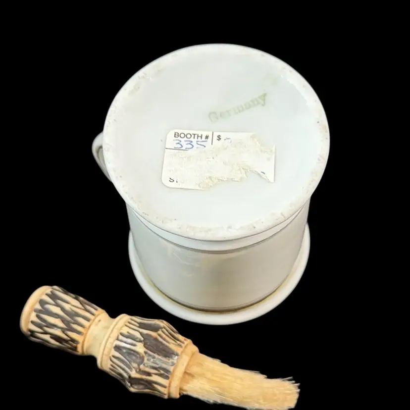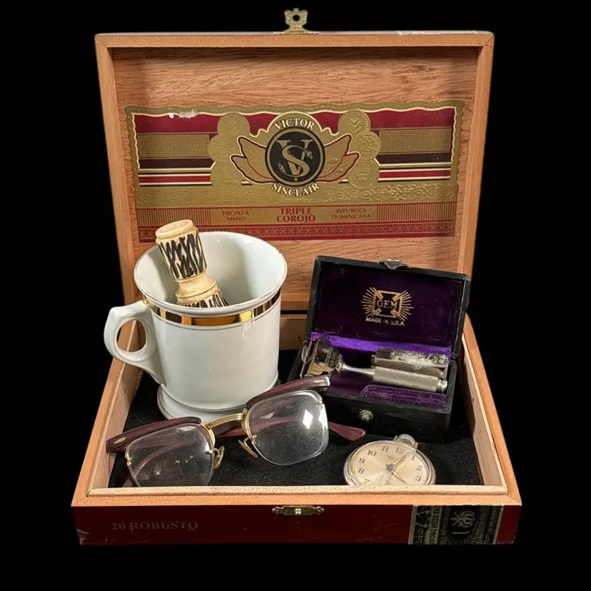 Includes -Victoria Sinclair 9” x 6.5” x 2” wood cigar box -Vintage Glasses -German porcelain 3.5” shaving mug -Antler shaving brush -Westclock pocket watch non-working broken glass -Vintage GEM razor with case and extra blades