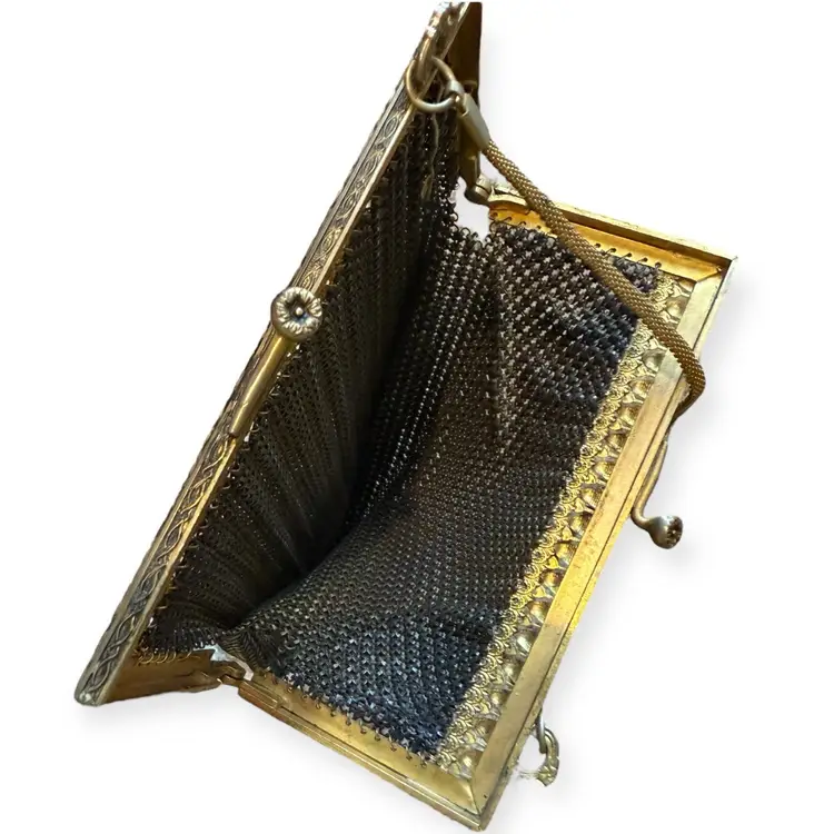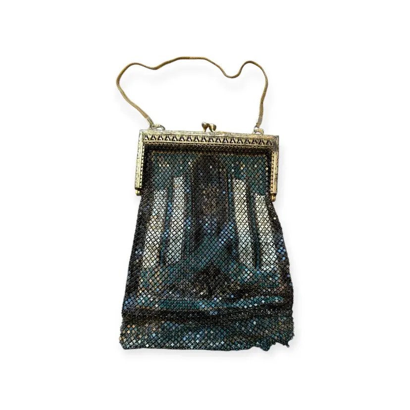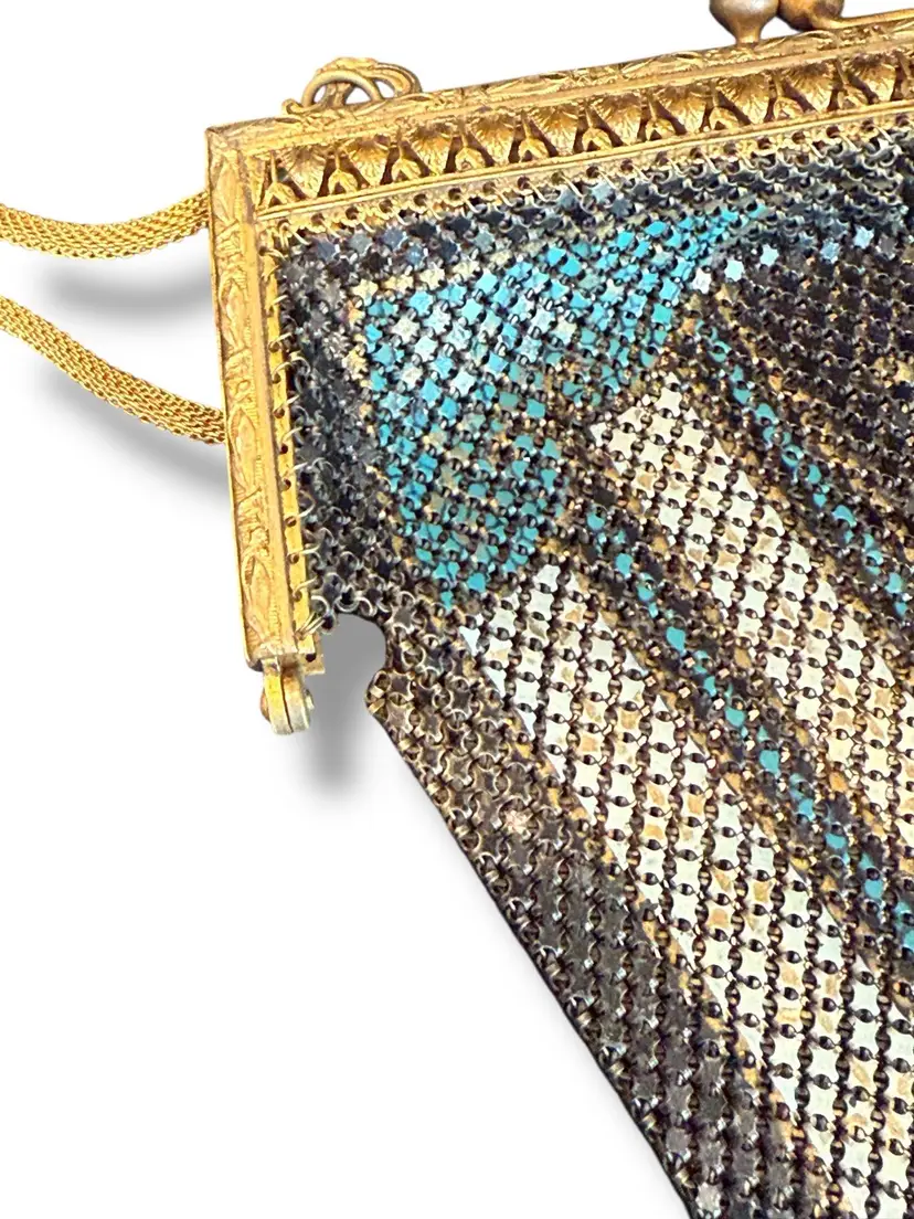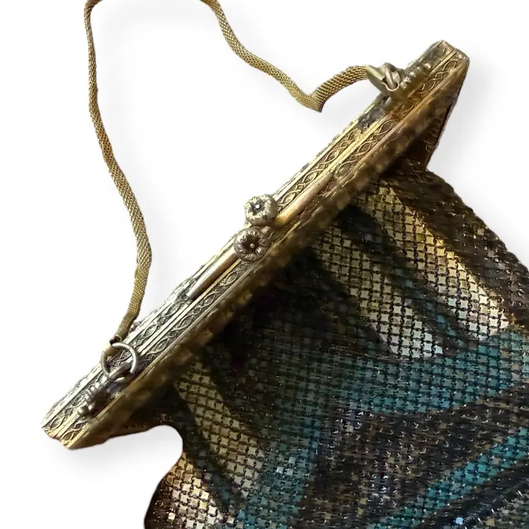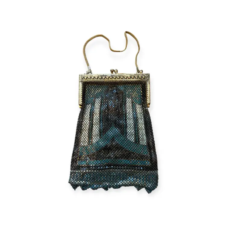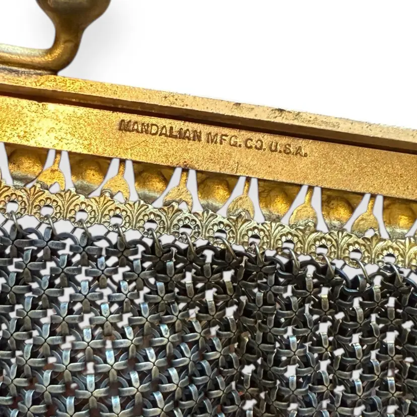 Vintage Mandalian MFG Co Art Deco Mesh Purse. Preowned. There is a captivating art deco motif in blue and white on the metal mesh material. It has a lovely drape to it, giving it the drama that we know and love from the era. The snap closure is richly decorated, and works great. There is one section of the bag on the side that is no longer secured to the frame. There is a chain to hold the bag. The bag is 7.5" from top of frame to bottom. It is about 4.5" wide. VTG Art Deco Mandalian Mfg Co Mesh Purse