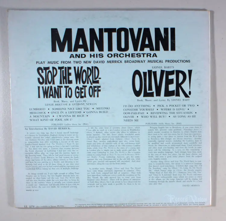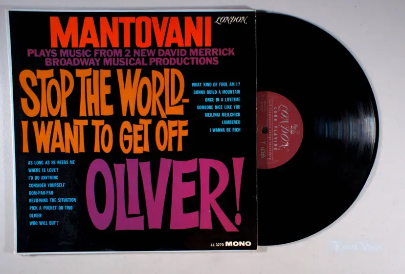 Stop the World I Want to Get Off / Oliver, by Mantovani, is an orchestral dual recording of the musicals Stop The World, I Want To Get Off, and Oliver!