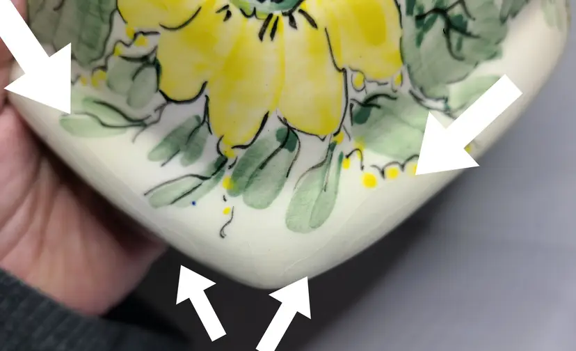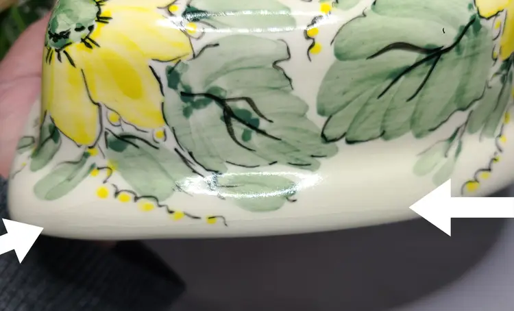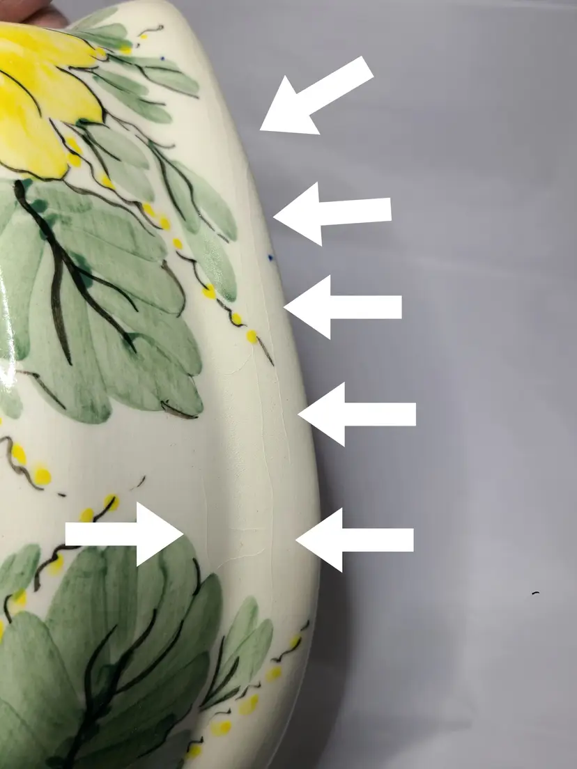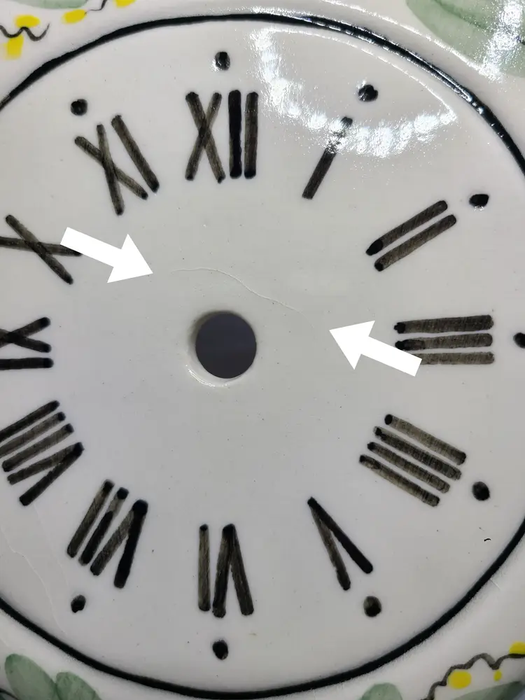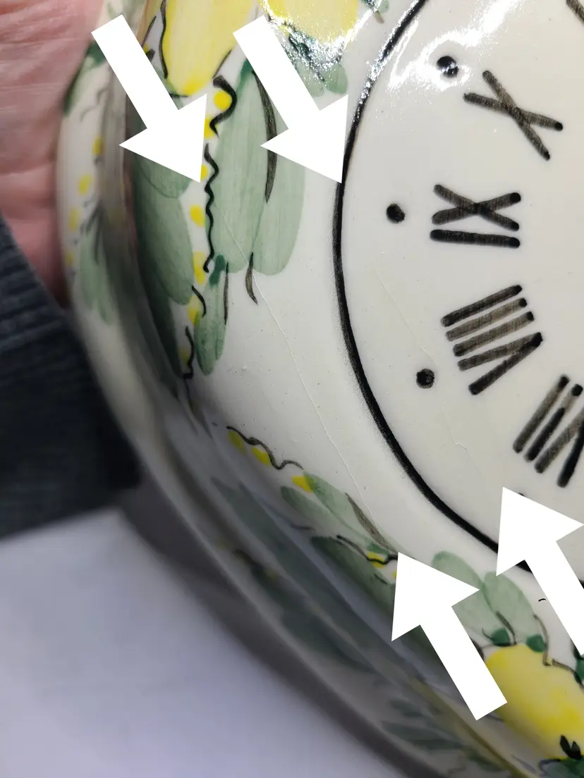 Beautiful vintage piece. Please view all pics. Does have glaze crackling in some areas as shown in pics. No cracks or chips in the actual pottery. Handpainted dial with Roman numerals. Measures about 9-3/4" tall, 8-1/2" wide, 2" deep. AS IS - Does not have clock movement mechanism, but this would be a simple and inexpensive fix.