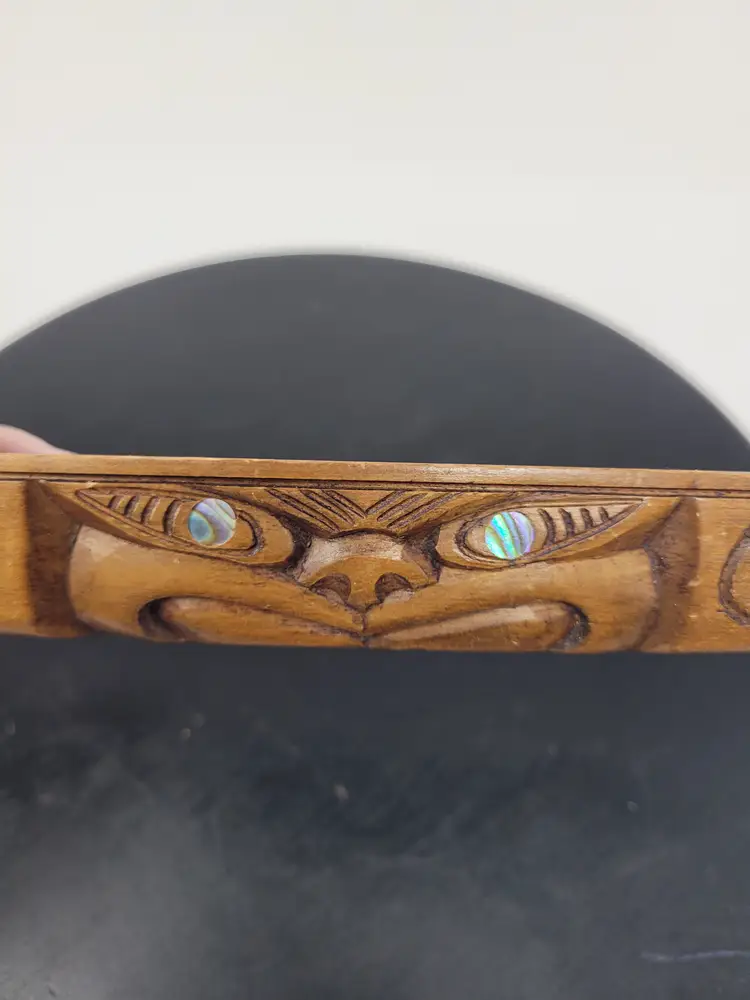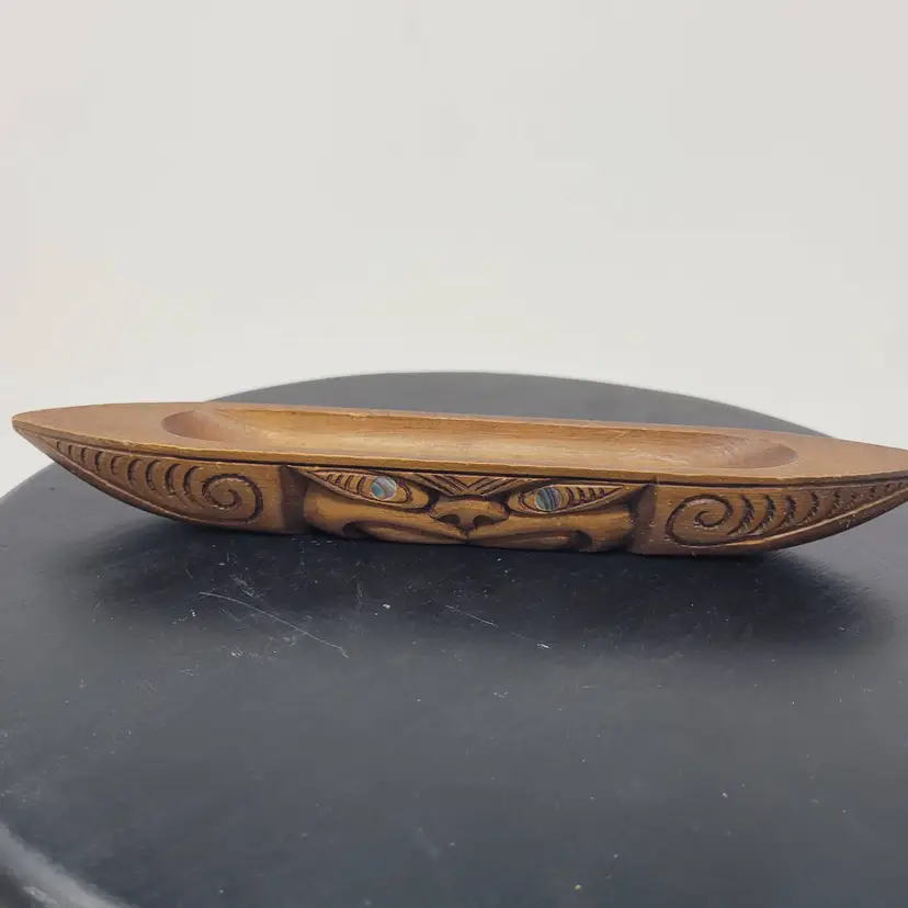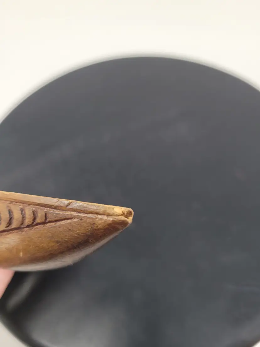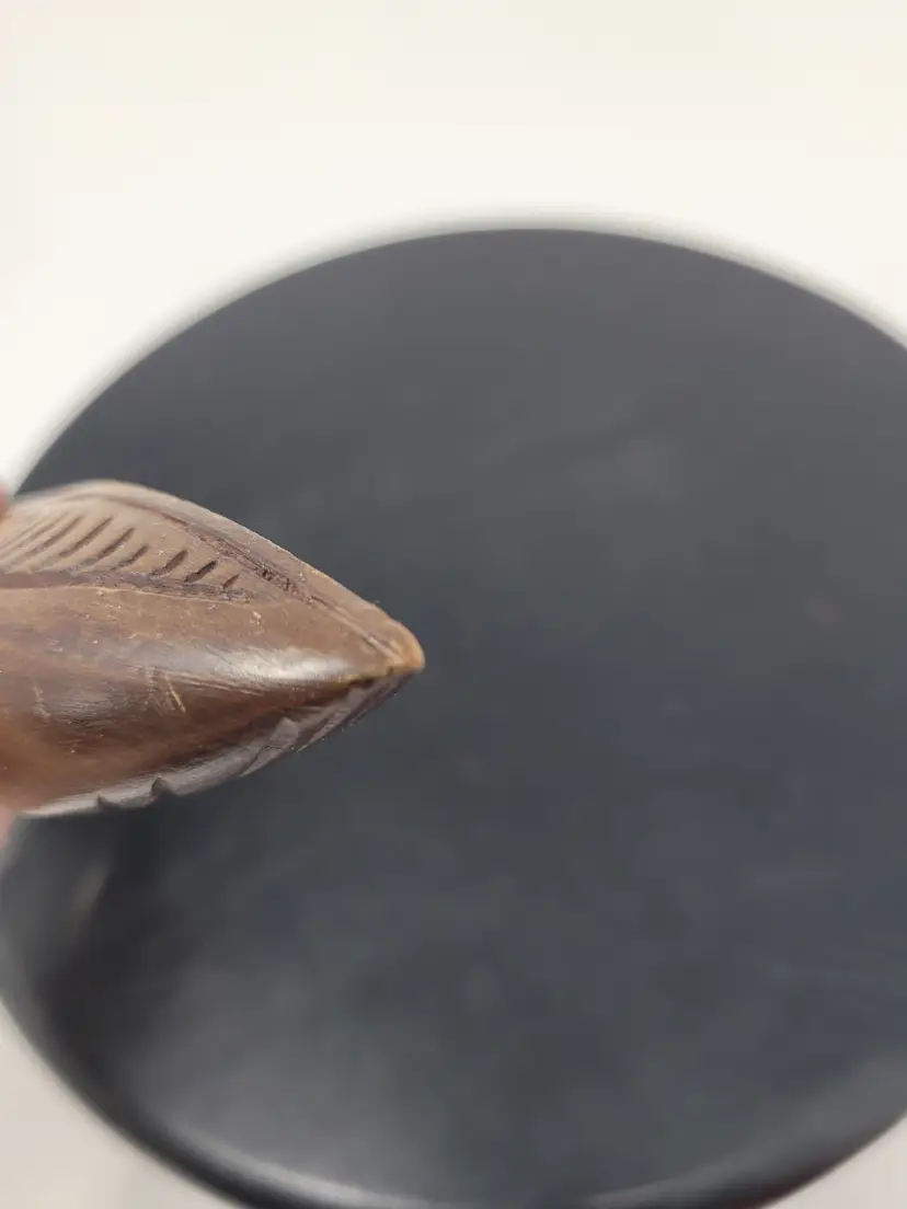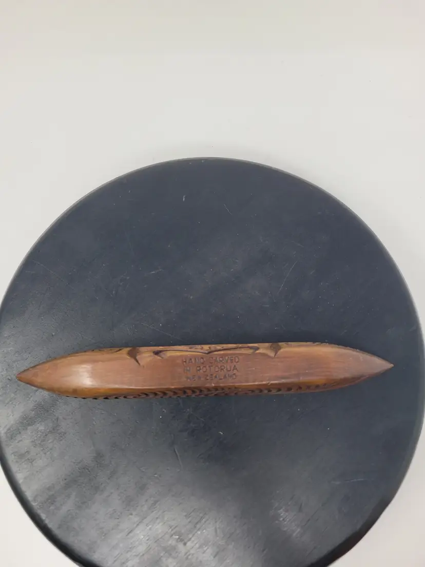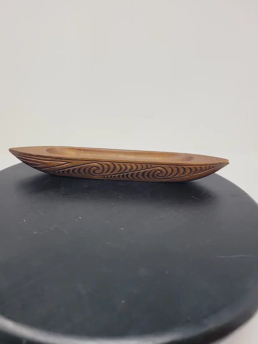Thank you for your time, there are some little nicks on the tip of the canoe on both ends please take a look at those pictures. Quite a nice vintage piece. It is about 9 in long and about 1 in thick and it's thickest point.