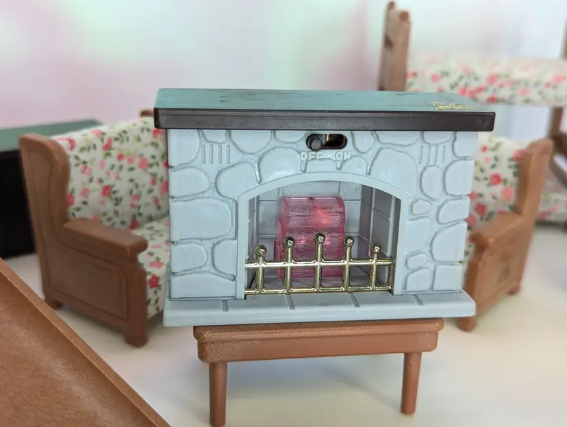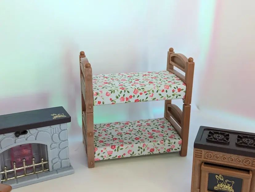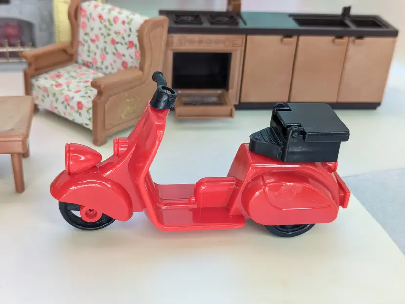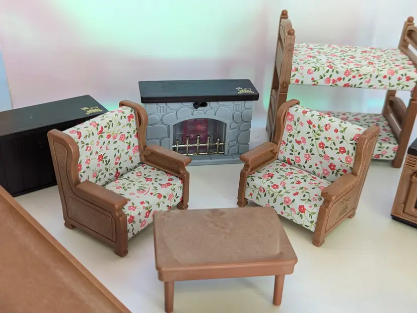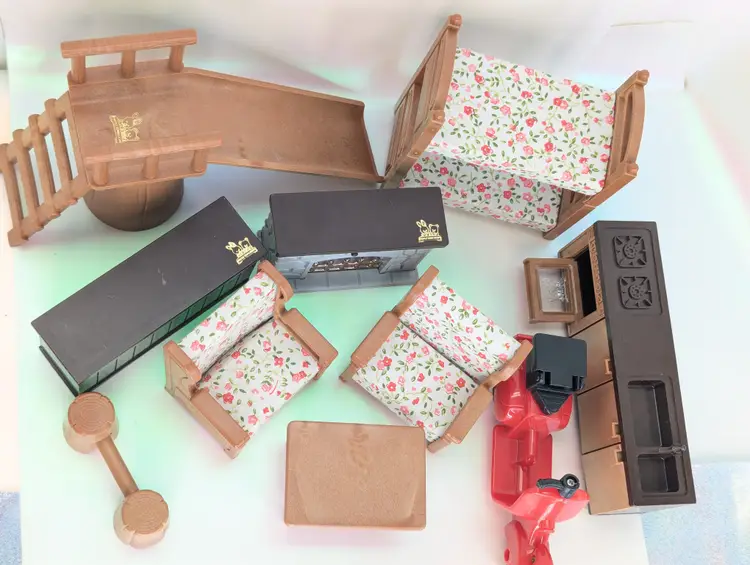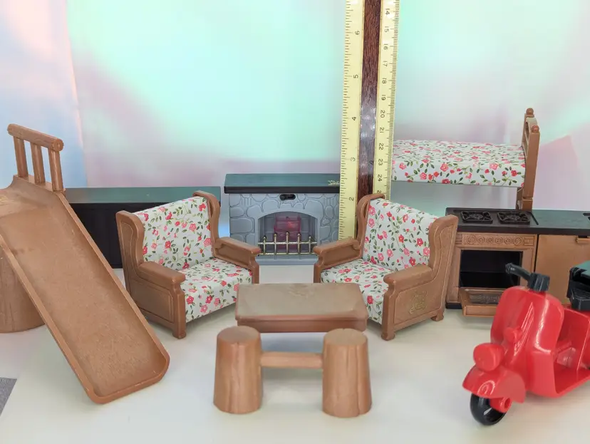 Vintage Maple Town Story Furniture lot made by Bandai in 1986. This set was made for a TV Cartoon that featured the adventures of Patty Rabbit, Bobby Bear and their families, in a small city inhabited by anthropomorphic animals named Maple Town. These toys very close to other flocked animals toys sold at this time, and can be used for there houses as well. This lot includes everything shown. It has a fireplace that should light up with the correct battery, but is un-tested. It takes a UM-5. The cover is missing the screws, but still holds on tight without them. Comes with 2 kitchen counters one plain and one with sink and stove. There is also 2 chairs and coffee table, two bunk beds that do come a part for single beds, The park slide and tree stumps for the school house. It also comes with the motorbike that has a broken handle on one side. Over all this is a great little set for any 3-4" figures! Only broken part is the bike handle. All other pieces in good shape. Kitchen counter doors are loose and will open easily. Comes from a smoke free, pet friendly home.