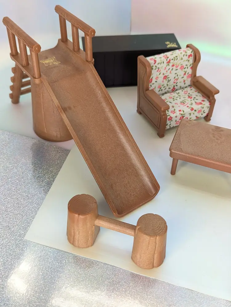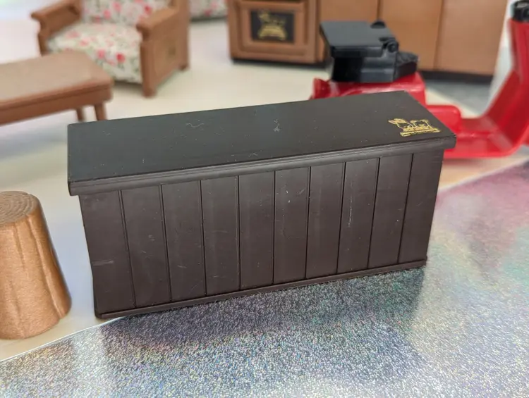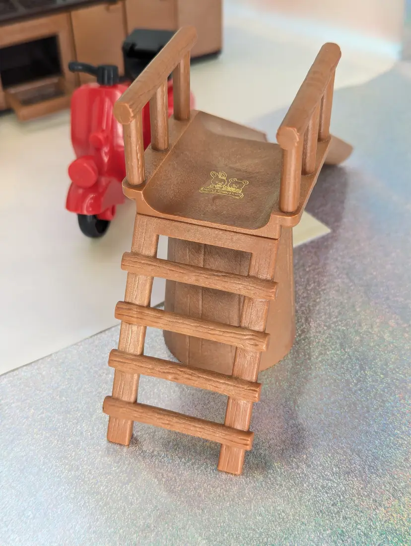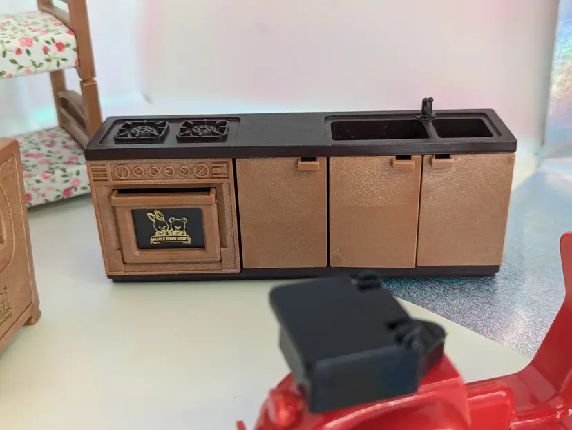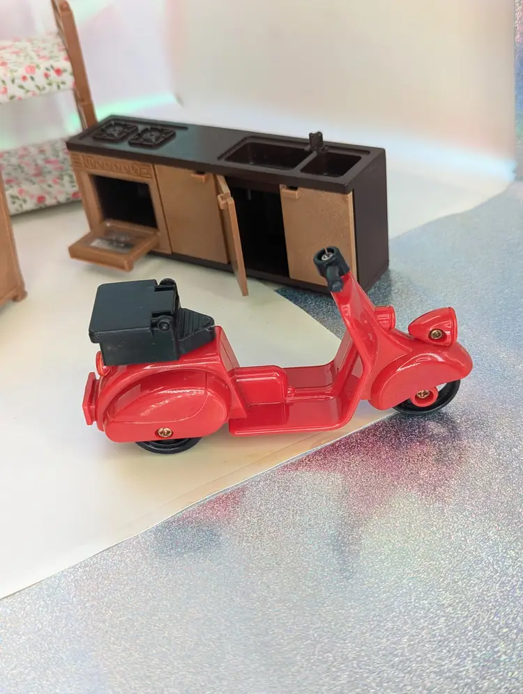Vintage Maple Town Story Furniture lot made by Bandai in 1986. This set was made for a TV Cartoon that featured the adventures of Patty Rabbit, Bobby Bear and their families, in a small city inhabited by anthropomorphic animals named Maple Town. These toys very close to other flocked animals toys sold at this time, and can be used for there houses as well. This lot includes everything shown. It has a fireplace that should light up with the correct battery, but is un-tested. It takes a UM-5. The cover is missing the screws, but still holds on tight without them. Comes with 2 kitchen counters one plain and one with sink and stove. There is also 2 chairs and coffee table, two bunk beds that do come a part for single beds, The park slide and tree stumps for the school house. It also comes with the motorbike that has a broken handle on one side. Over all this is a great little set for any 3-4" figures! Only broken part is the bike handle. All other pieces in good shape. Kitchen counter doors are loose and will open easily. Comes from a smoke free, pet friendly home.
