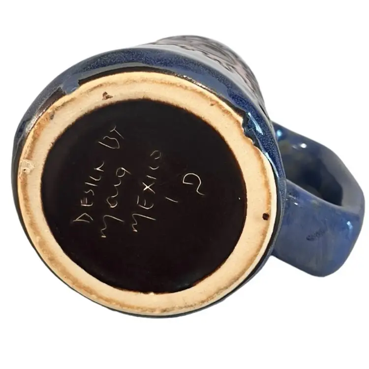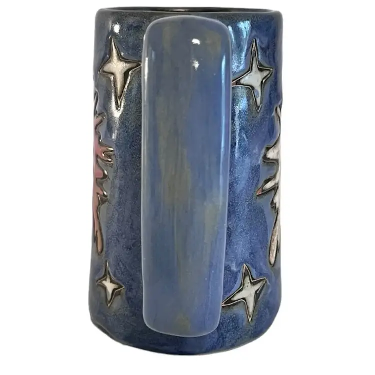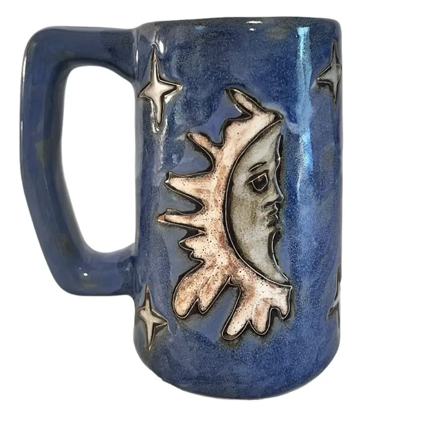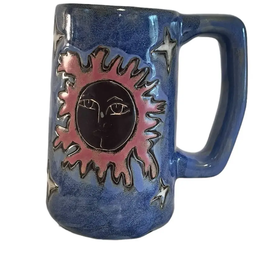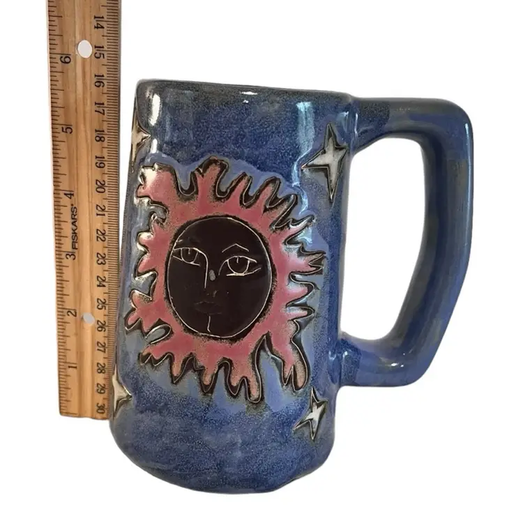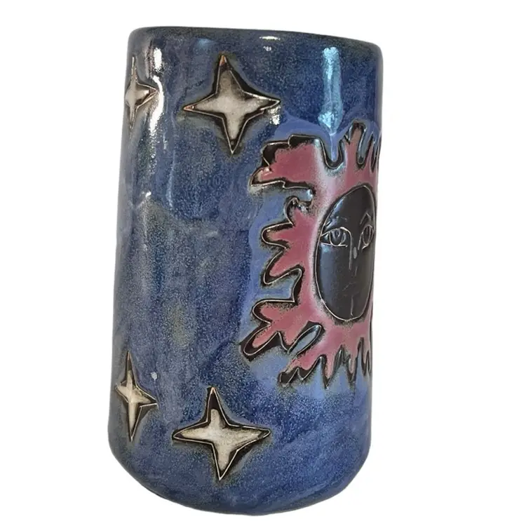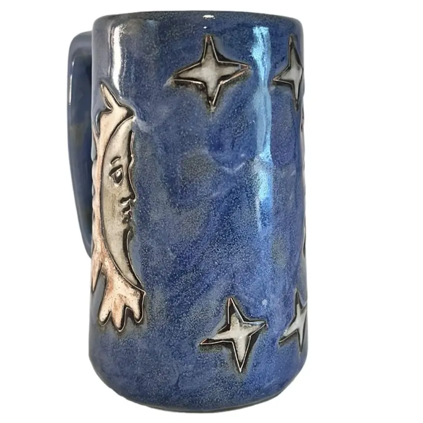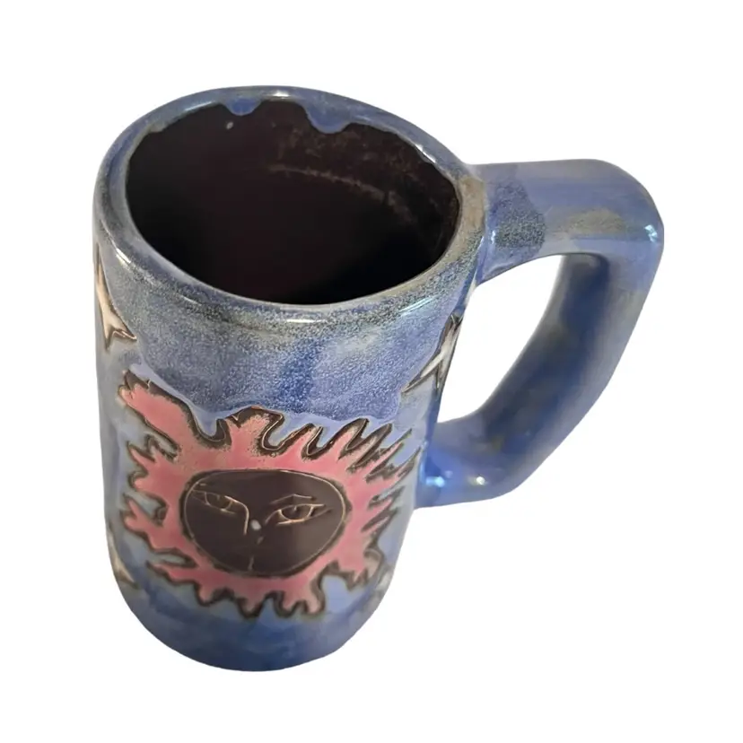 This is a beautiful tall 6” handled coffee mug glazed blue with sun, moon and stars. This is a pre-owned item in excellent condition