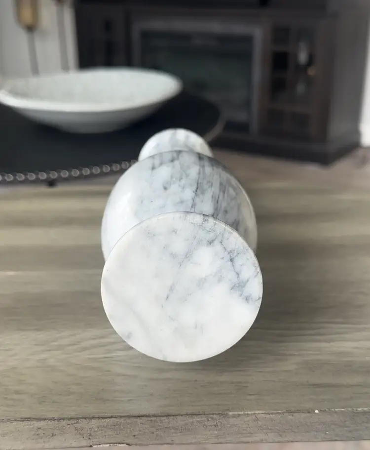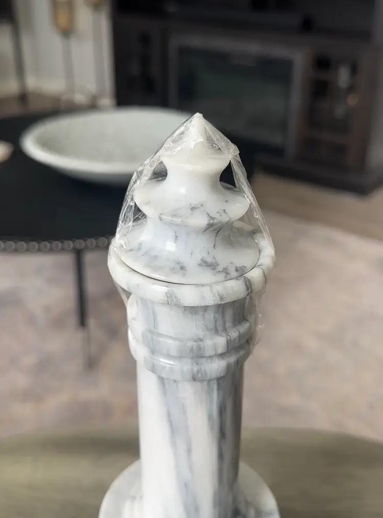 This vintage MARBLE DECANTER GENIE BOTTLE with lid is a unique piece made in the USA during the Mid 20th Century. The decanter features a gray veined polished marble design, standing at 11" high. Handmade with a carved marble production technique, this original decanter exudes a Mid Century style and is a one-of-a-kind collectible for drinkware and barware enthusiasts. 3.5” W.