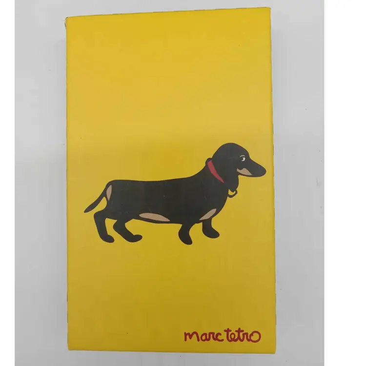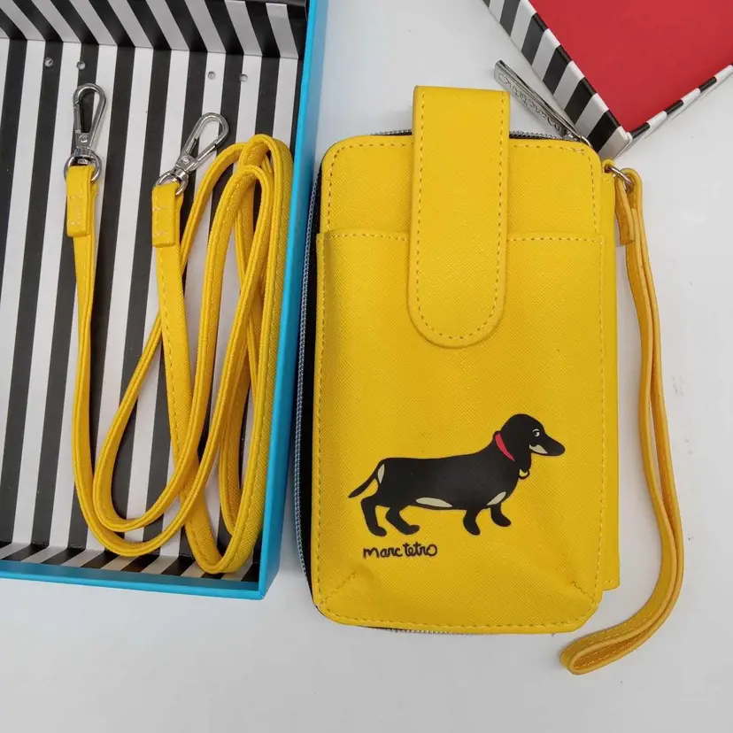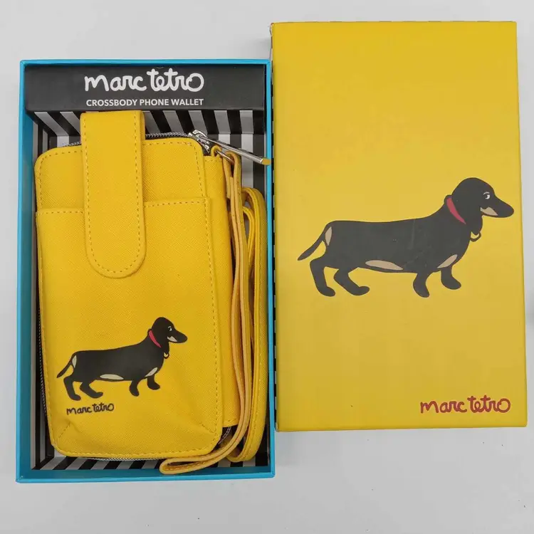 Here's a new in box Crossbody phone wallet. It's made by Marc Tetro and is yellow with a standing dachshund. There's a pocket for your phone with a snap, and a zippered bit for cash and cards. It comes with a crossbody strap and a wrist strap. It's 7.5x 4.5 inches.