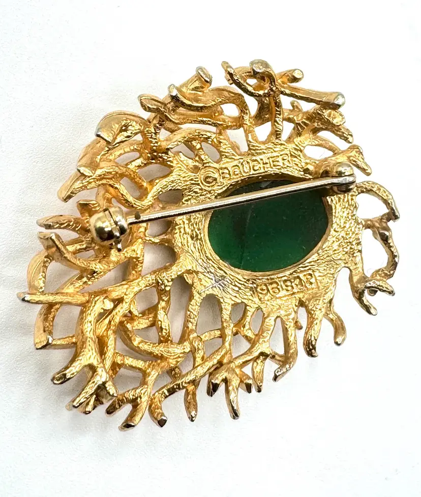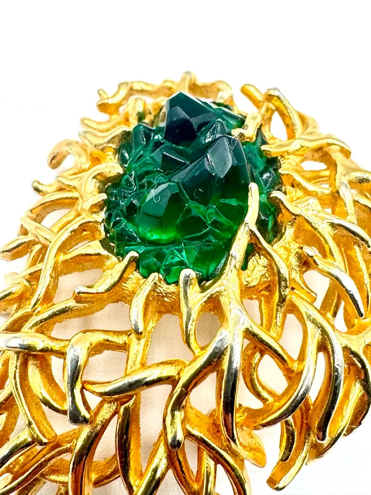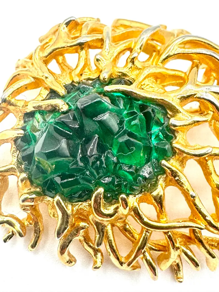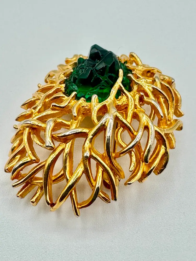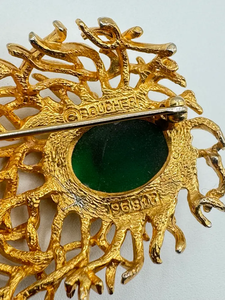 This is a stunning Marcel Boucher brooch that features a sea anemone design in goldtone with green glass stones. The piece is signed and numbered, making it a rare find for collectors. The vintage brooch is in very good condition and is sure to add a touch of elegance to any outfit. The multi-tone gold plated metal and green glass material make for a striking combination. Ideal for fashion-conscious women, this brooch is a must-have for anyone looking to make a statement.
