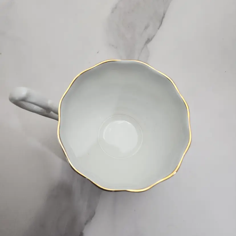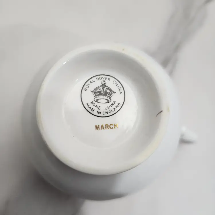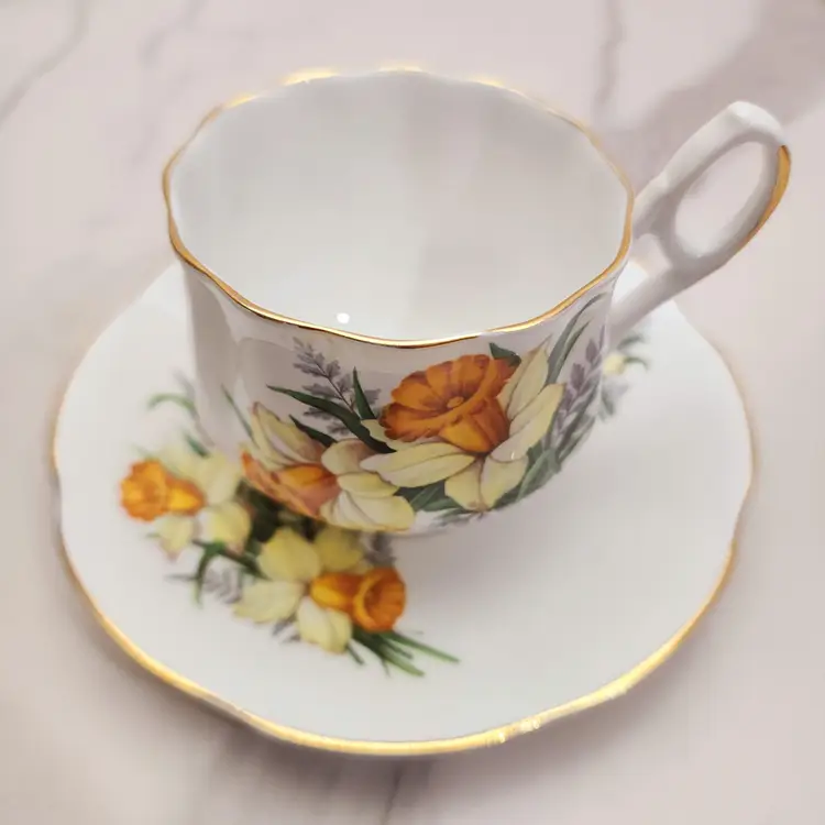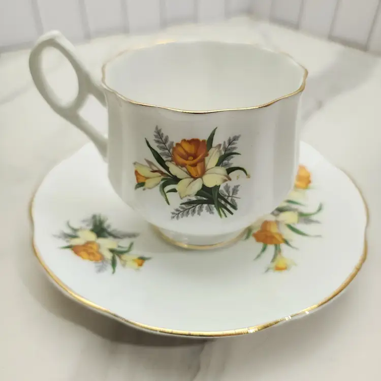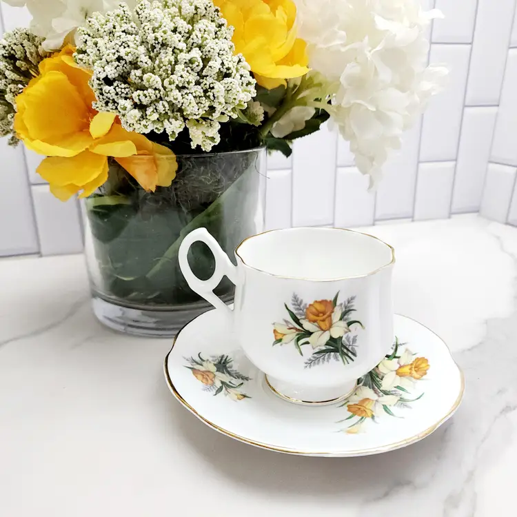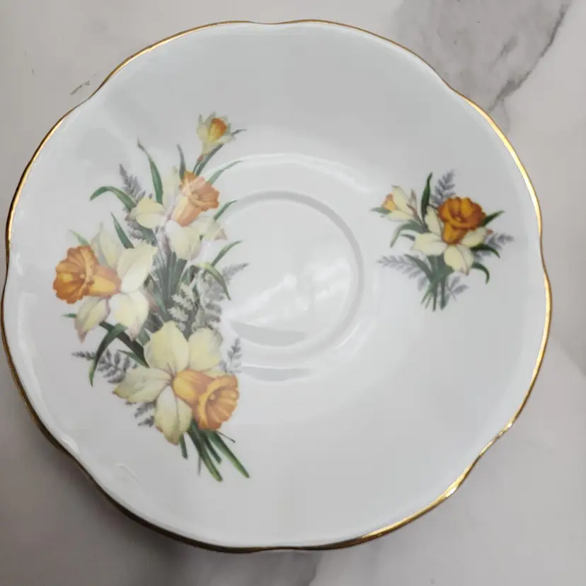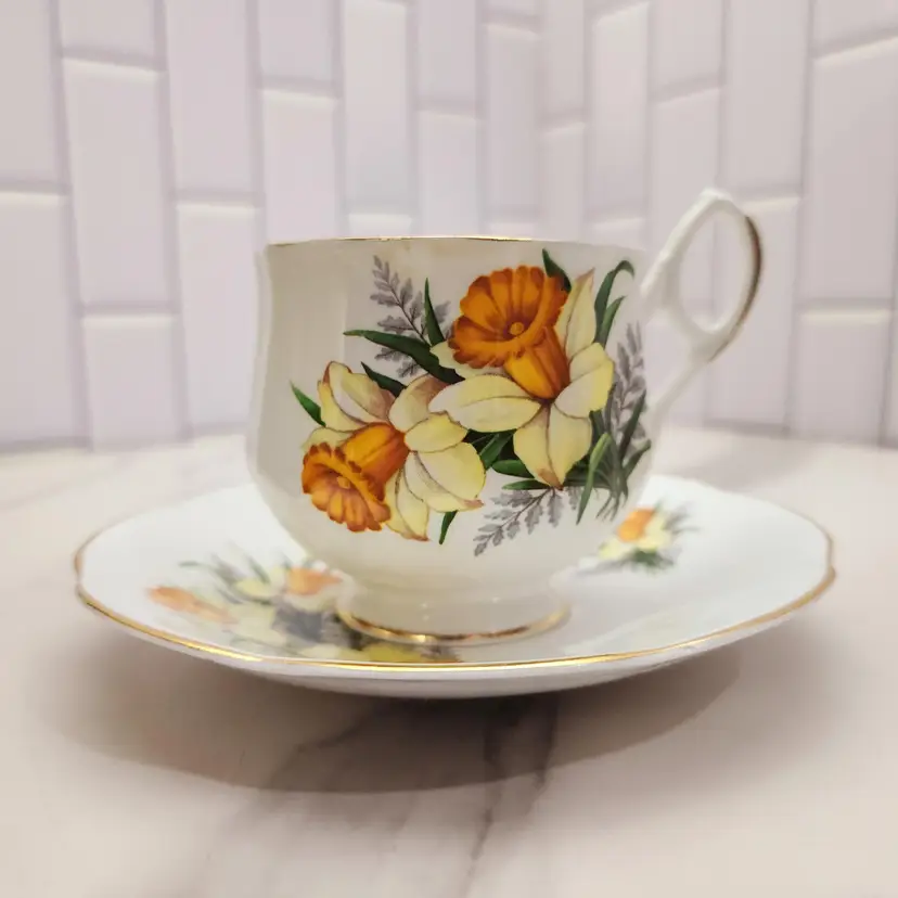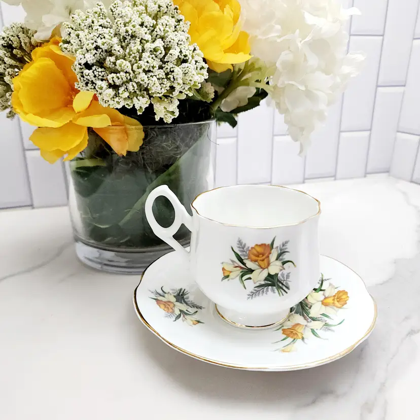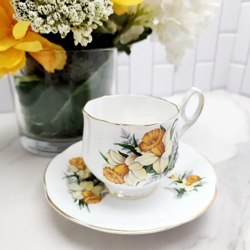Elegant Footed Cup & Saucer. Decorated with Daffodils the flowers of March & Gold trim.