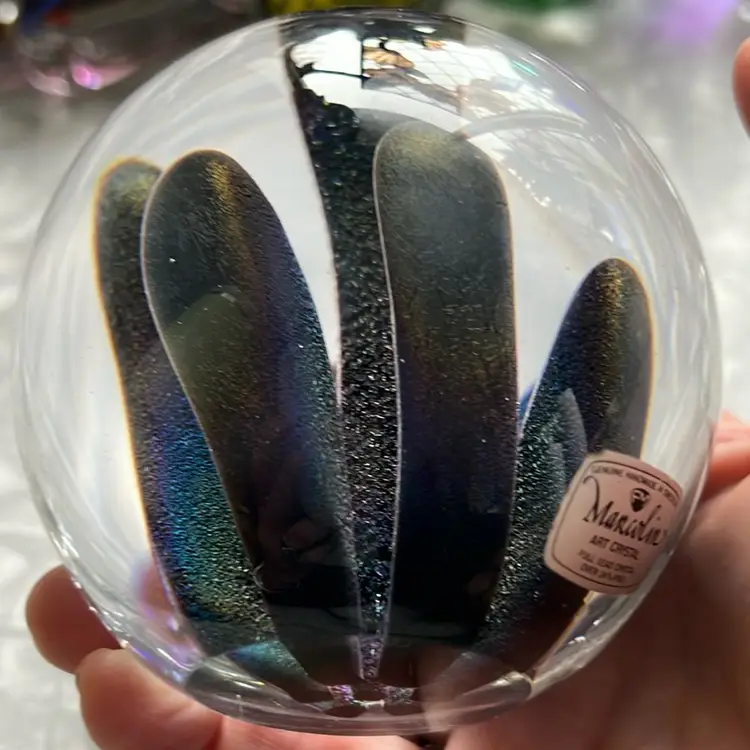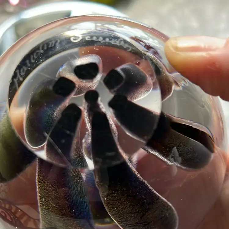 This piece is mesmerizing- it appears to have black “fingers” inside however, they all have a beautiful dichroic colors swirling throughout. This is a larger paperweight- almost 4” round. It is etch signed and numbered with the original sticker. Place this on a light disk and prepare to be entertained.