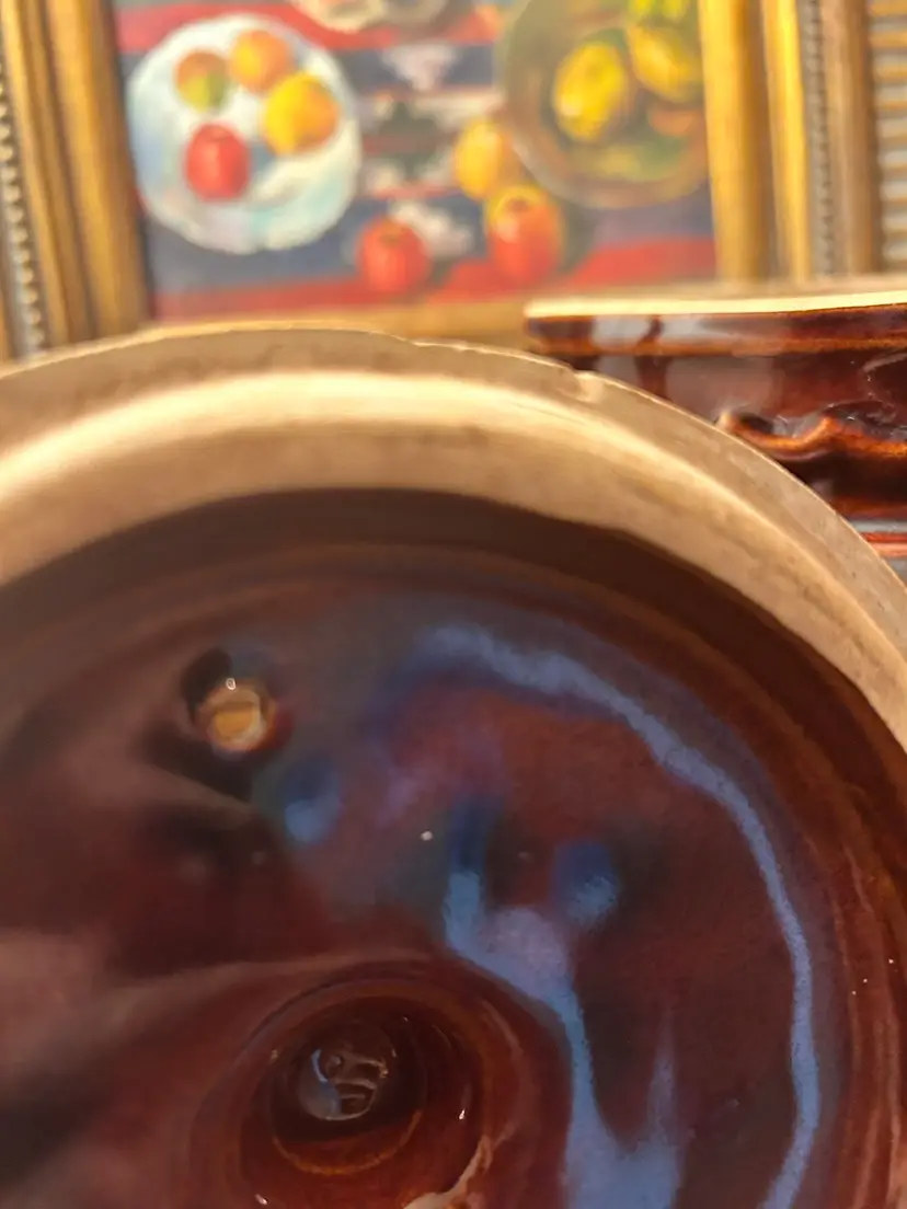Vintage Mar-Crest bean crock / pot with lid in the pattern “Daisy and Dots “. This pieces was made by Western Stoneware in the 1950s and the color is called Colorado Brown. The pattern consist of five pattern daisies embossed along with a wave pattern debossed. The lid has a venting hole to let out steam. The height is approximately 7 inches tall. The width at the mouth of the jar or pie is 5.5 inches. The width including the two handles it approximately 8.5 inches. This is a very nice preowned condition with no known chips, cracks, or crazing.
