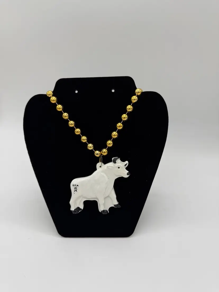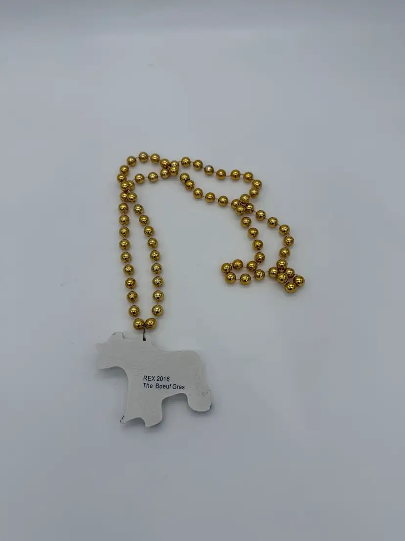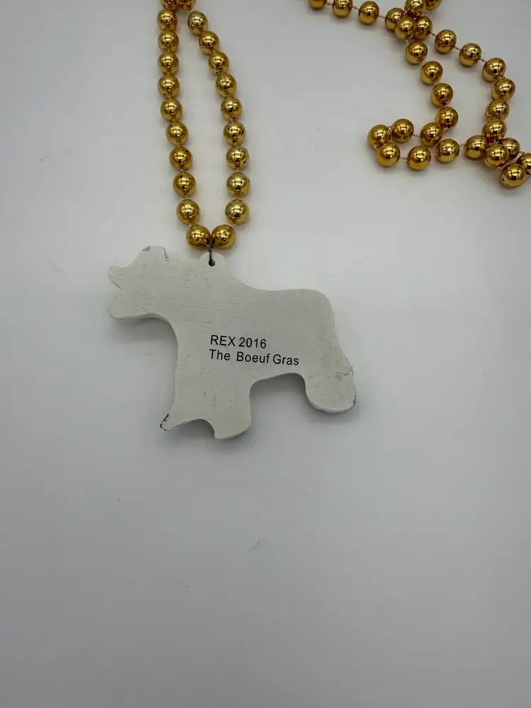 The Mardi Grad 2016 "The Boeuf Gras" Polystone Medallion Gold Beaded Necklace features a unique pendant in the shape of a bull, 3-1/4” x 3-1/4” perfect for celebrating Mardi Gras. Made from plastic and polystone clay, the necklace has a gold color and a round main stone shape. With a necklace length of 34 inches and a main stone width of 8mm, this beaded necklace is stackable and has an endless closure. The medallion design and Mardi Gras theme make it a stylish and festive accessory for any occasion.