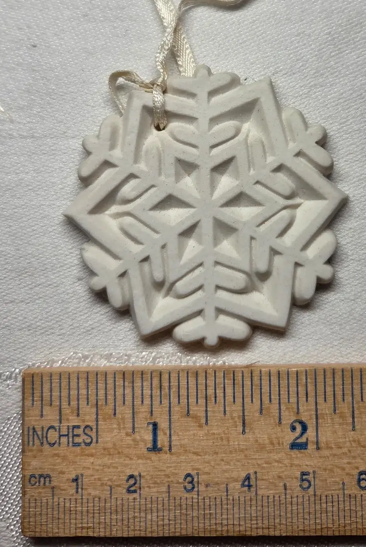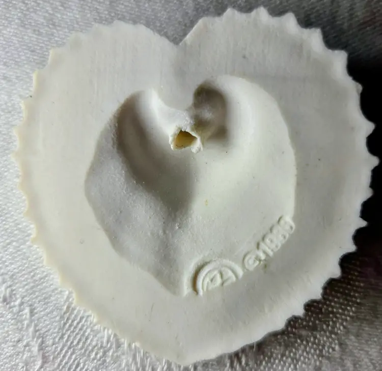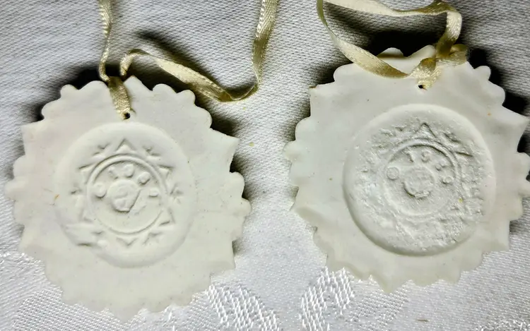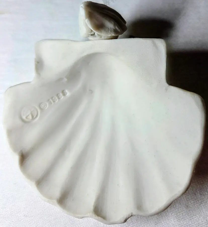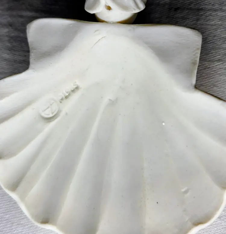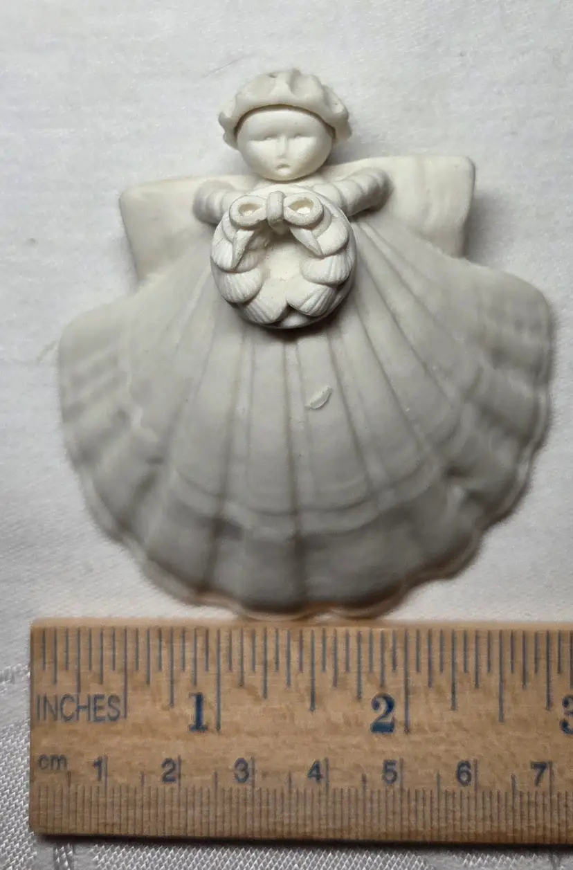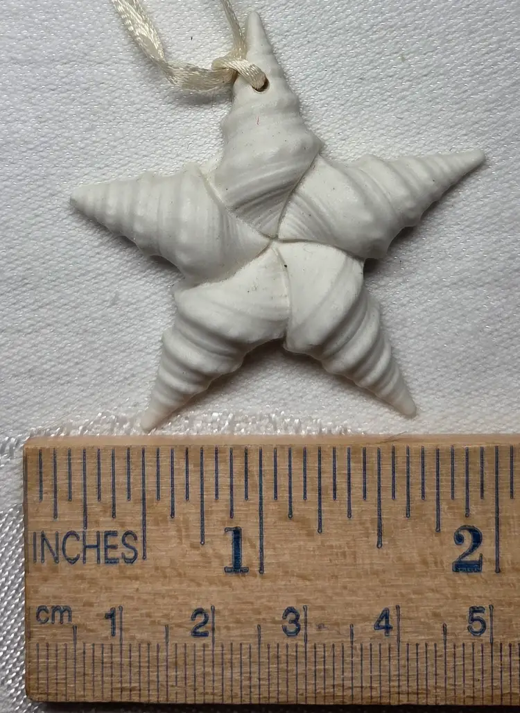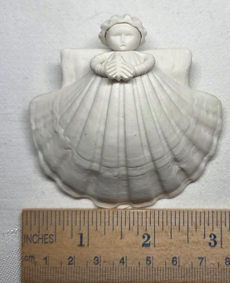This lot of 7 Margaret Furlong Shell Angel Christmas ornaments from the 1980s features a shabby chic style with a sea shell shape design. The decorative ornaments are made of porcelain and showcase a white color with a Christmas theme. Each ornament is handcrafted in California using art pottery techniques, making them a vintage collectible for holiday enthusiasts. The set includes star and snowflake patterns, a heart and Angles adding a festive touch to any Christmas decor.