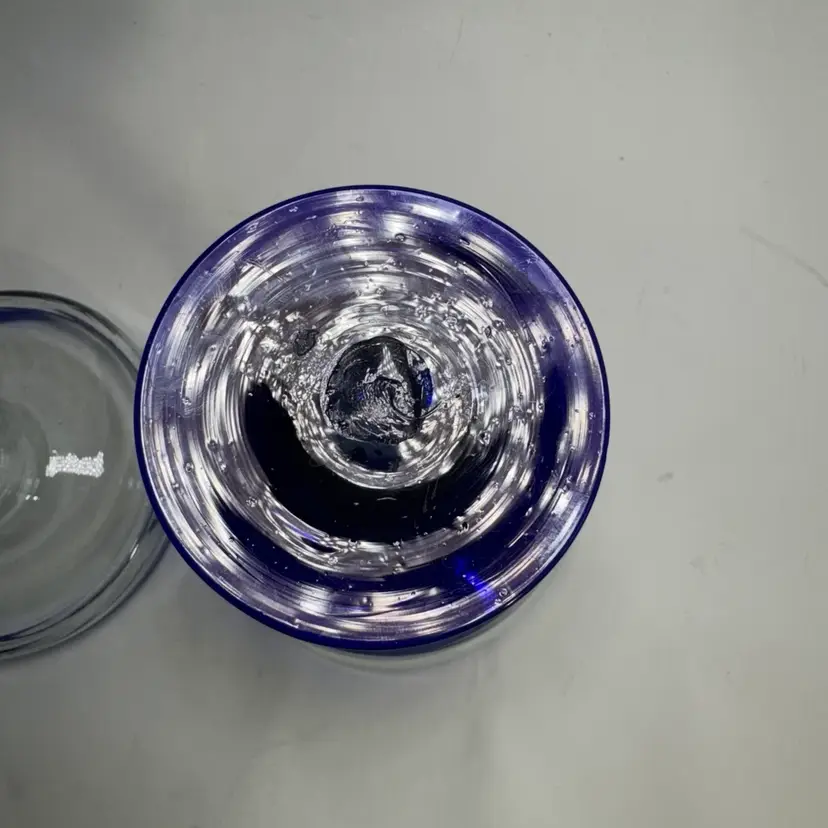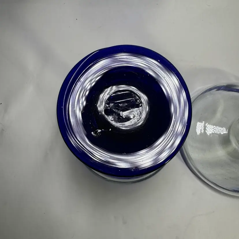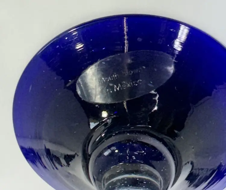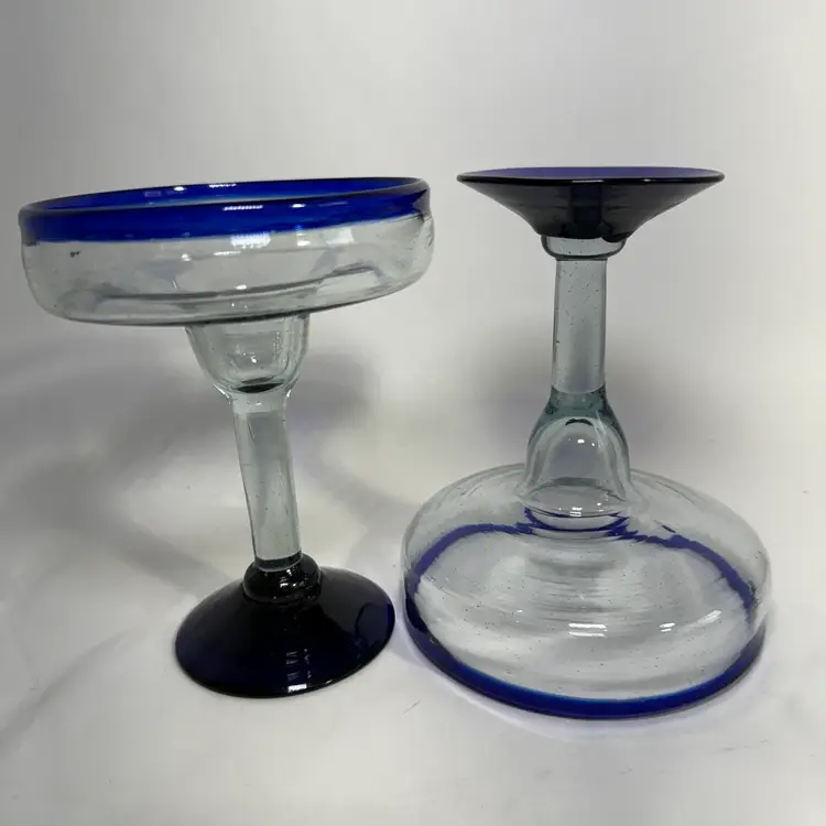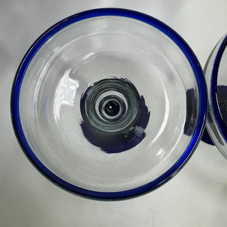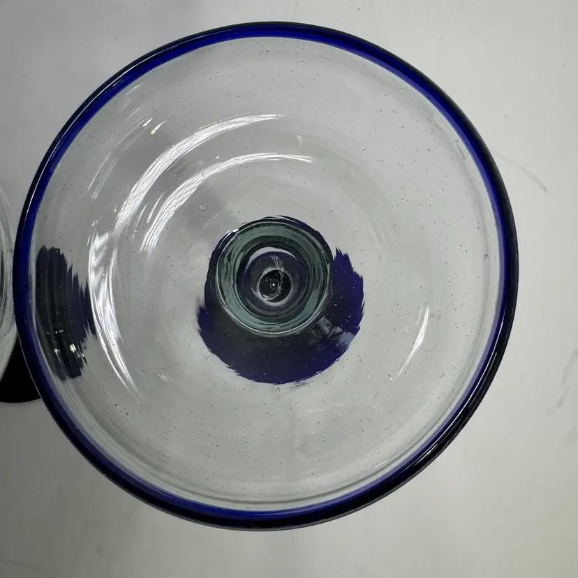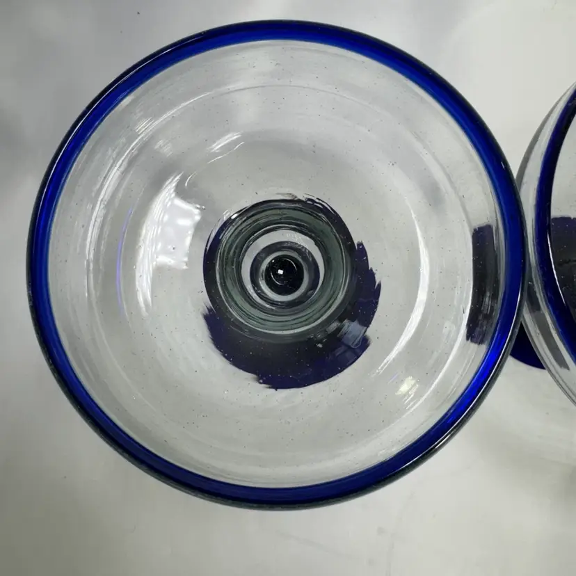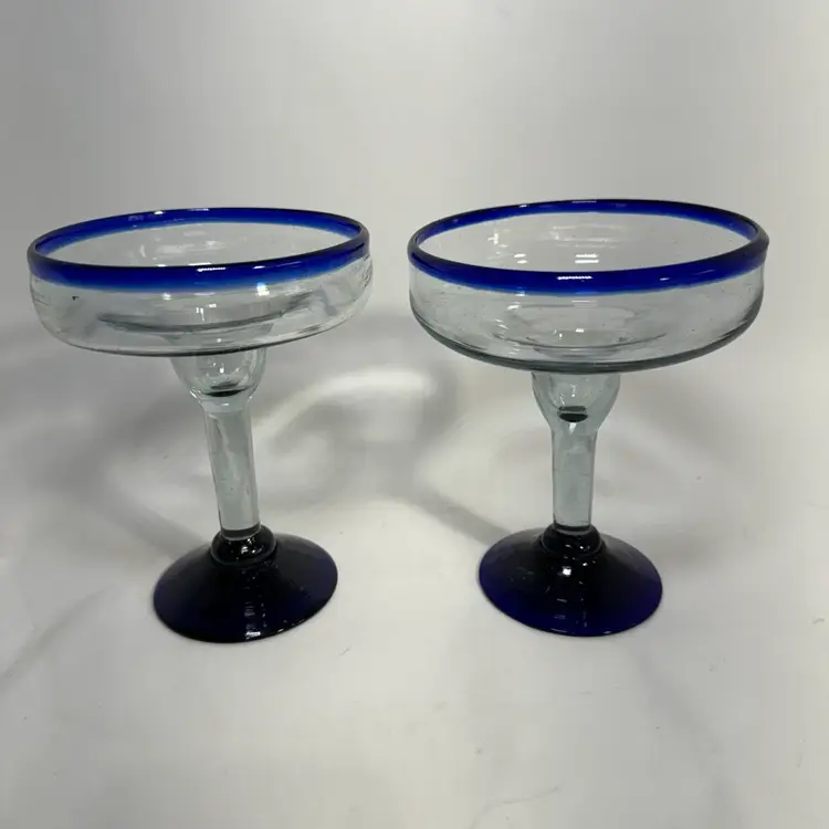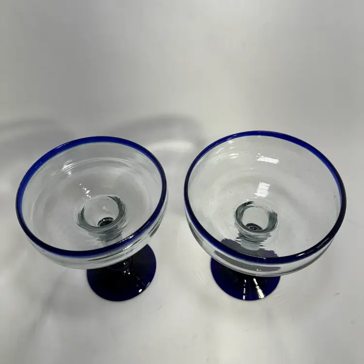 Blue Rim Margarita Glasses, Set of Two (2), with traditional blue rim and base. Hand blown by artisans in area around Guadalajara, Mexico. Because each glass is an expression of the artisan's individuality and creativity, no two are exactly alike.