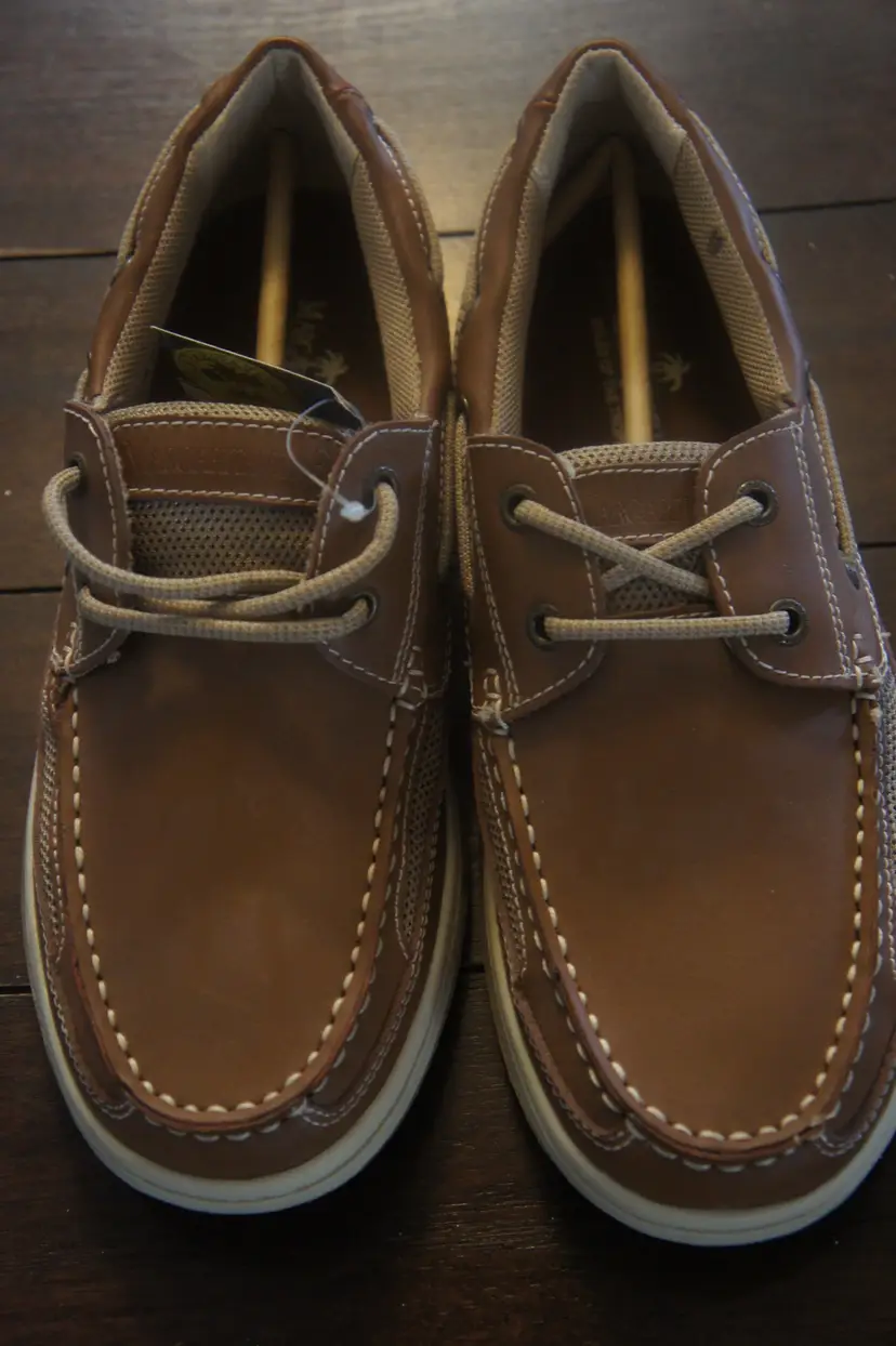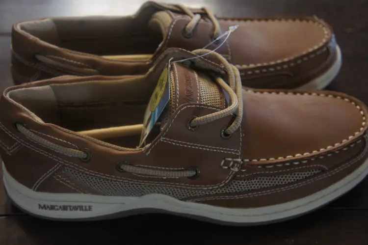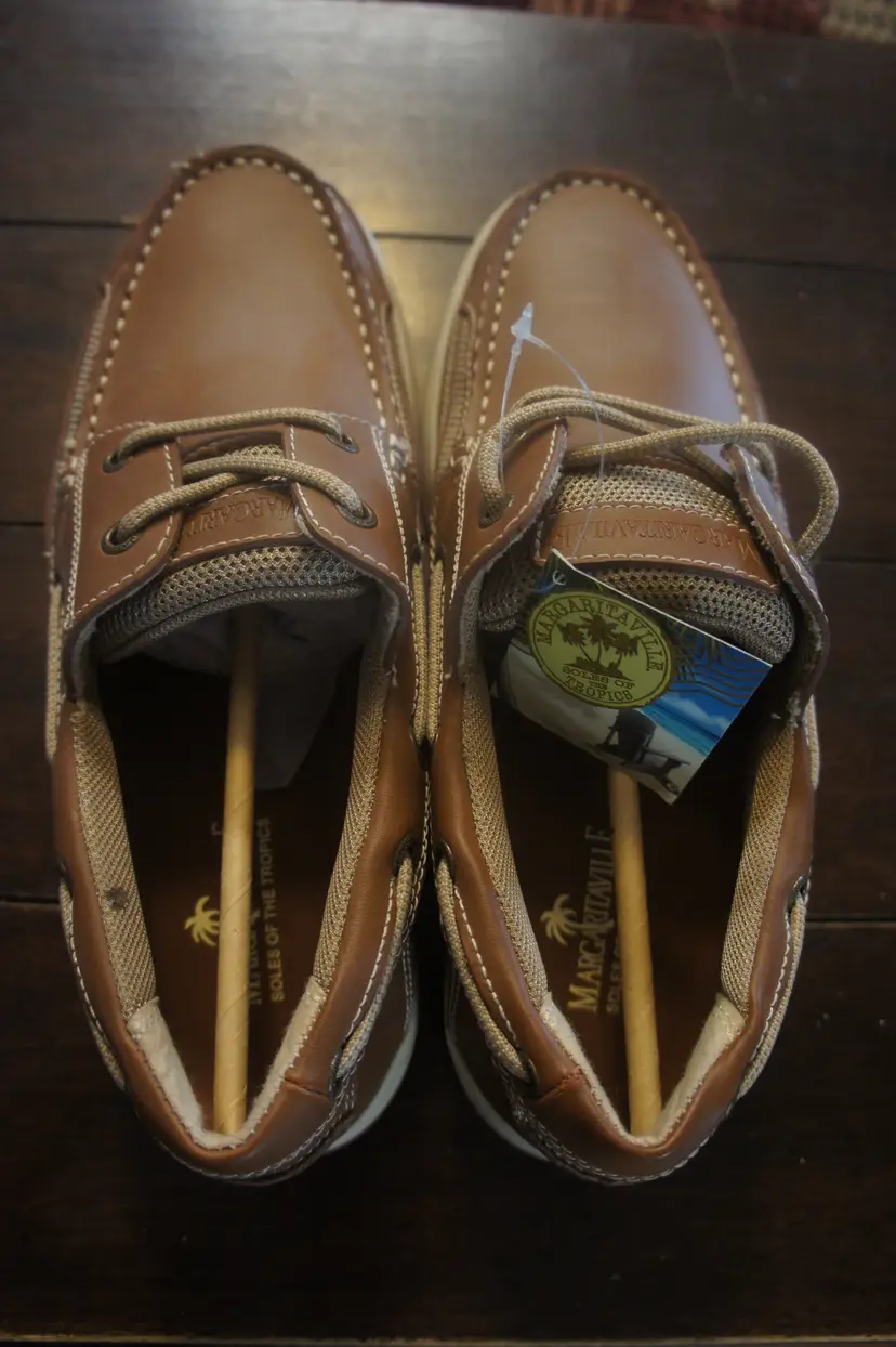Listed is a pair of Margaritaville 'Soles of the Tropics' Men size 9 dress boat shoes Brand new with tags, SUPER HIGH QUALITY upper leather and stitching. Unique trademark anchor inlay design on soles. Neutral color goes with all attire. Thanks for lookin'.