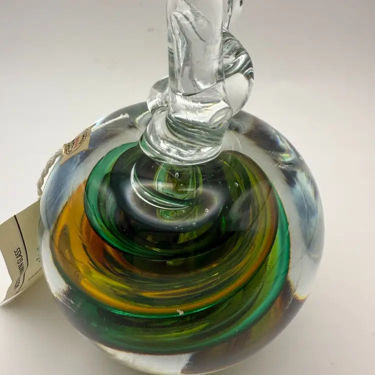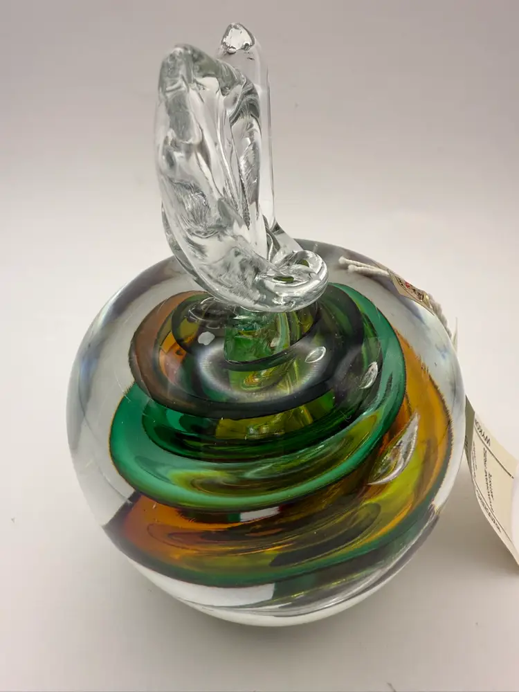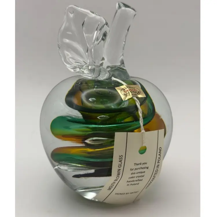 Center color swirls 24% lead crystal mouth blown Apple paperweight signed MP for Marian Pyrcak Poland New condition with original sticker 5” tall