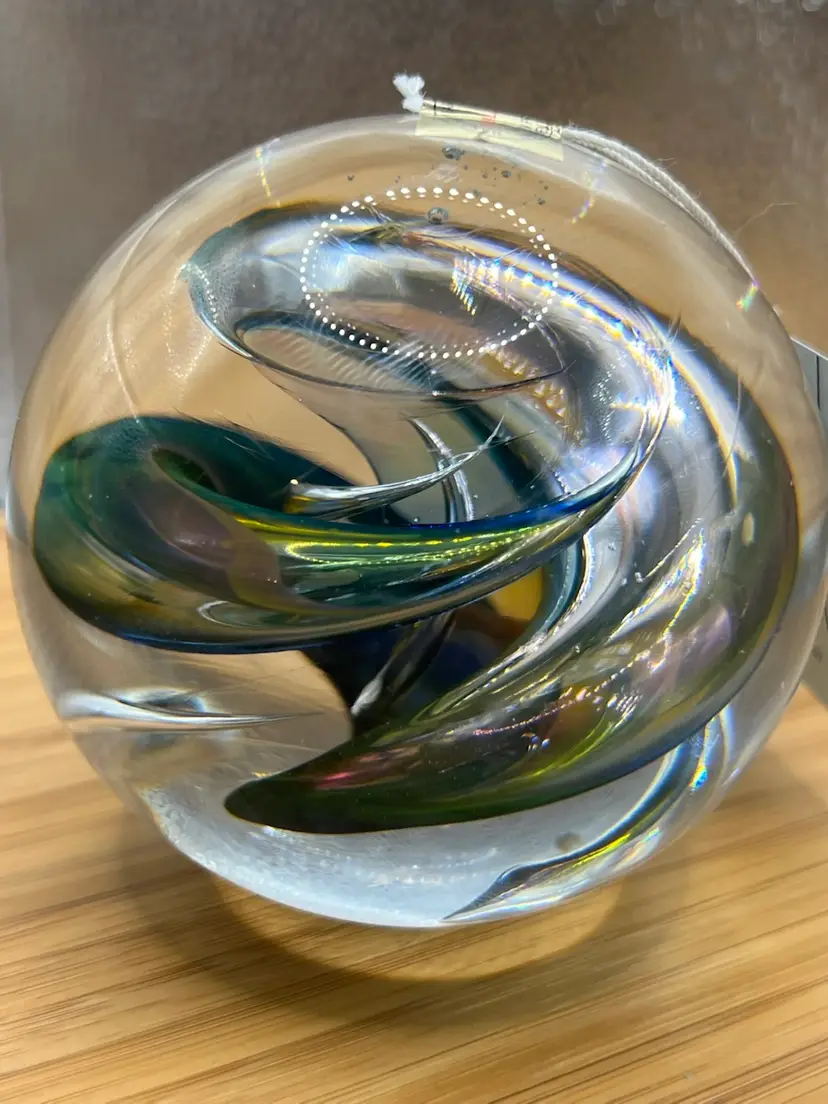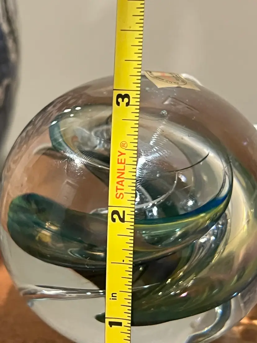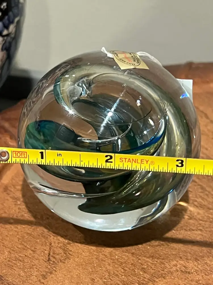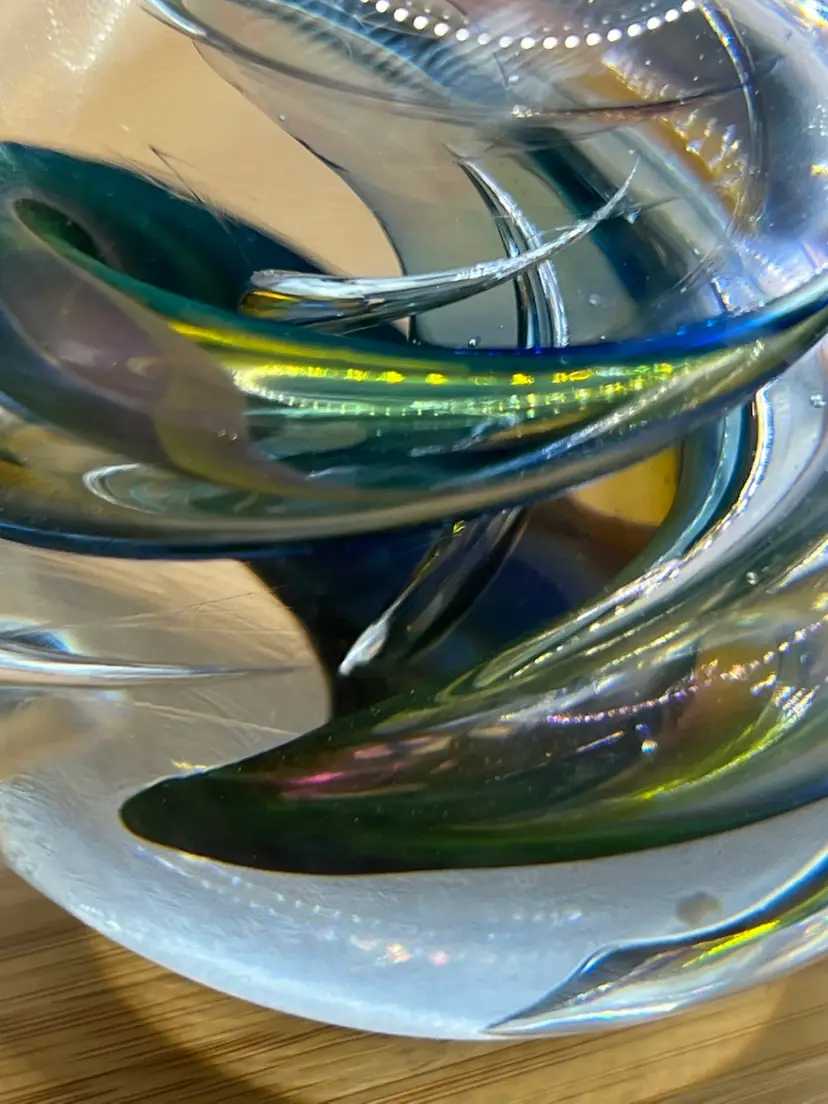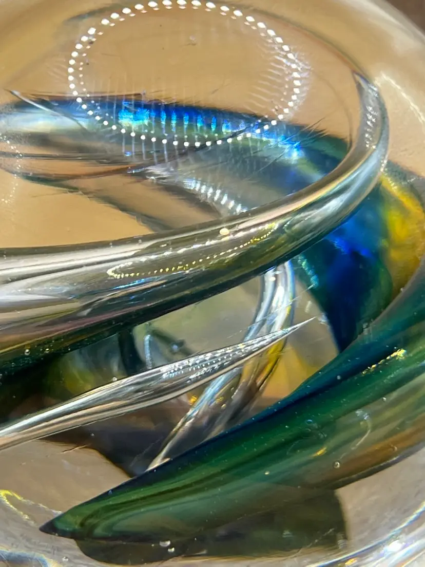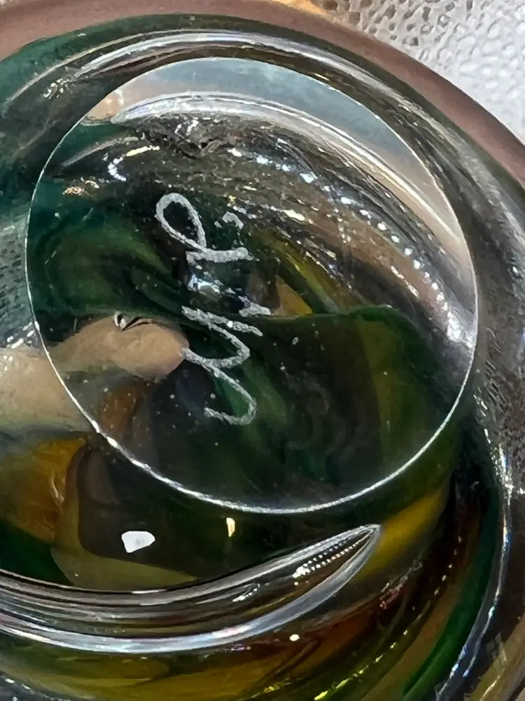 Isn’t she lovely? I love the swirl and the iridescence throughout this has a highly polished bottom with the initial of the artist MP. It is new with tags.
