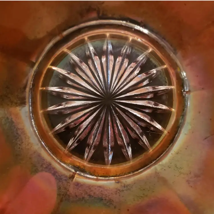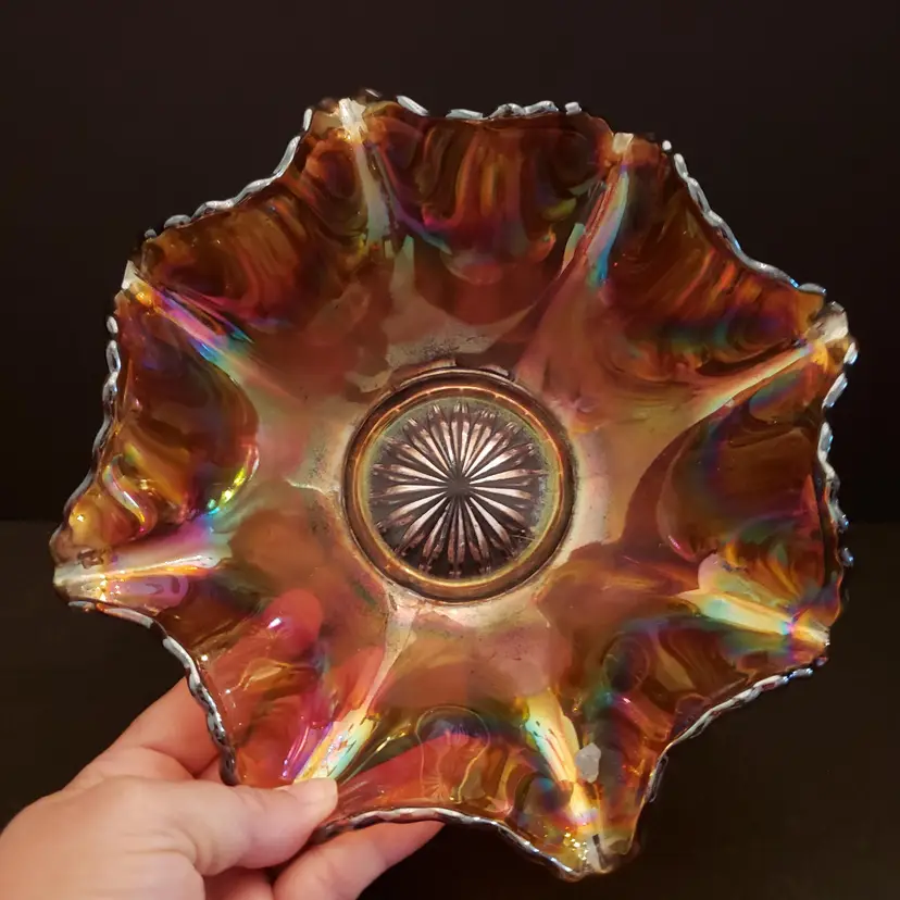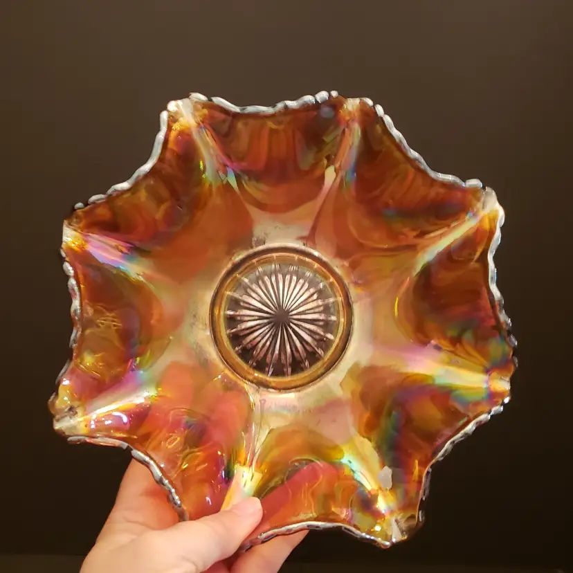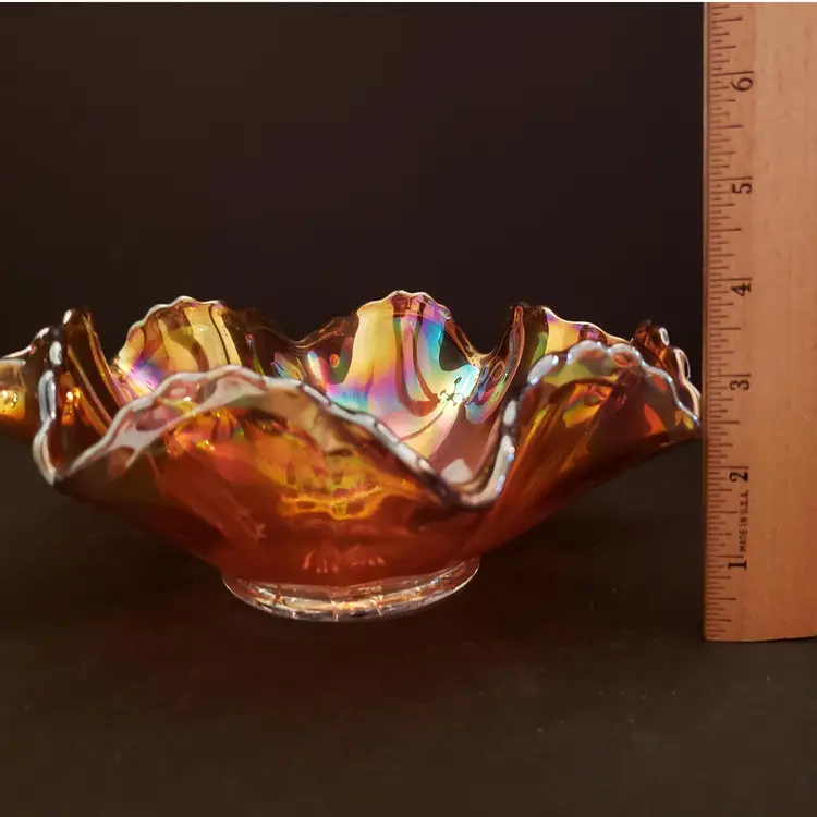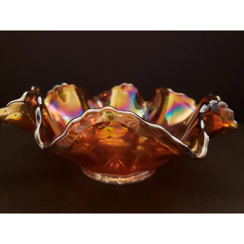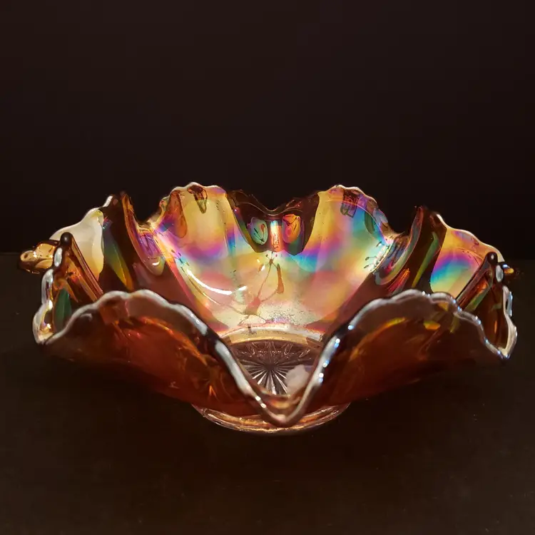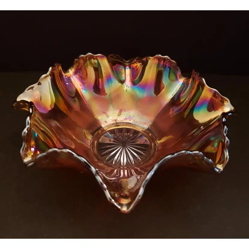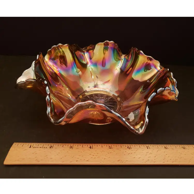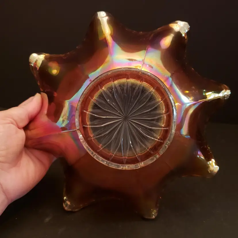 Material: Glass Color: Marigold Gold Peach Orange Description: Beautiful! Vintage marigold carnival glass bowl. Imperial “Plain Jane” with Serrated edge, ruffled edges. Star Base, clear translucent. 9 inches wide, 4 inches tall with 8 panels, 8 points. Unmarked.